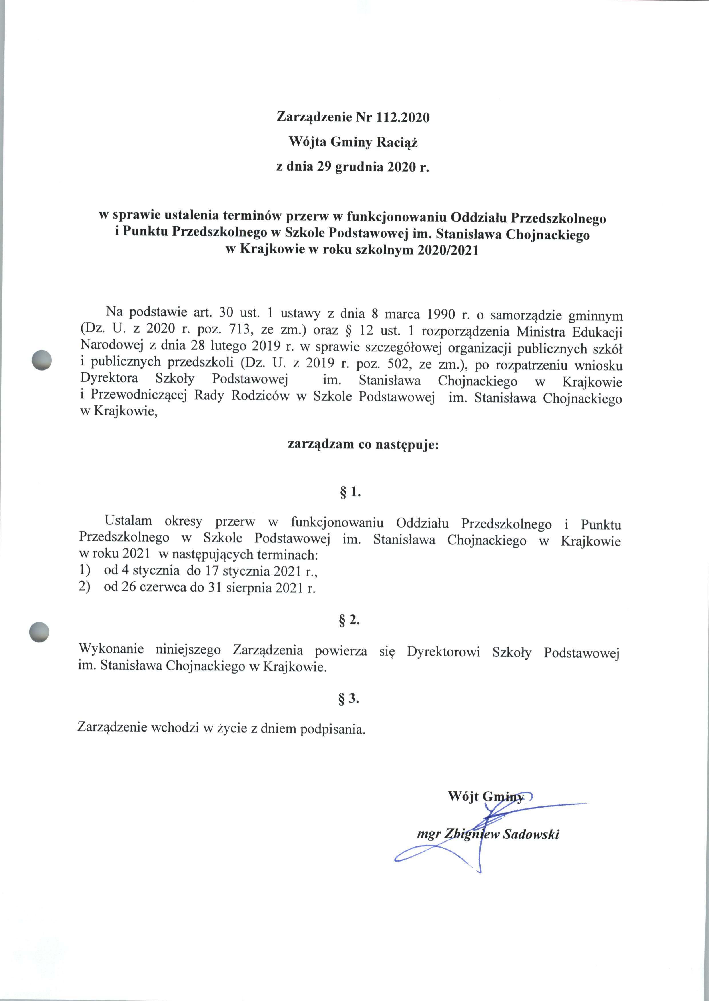 Zarządzenie Nr 112.2020 Wójta Gminy Raciąż z dnia 29 grudnia 2020 roku