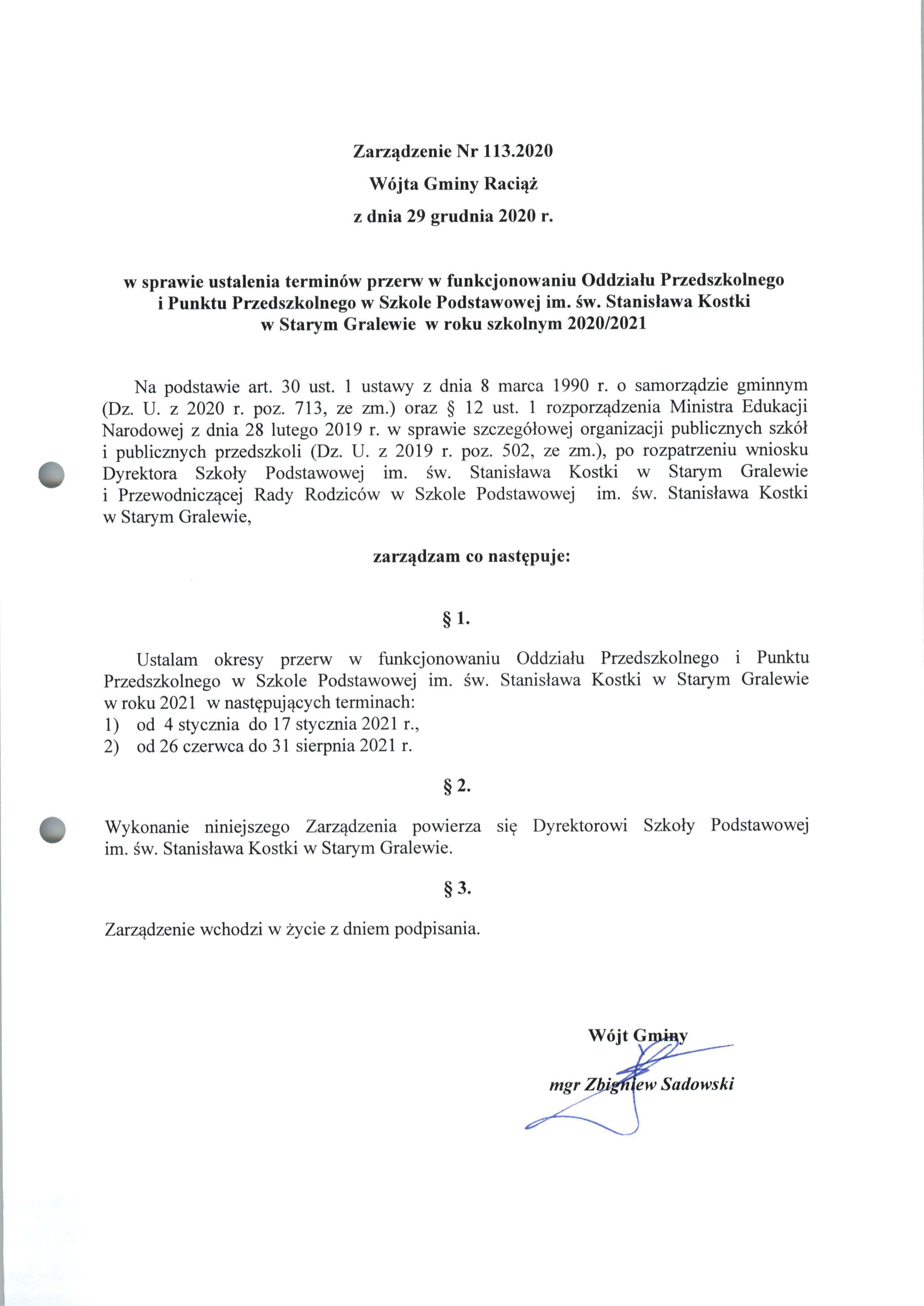 Zarządzenie Nr 113.2020 Wójta Gminy Raciąż z dnia 29 grudnia 2020 roku