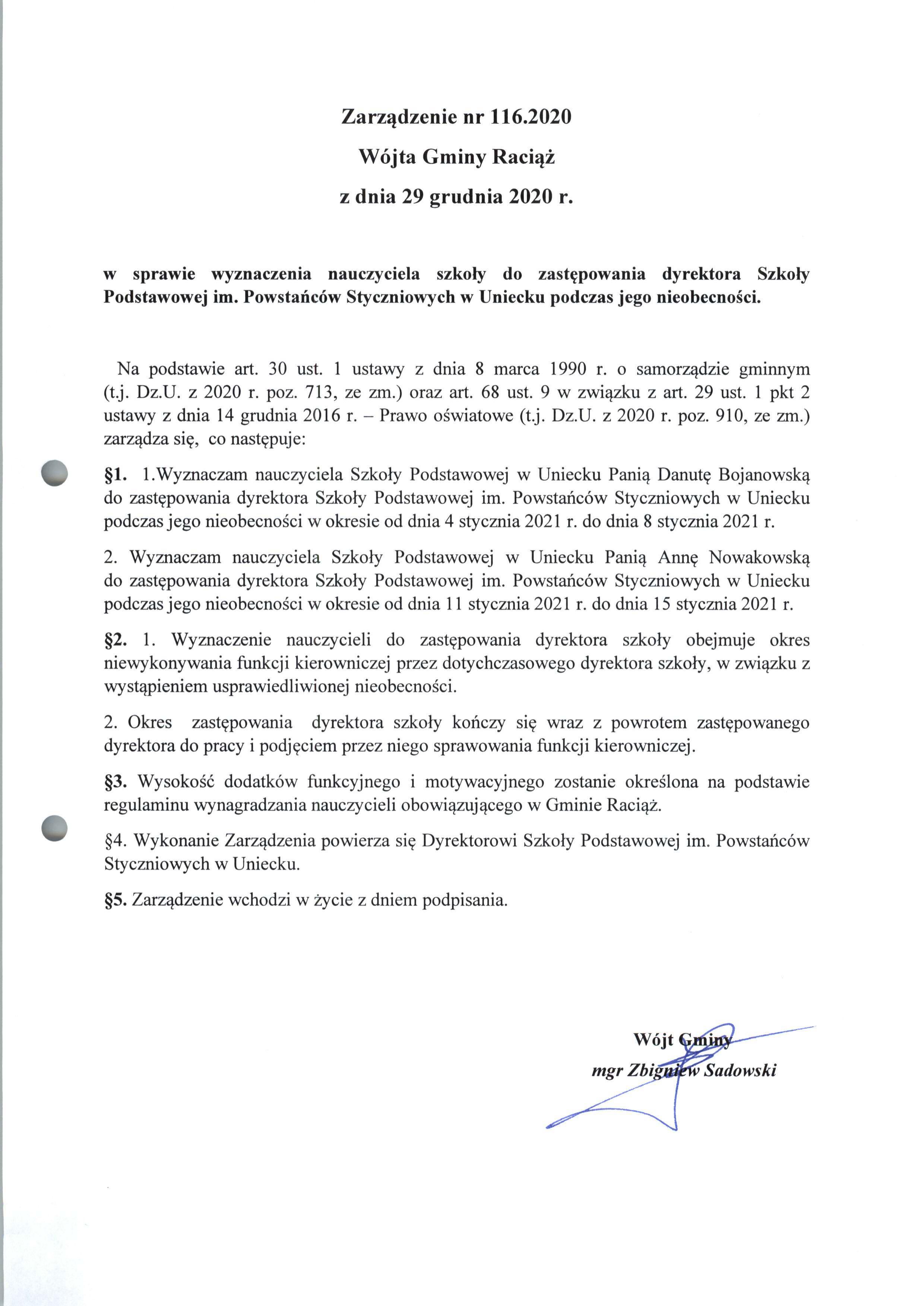 Zarządzenie Nr 116.2020 Wójta Gminy Raciąż z dnia 29 grudnia 2020 roku