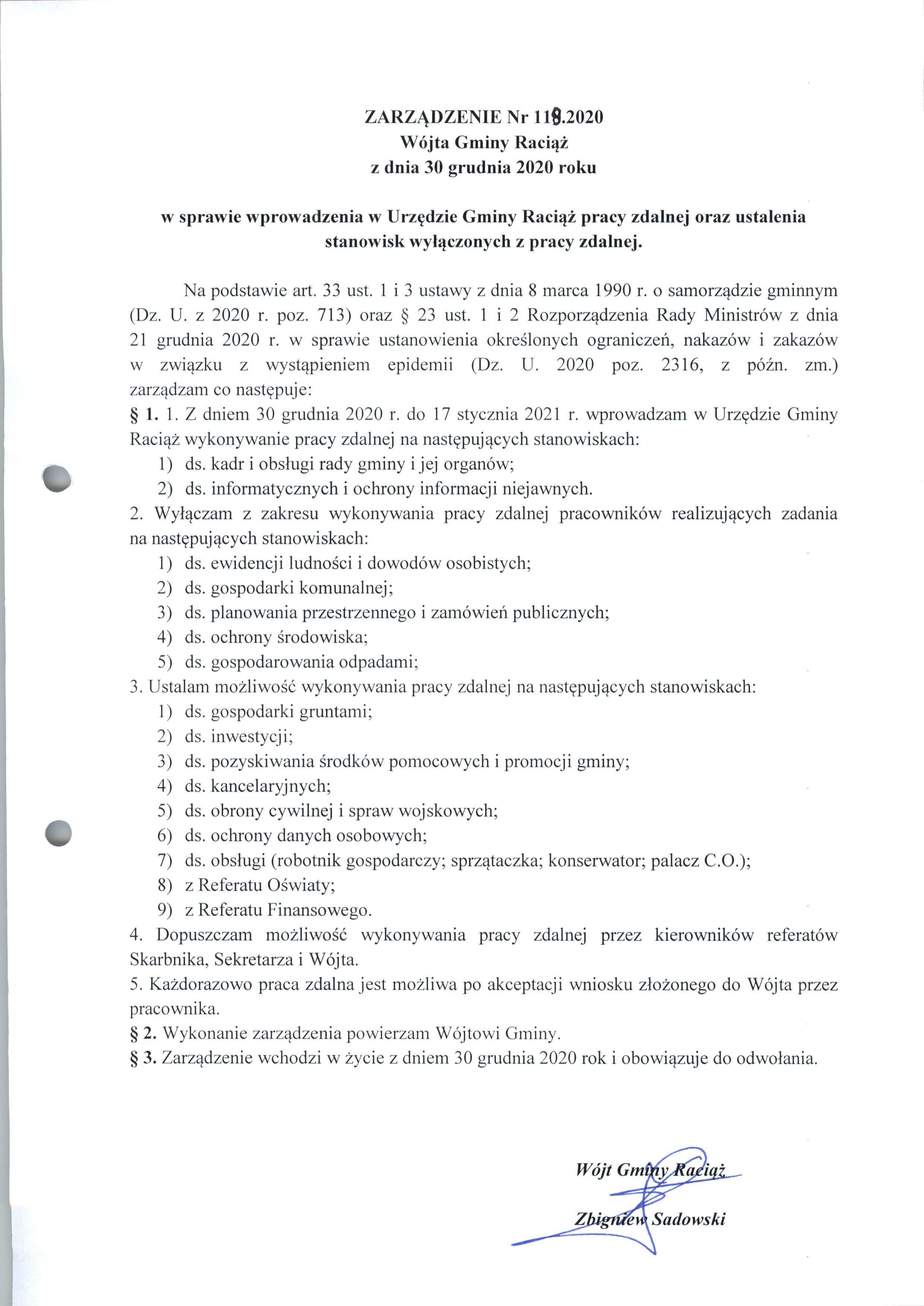 Zarządzenie Nr 119.2020 Wójta Gminy Raciąż z dnia 30 grudnia 2020 roku