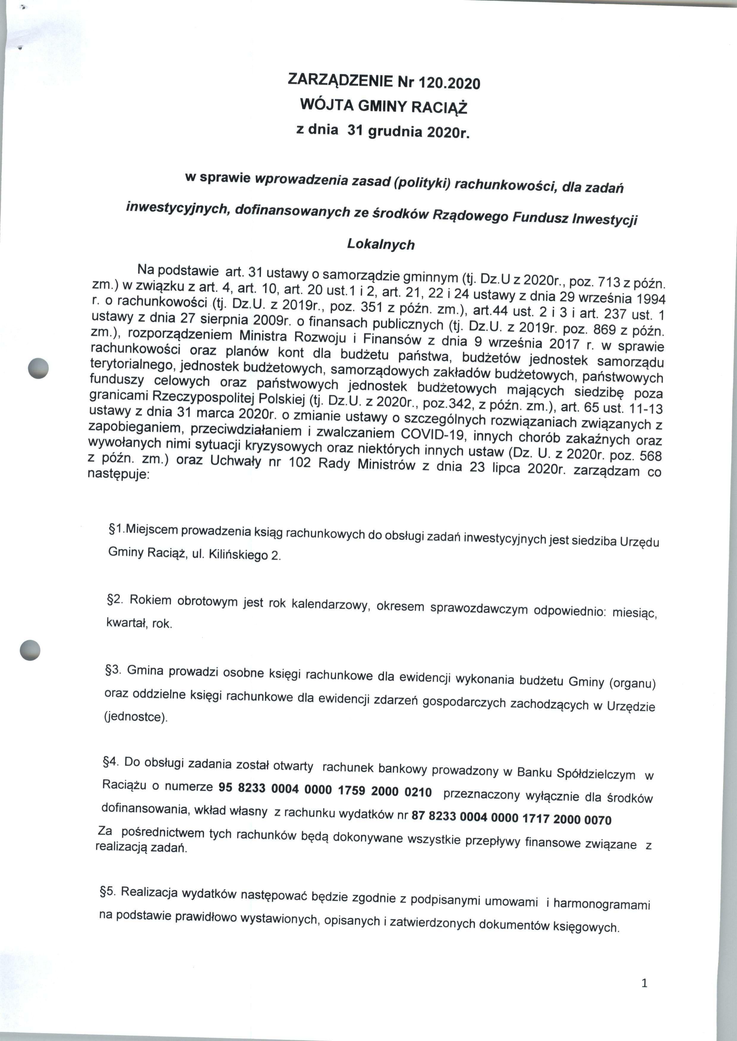 Zarządzenie Nr 120.2020 Wójta Gminy Raciąż z dnia 31 grudnia 2020 roku