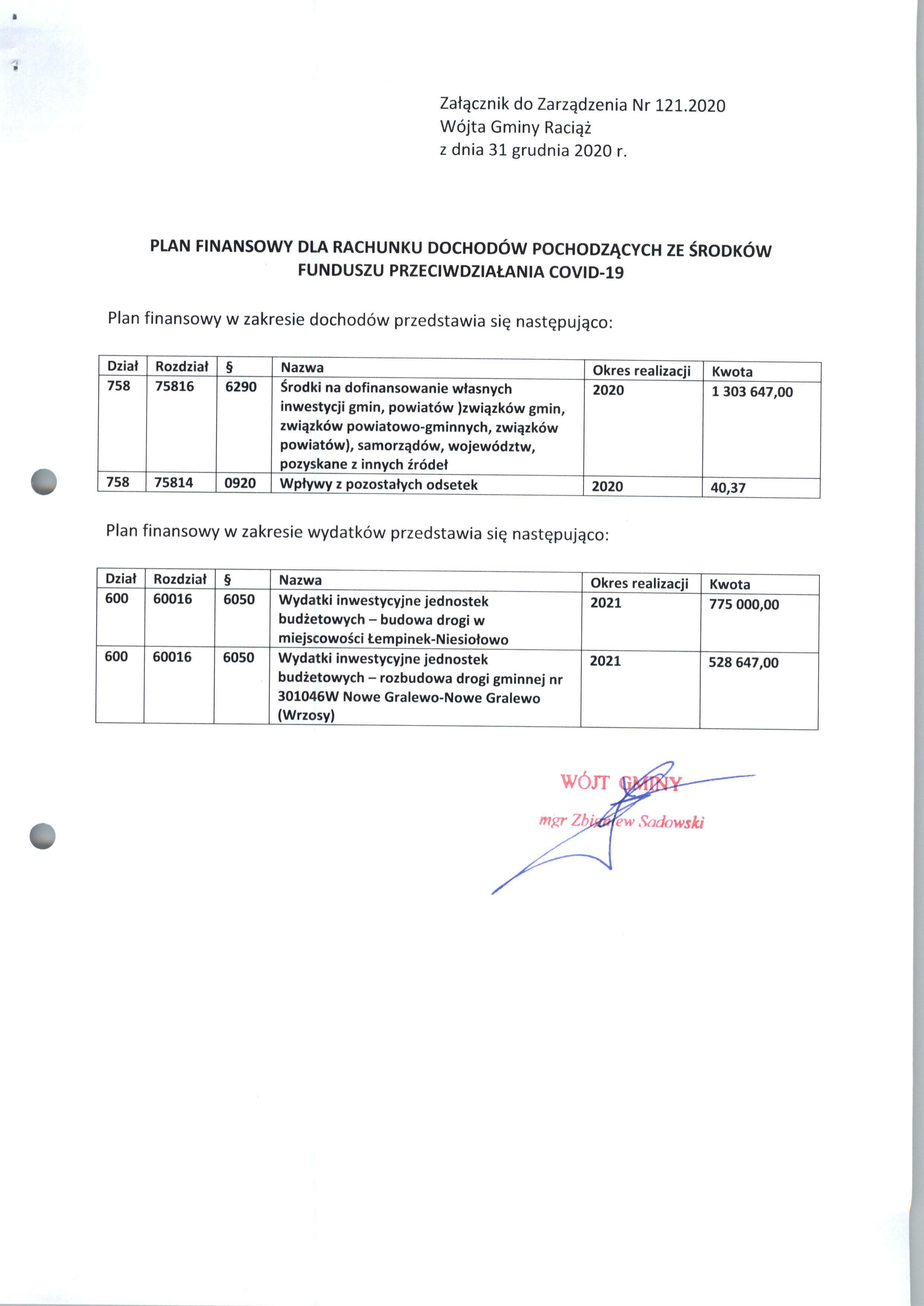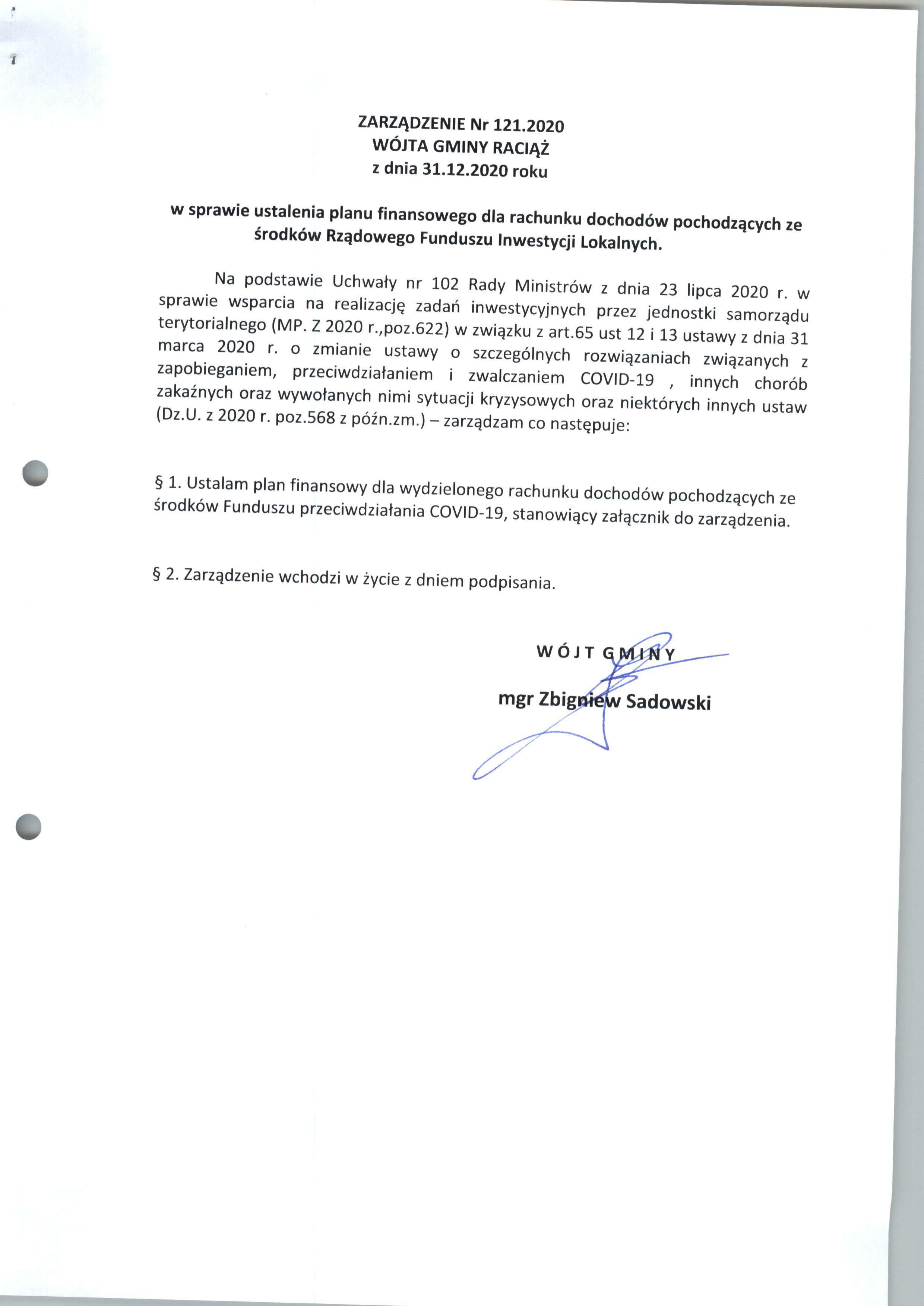 Zarządzenie Nr 121.2020 Wójta Gminy Raciąż z dnia 31 grudnia 2020 roku