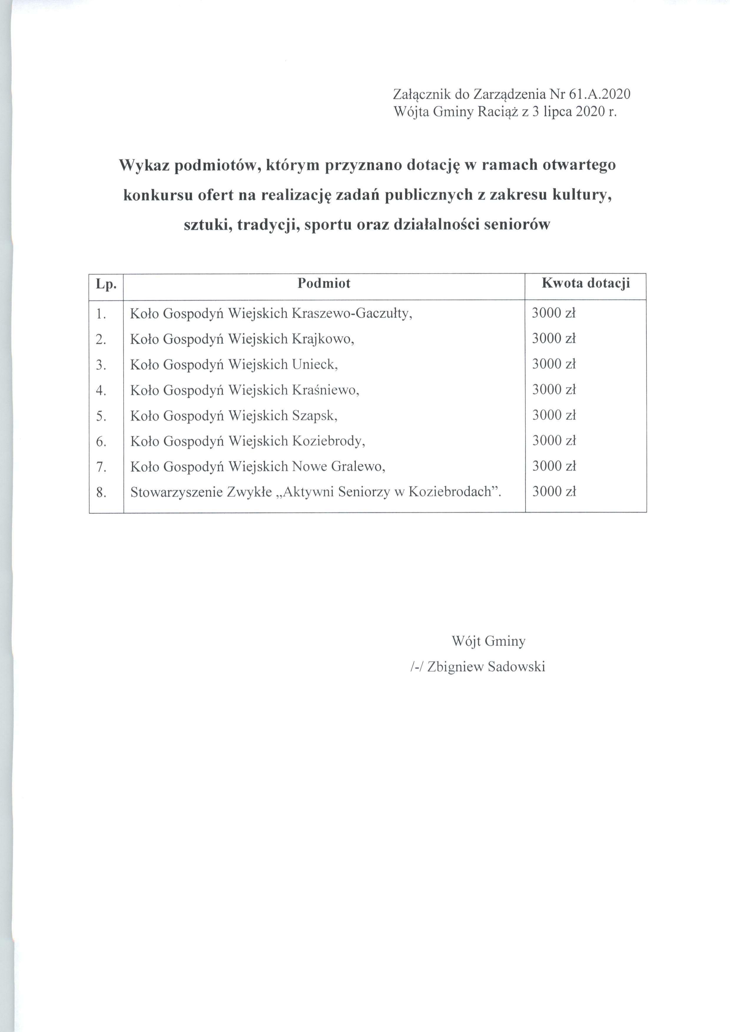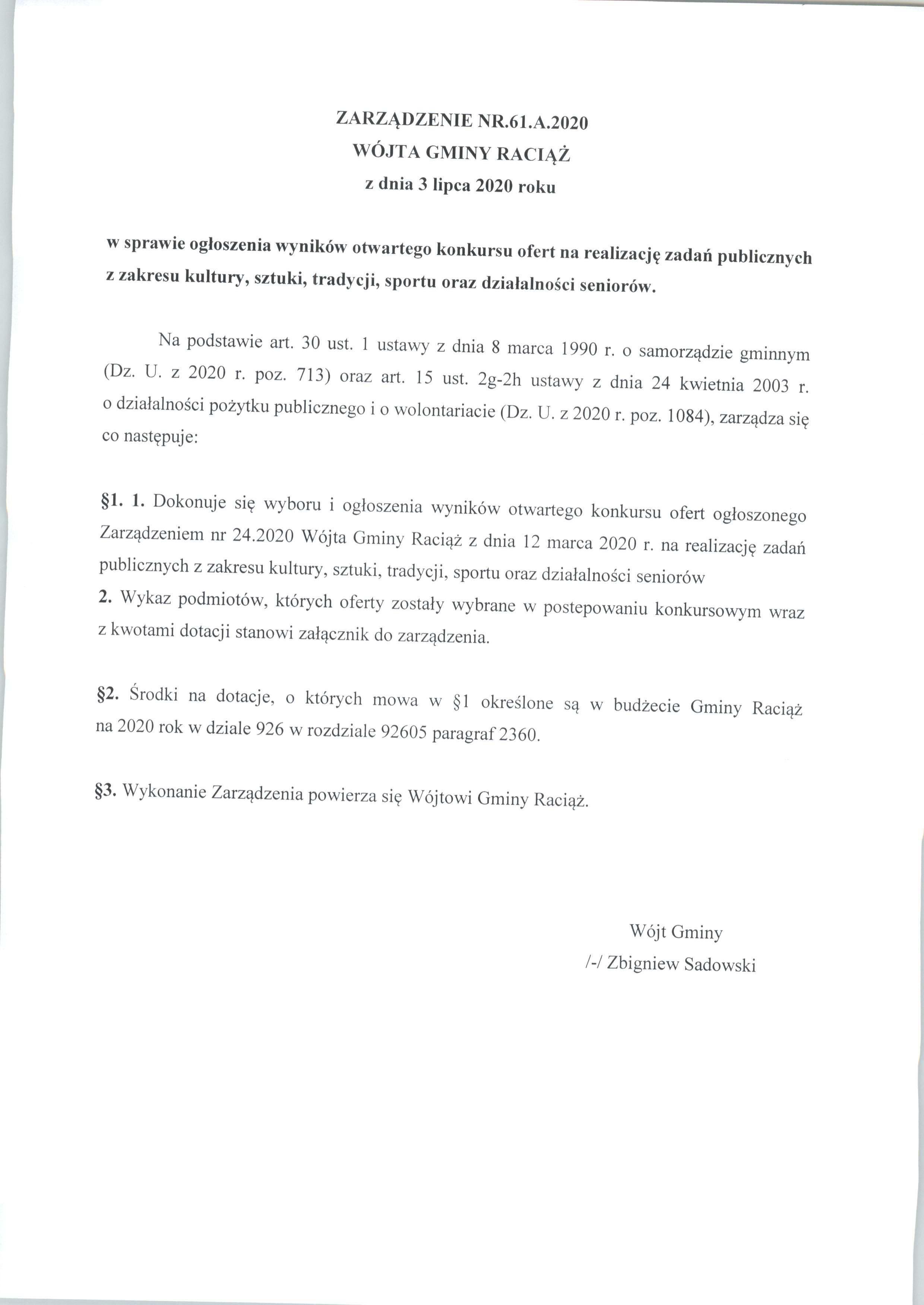 Zarządzenie Nr 61.A.2020 Wójta Gminy Raciąż z dnia 03 lipca 2020 roku