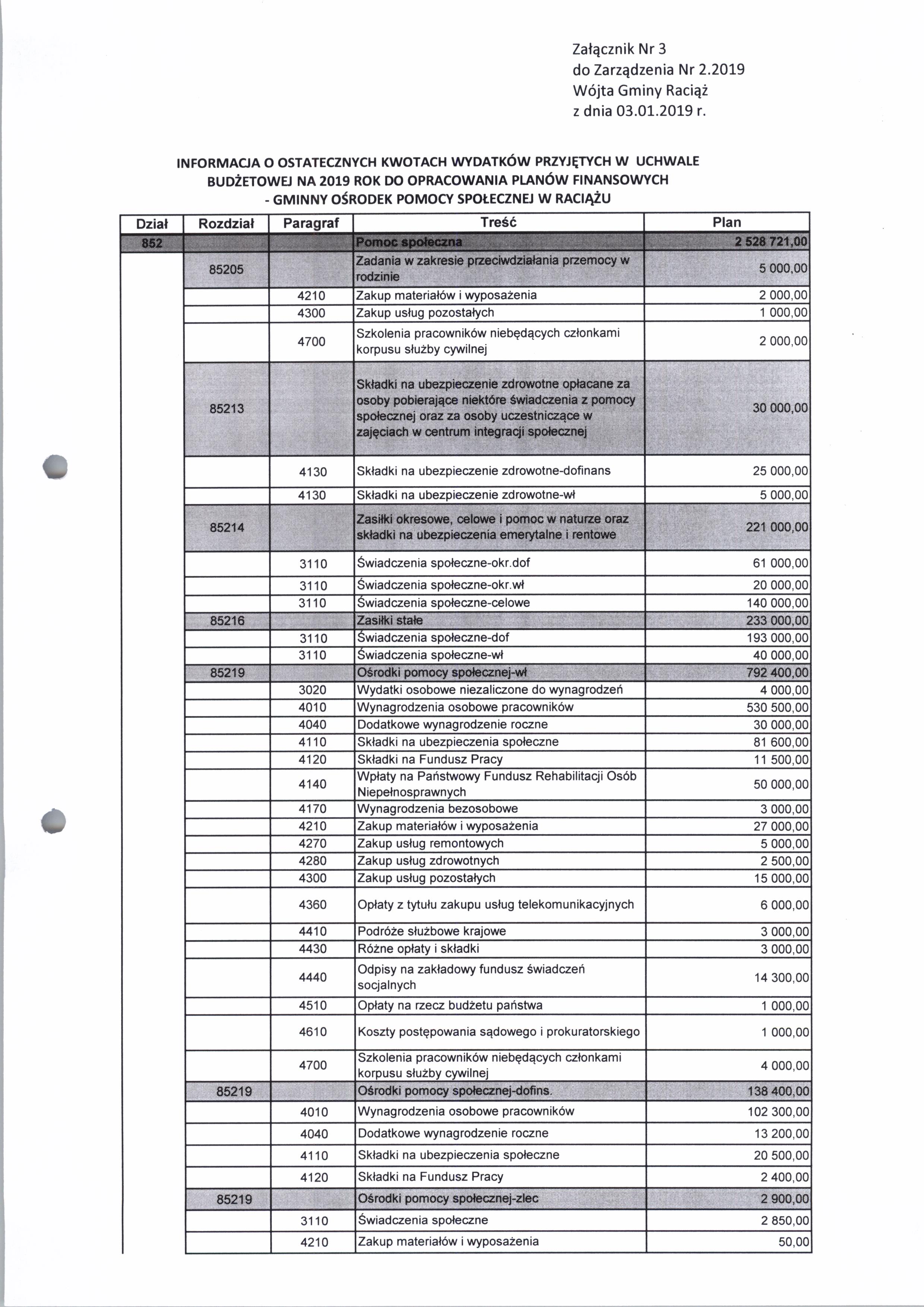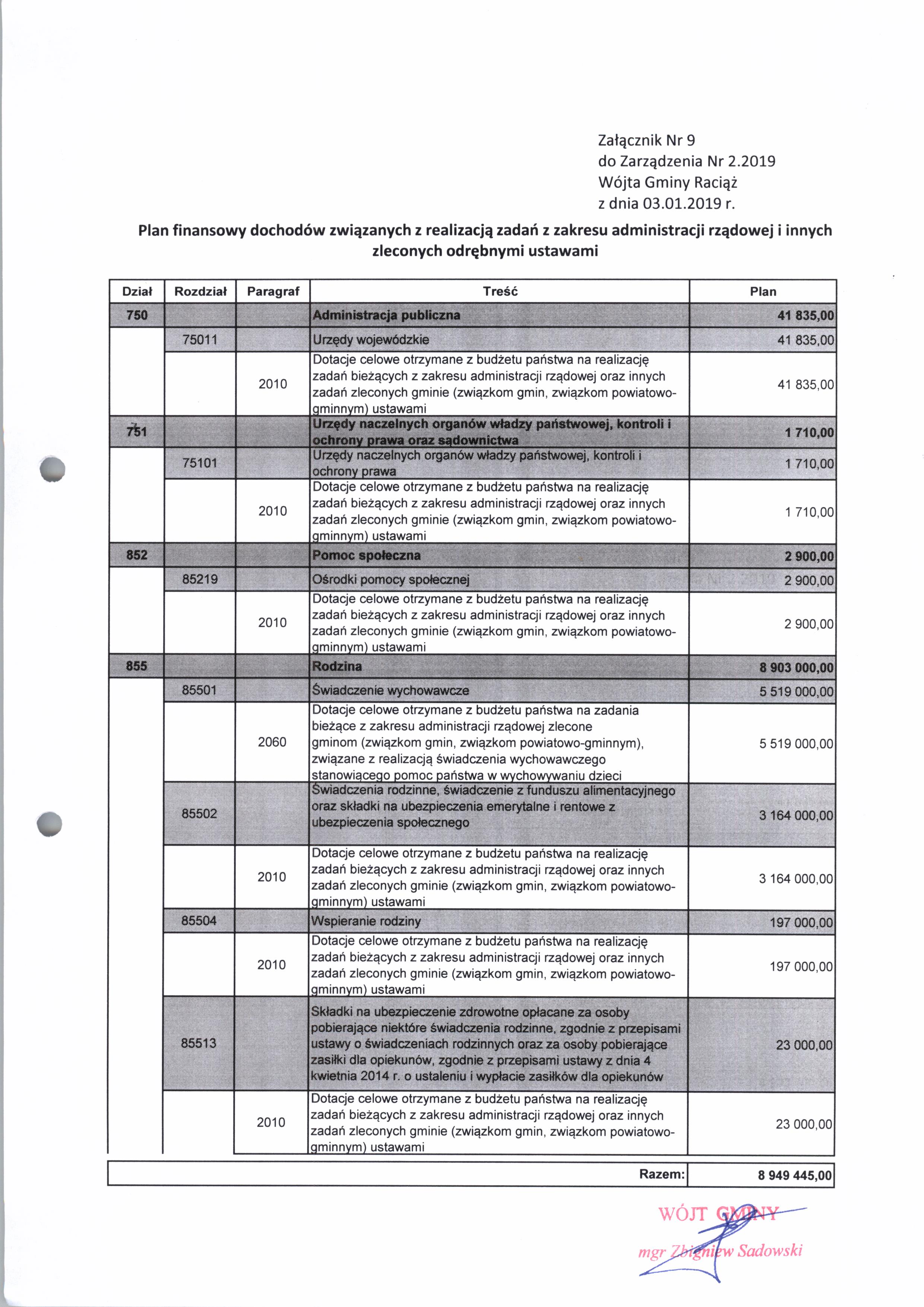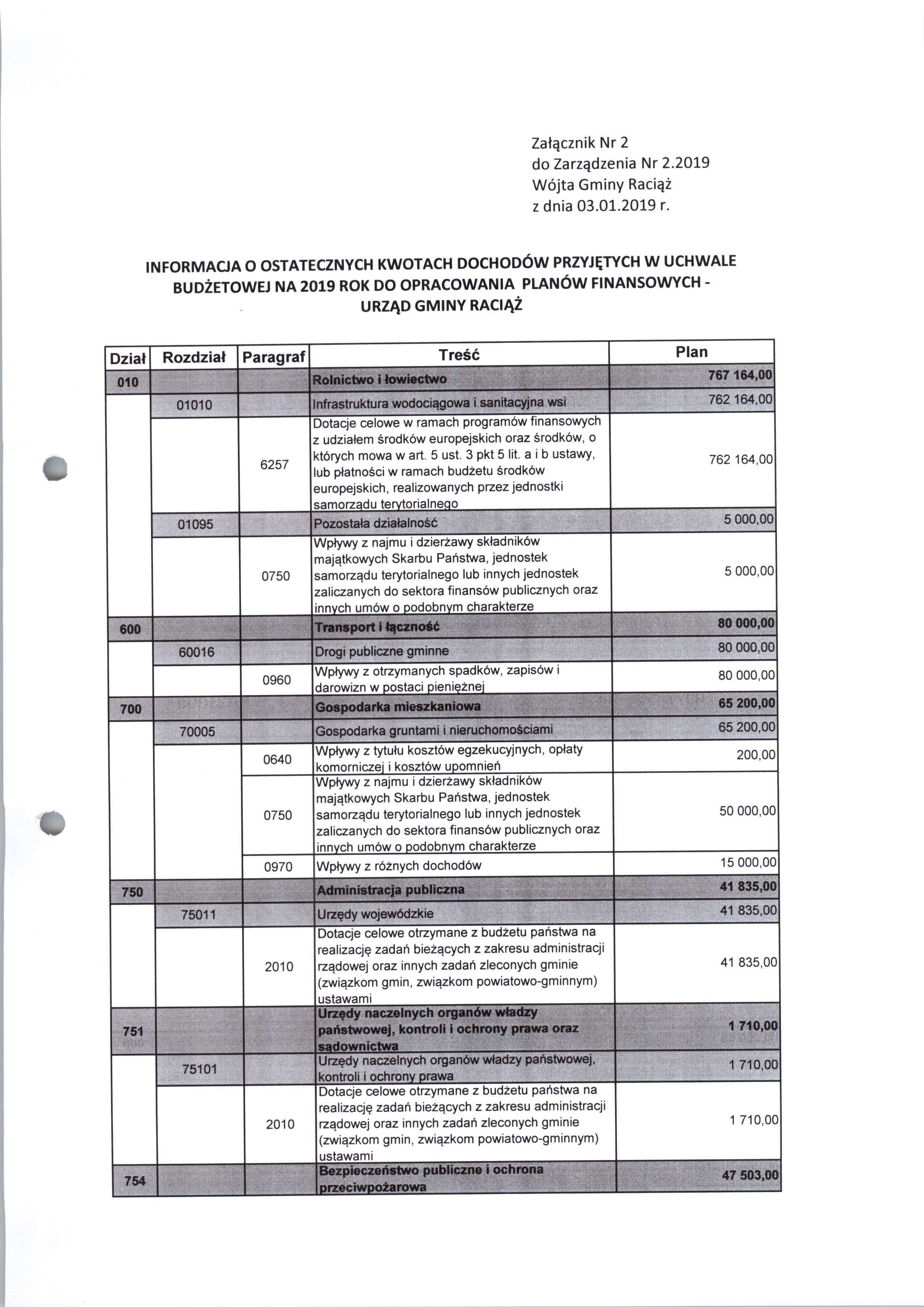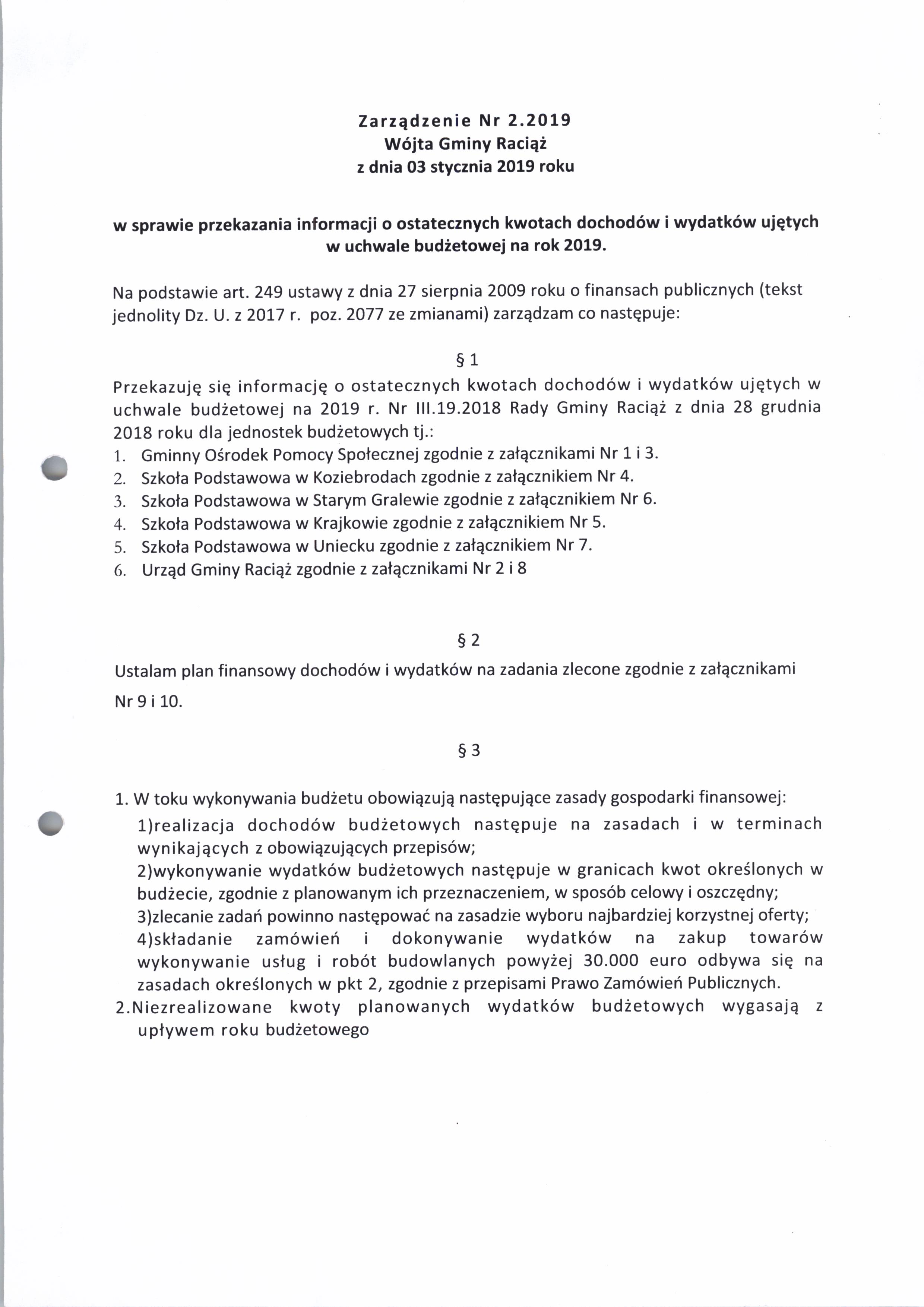 Zarządzenie nr 2.2019 Wójta Gminy Raciąż z dnia 3 stycznia 2019 r.