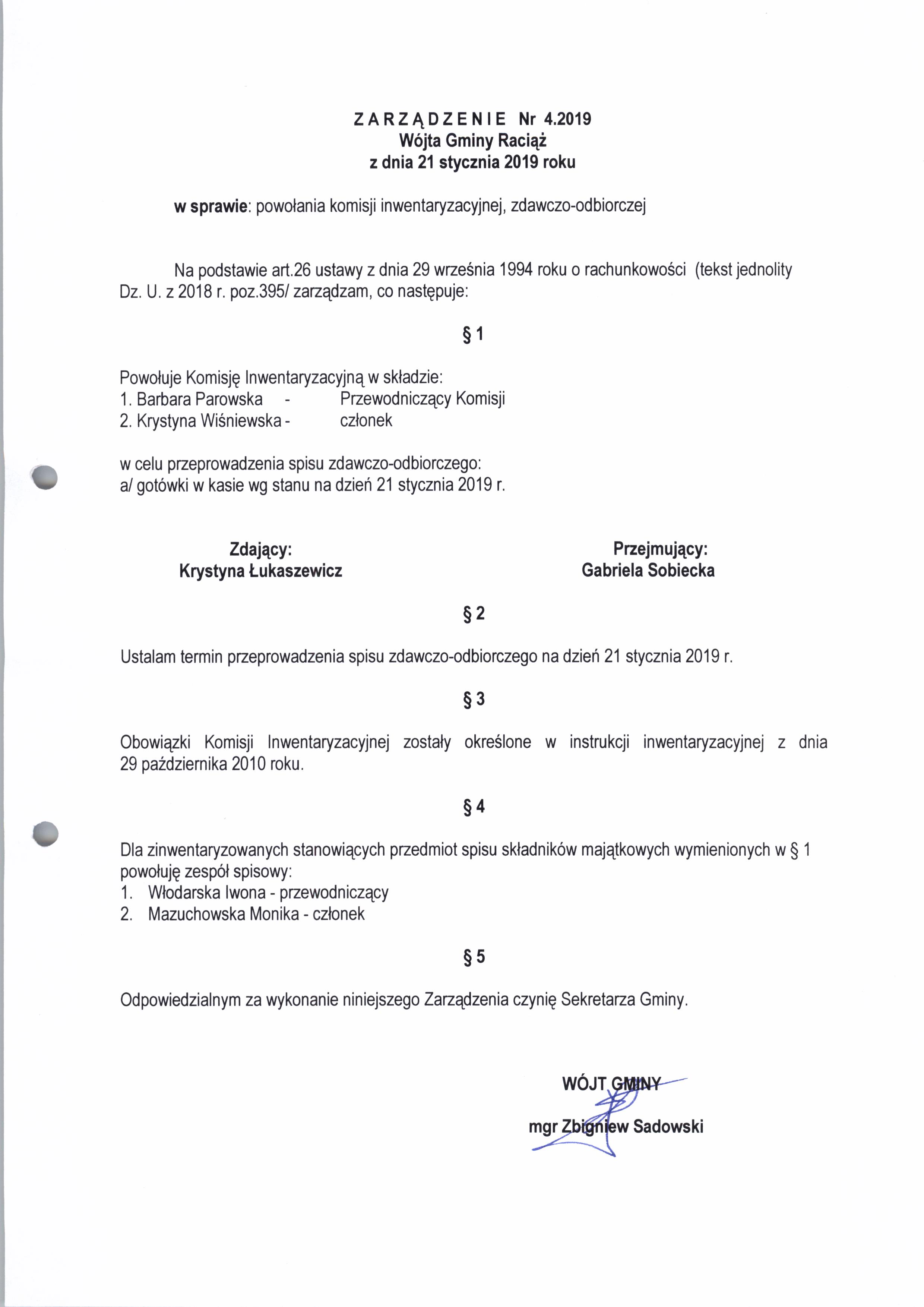 Zarządzenie nr 4.2019 Wójta Gminy Raciąż z dnia 21 stycznia 2019 r.
