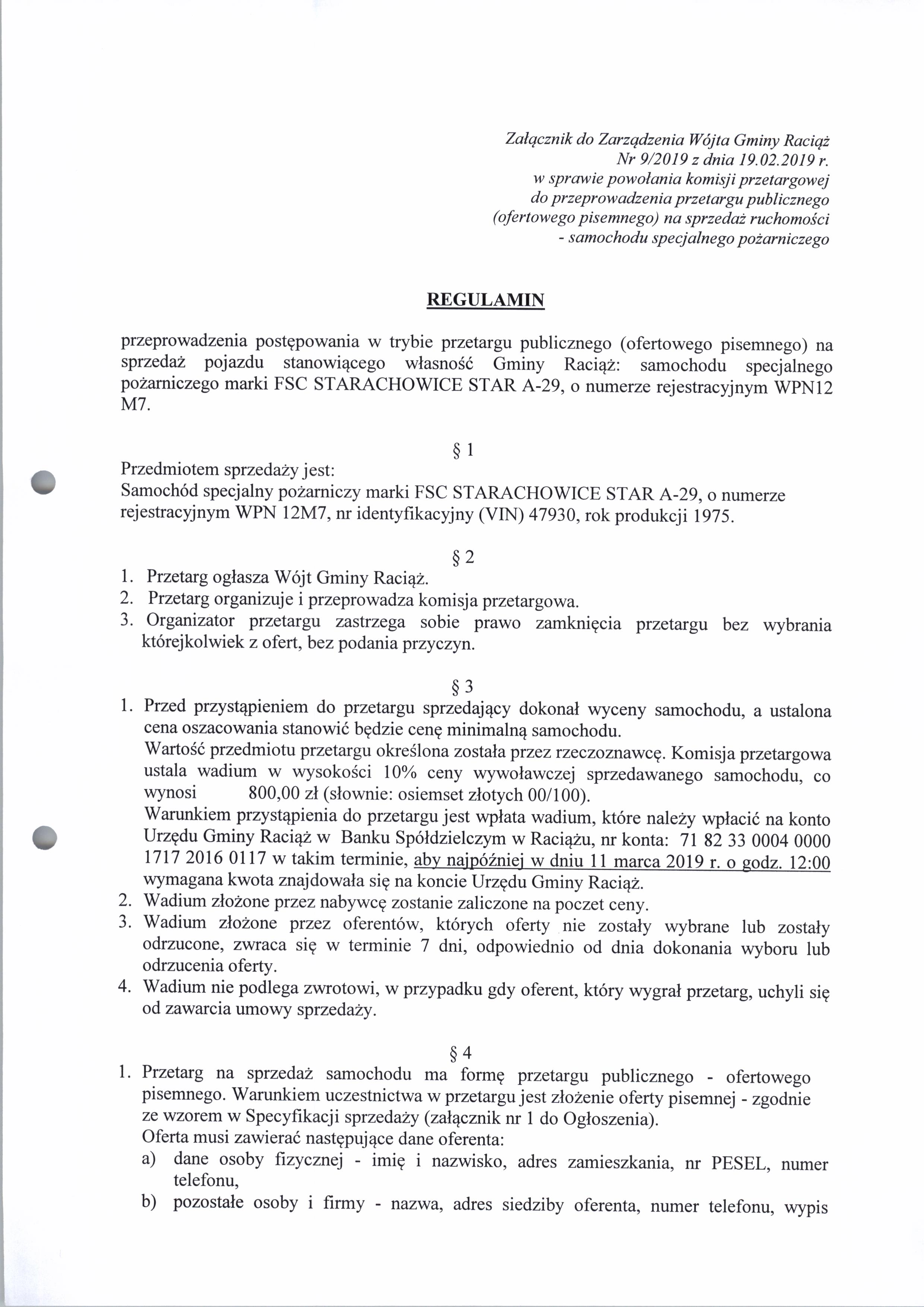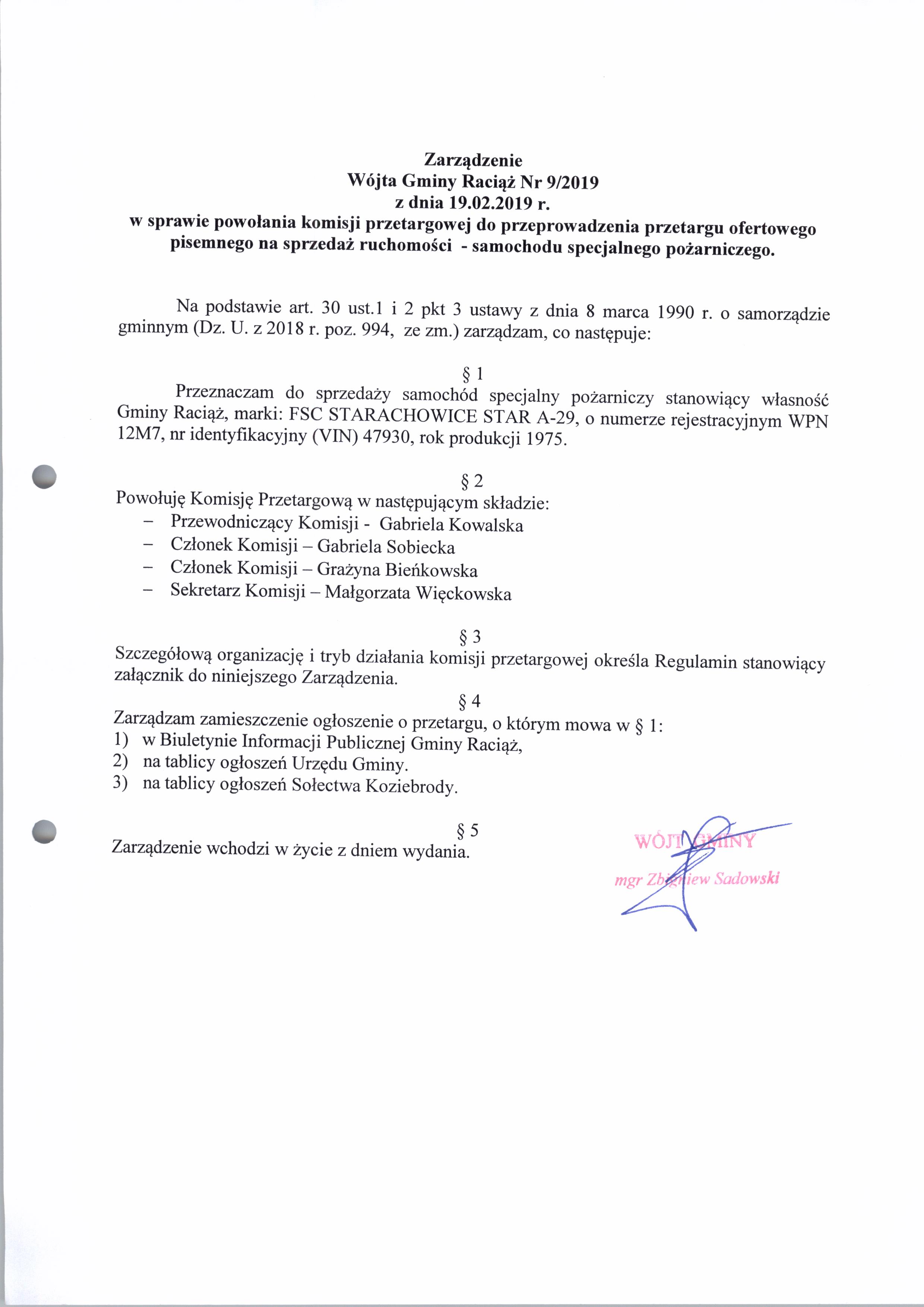 Zarządzenie Nr 9.2019 Wójta Gminy Raciąż z dnia 19 lutego 2019 roku