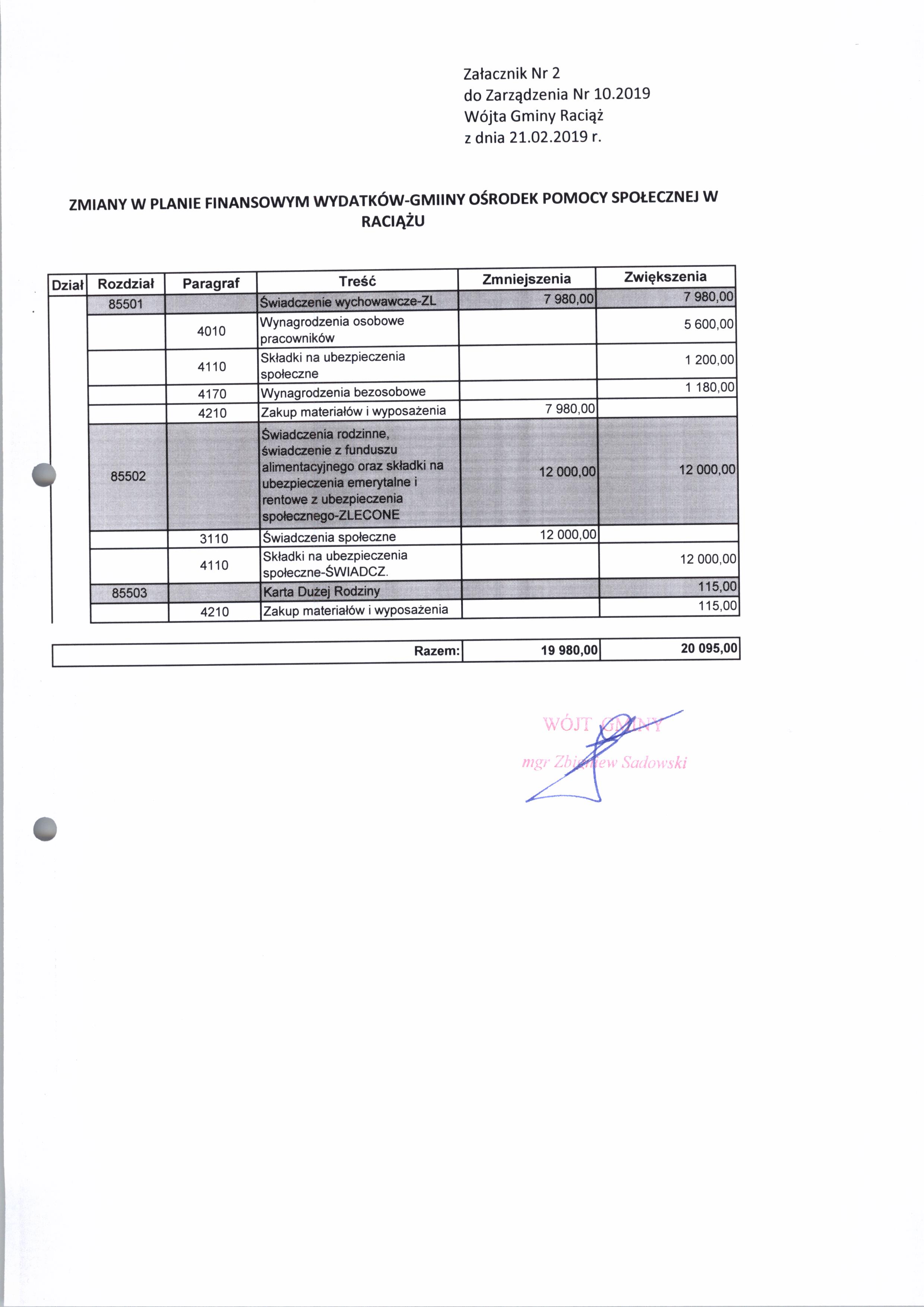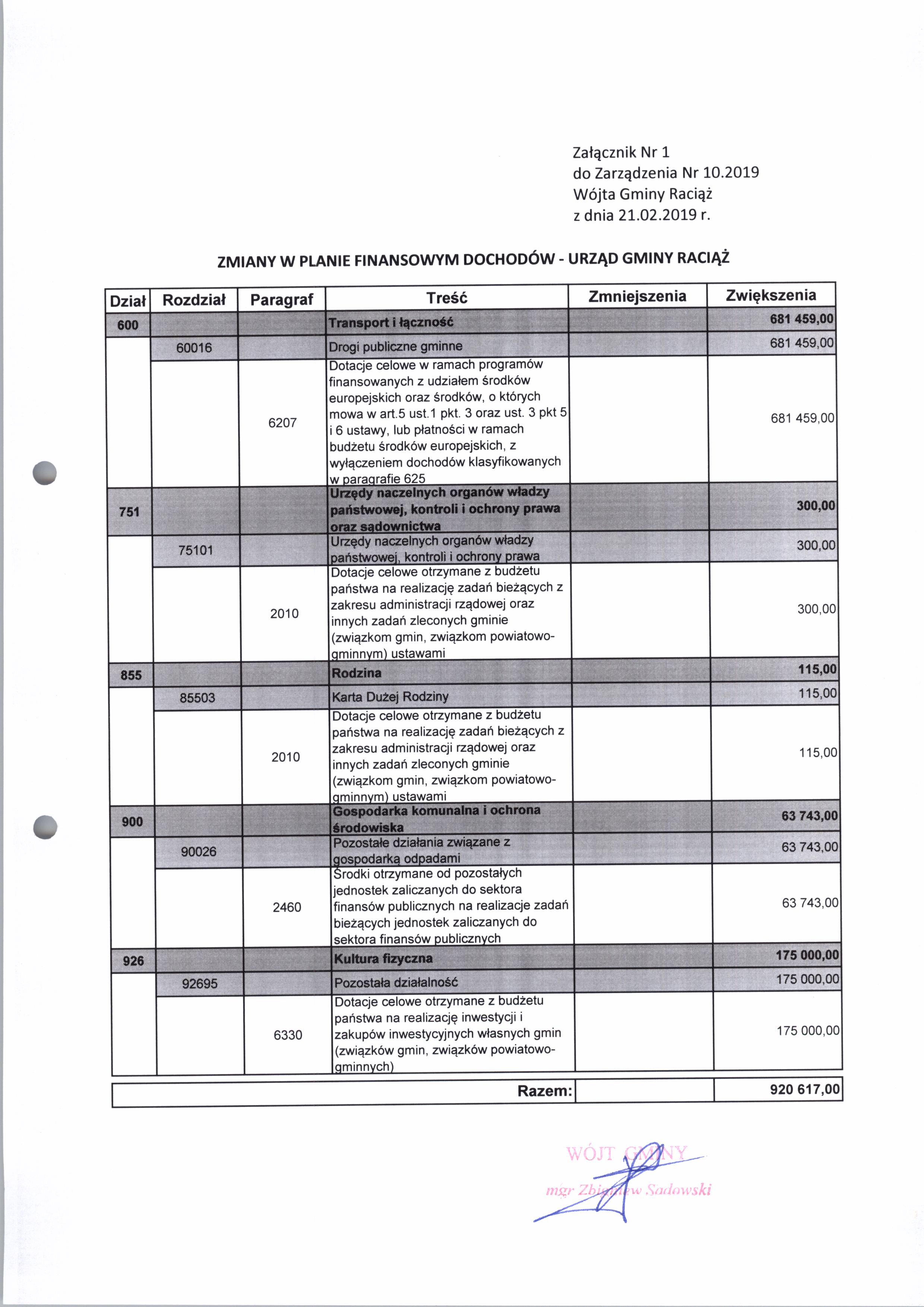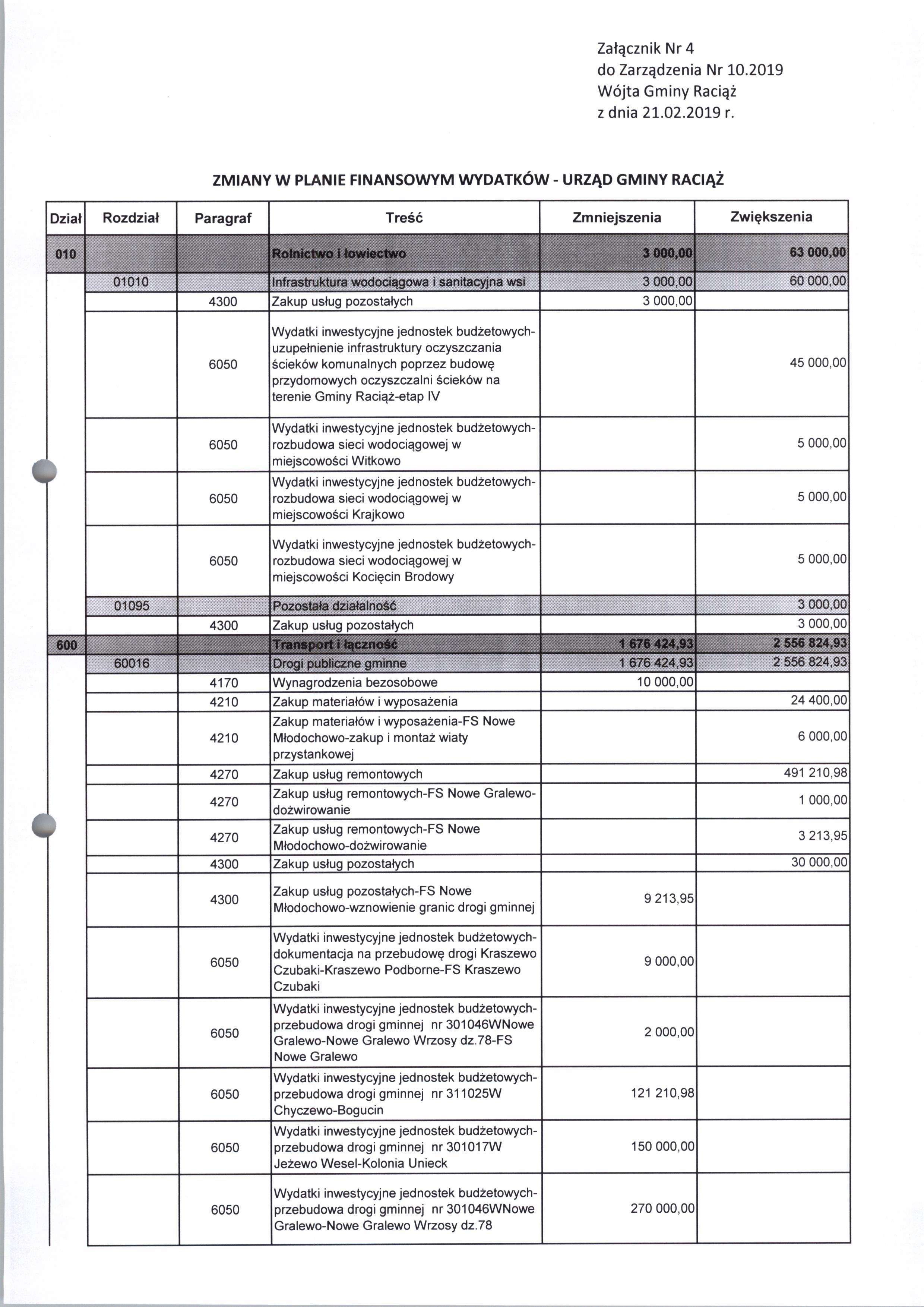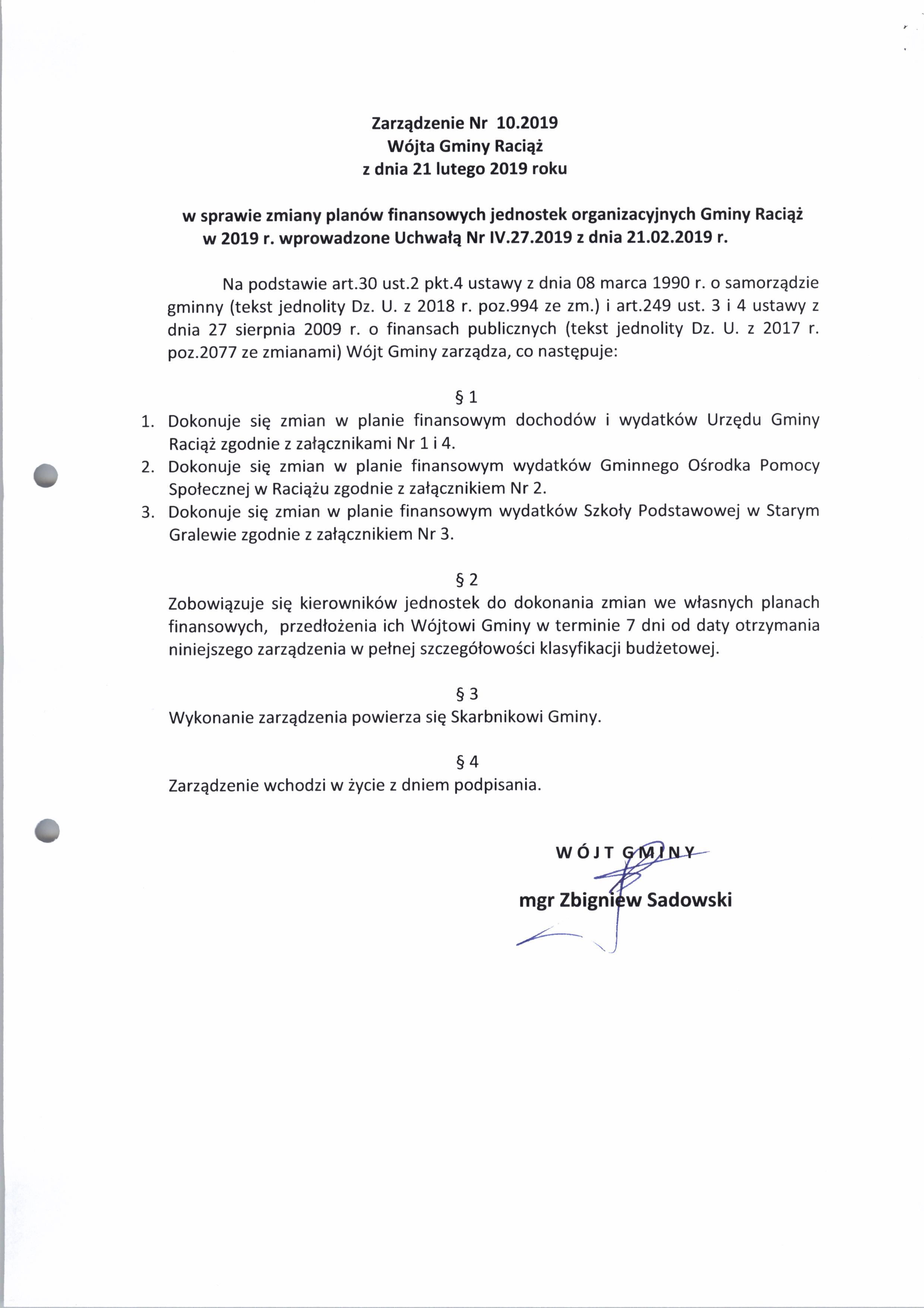 Zarządzenie Nr 10.2019 Wójta Gminy Raciąż z dnia 21 lutego 2019 roku