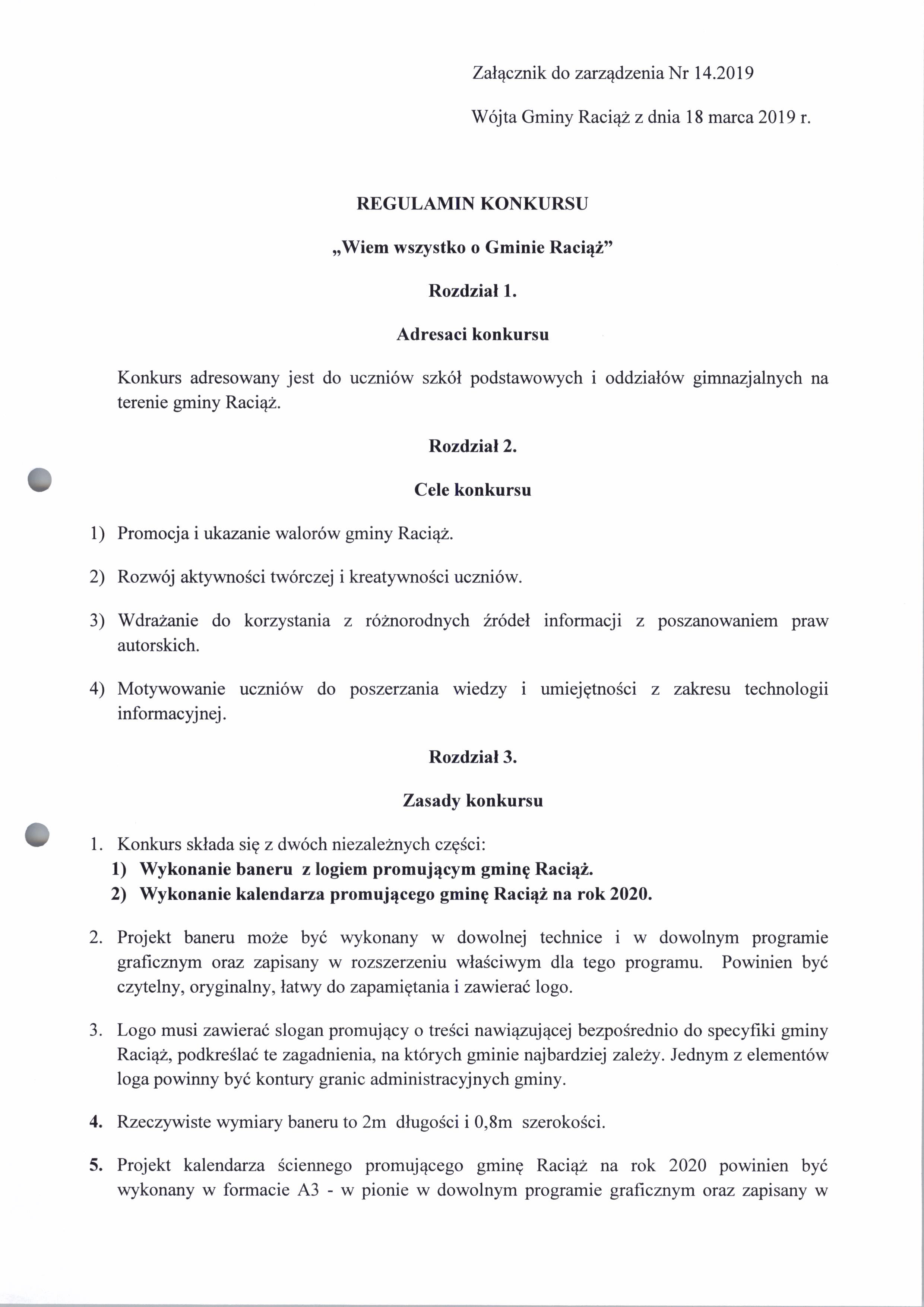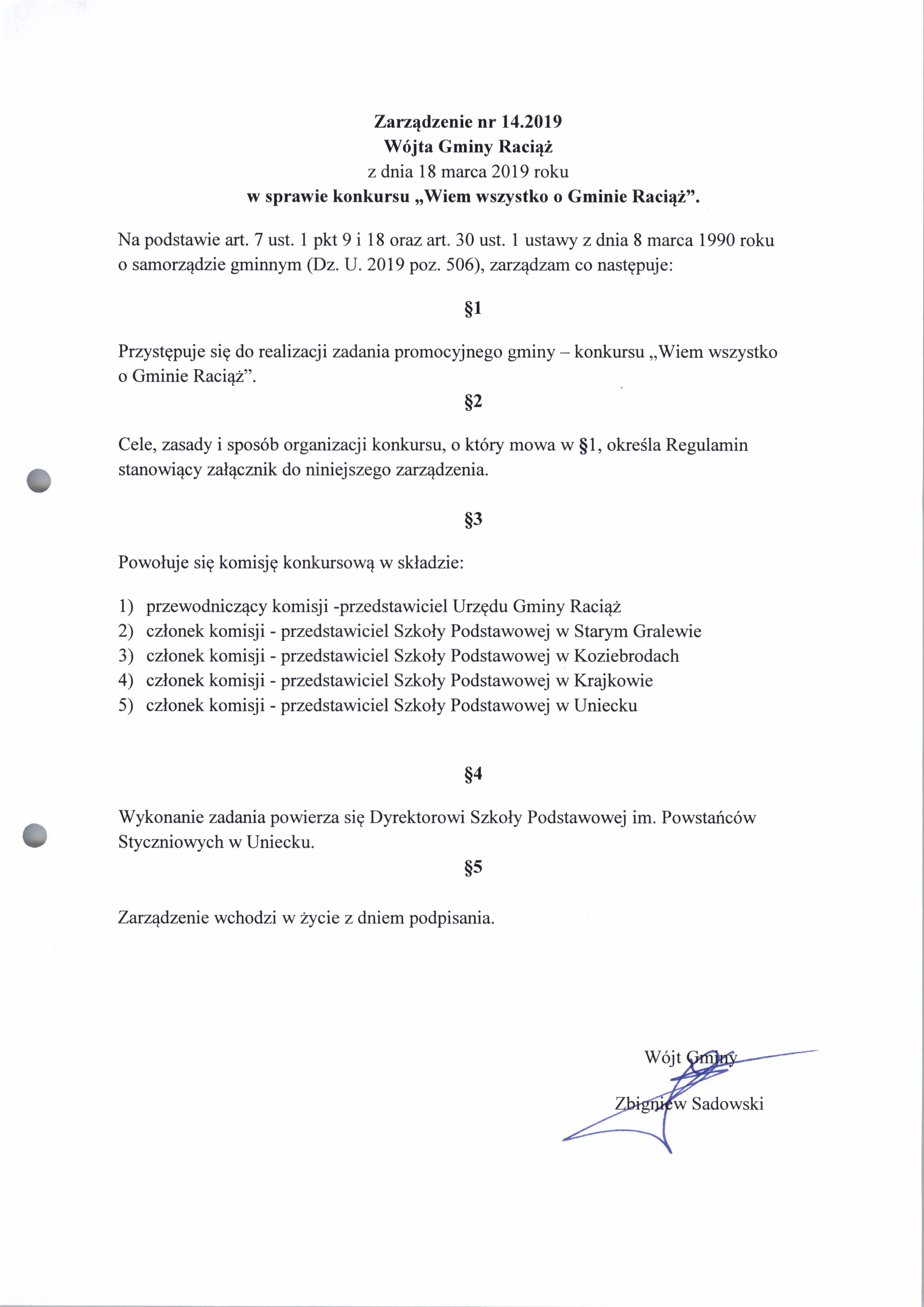 Zarządzenie Nr 14.2019 Wójta Gminy Raciąż z dnia 18 marca 2019 roku