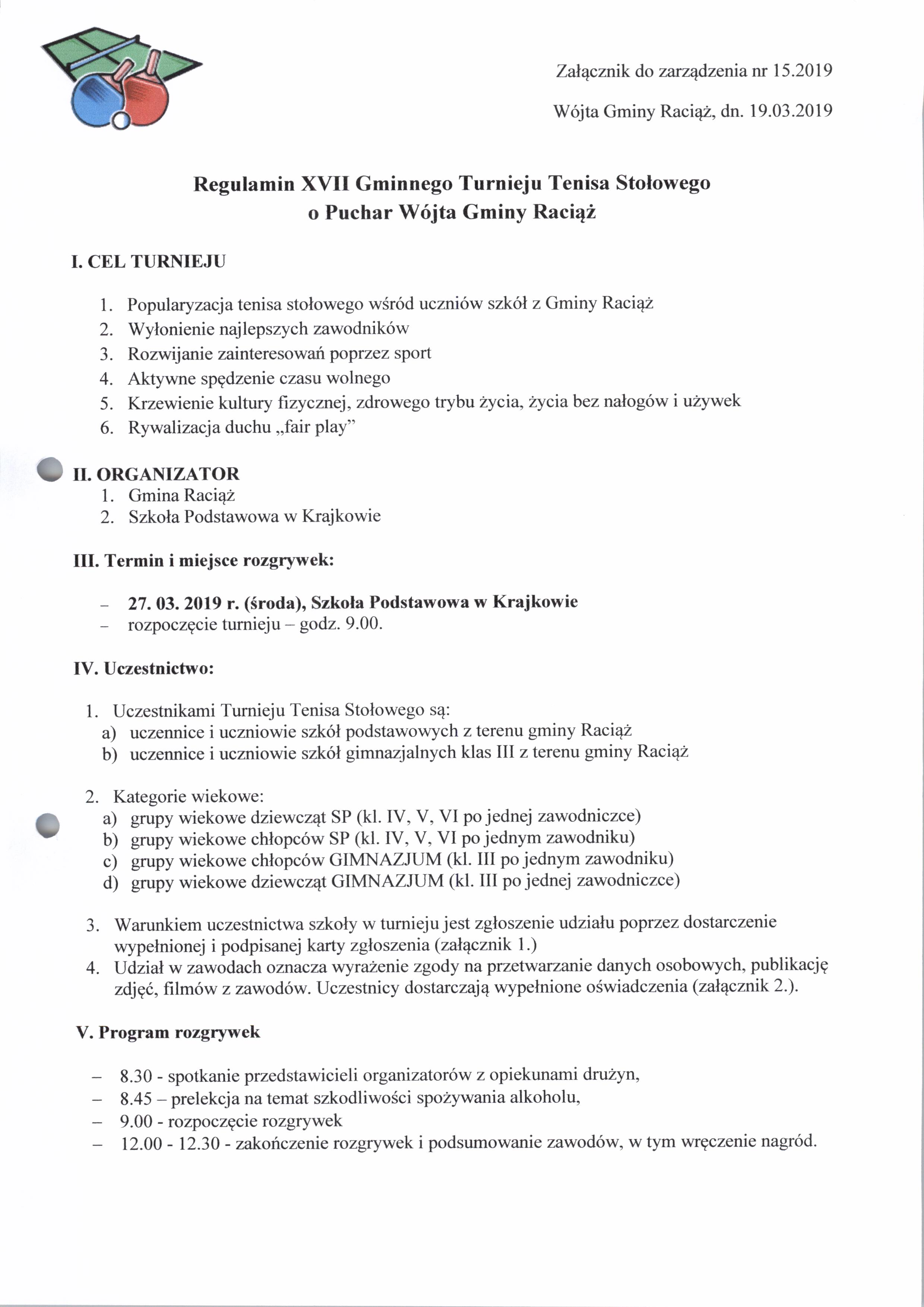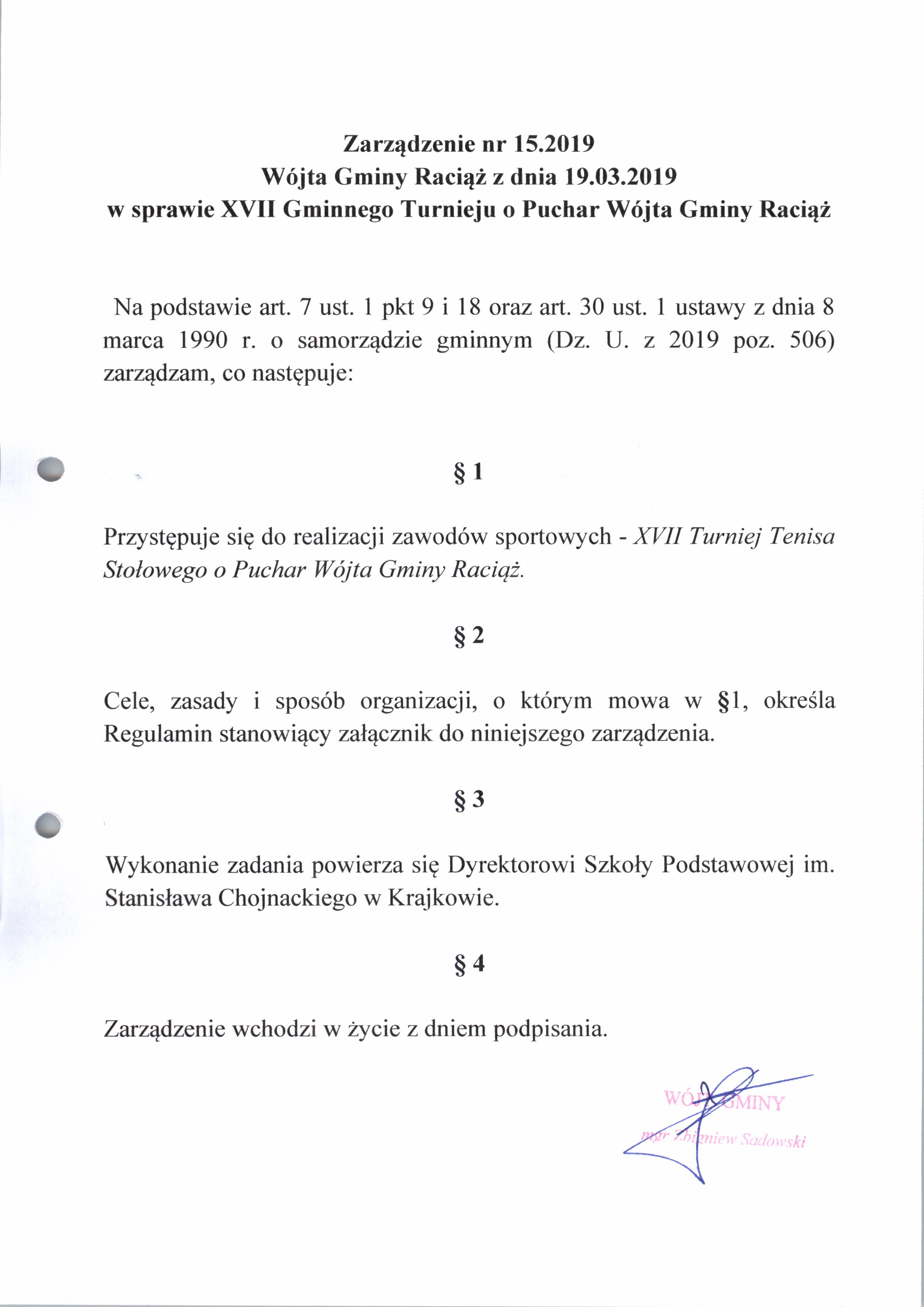 Zarządzenie Nr 15.2019 Wójta Gminy Raciąż z dnia 19 marca 2019 roku