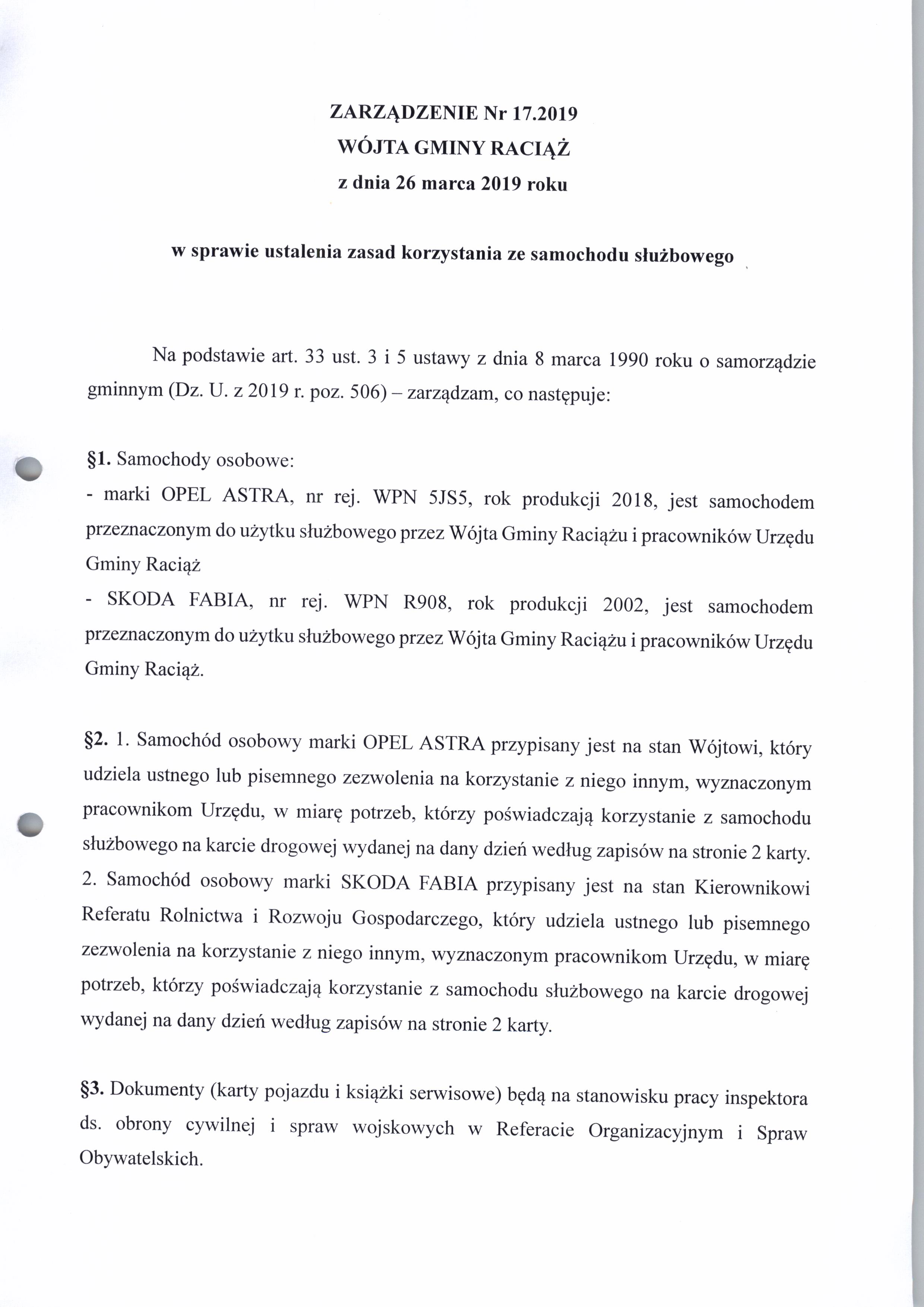 Zarządzenie Nr 17.2019 Wójta Gminy Raciąż z dnia 26 marca 2019 roku