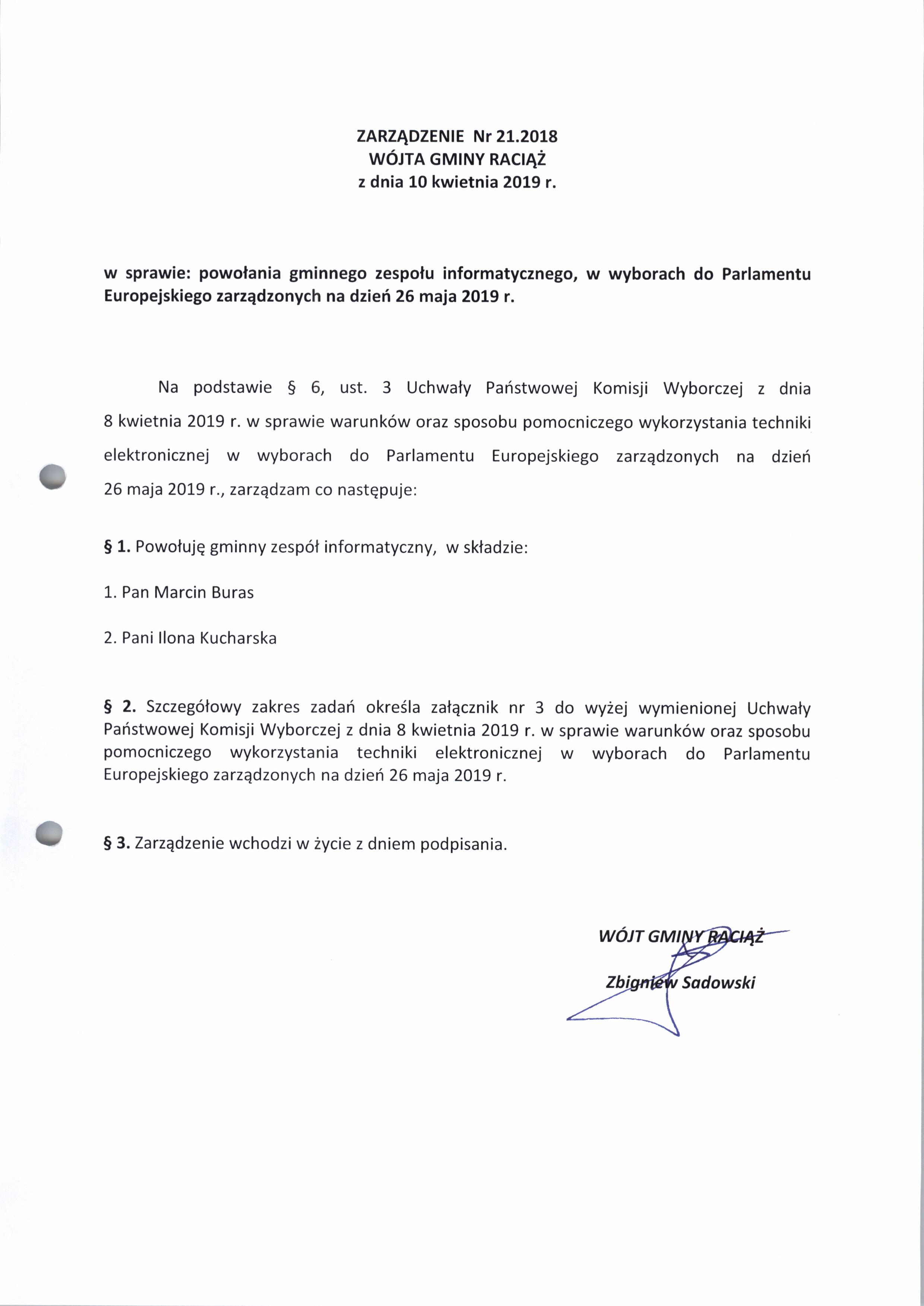 Zarządzenie Nr 21.2019 Wójta Gminy Raciąż z dnia 10 kwietnia 2019 roku
