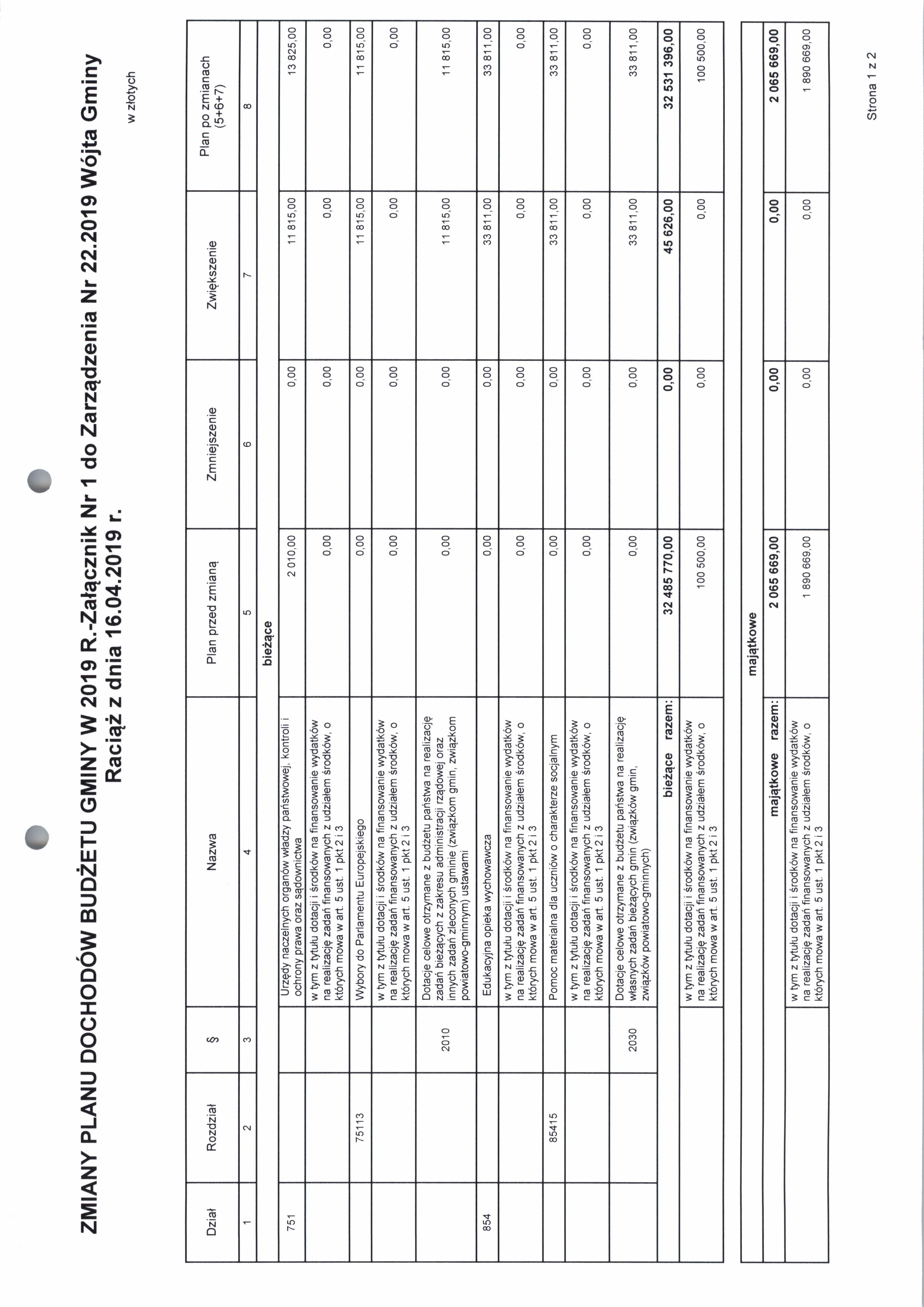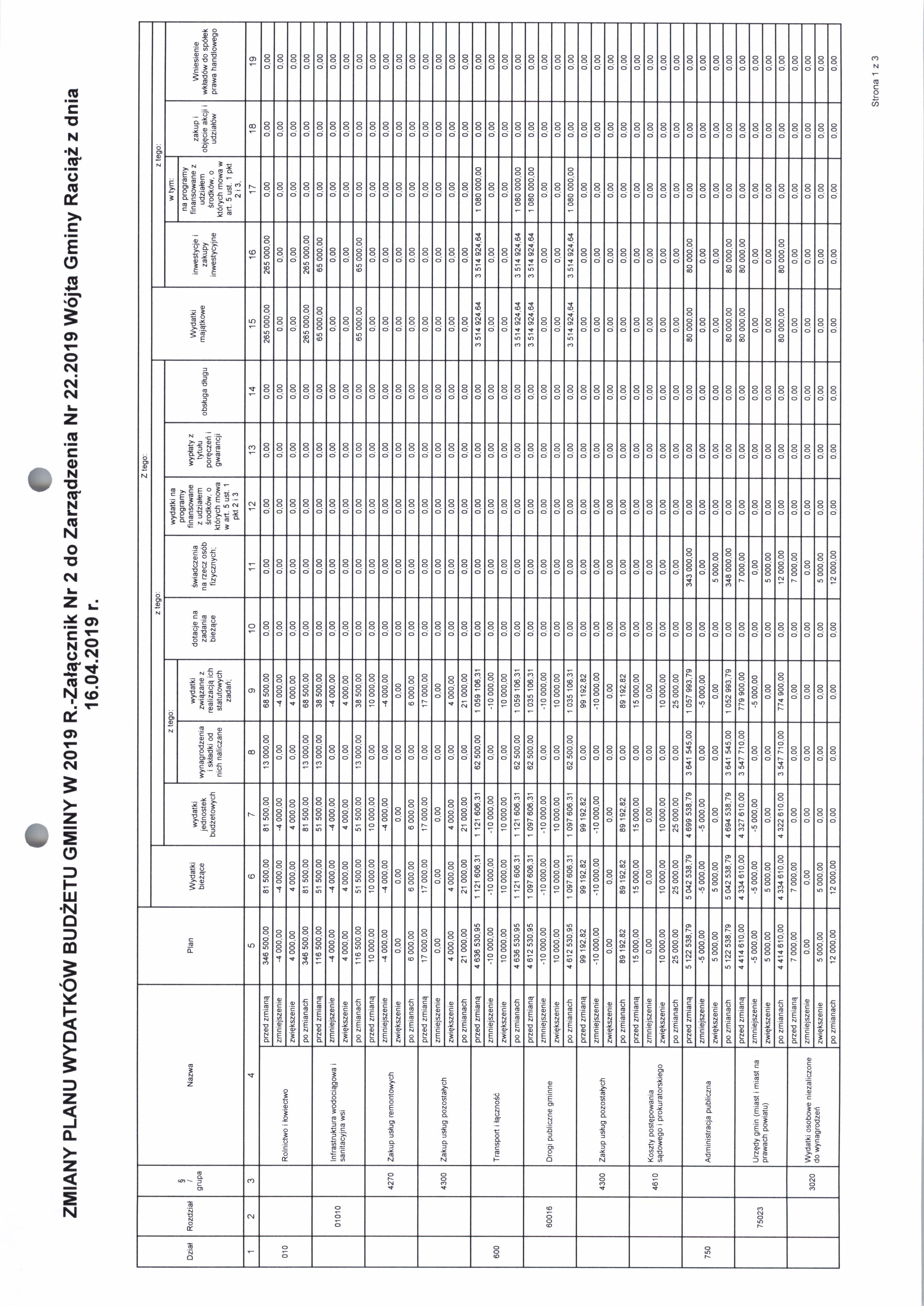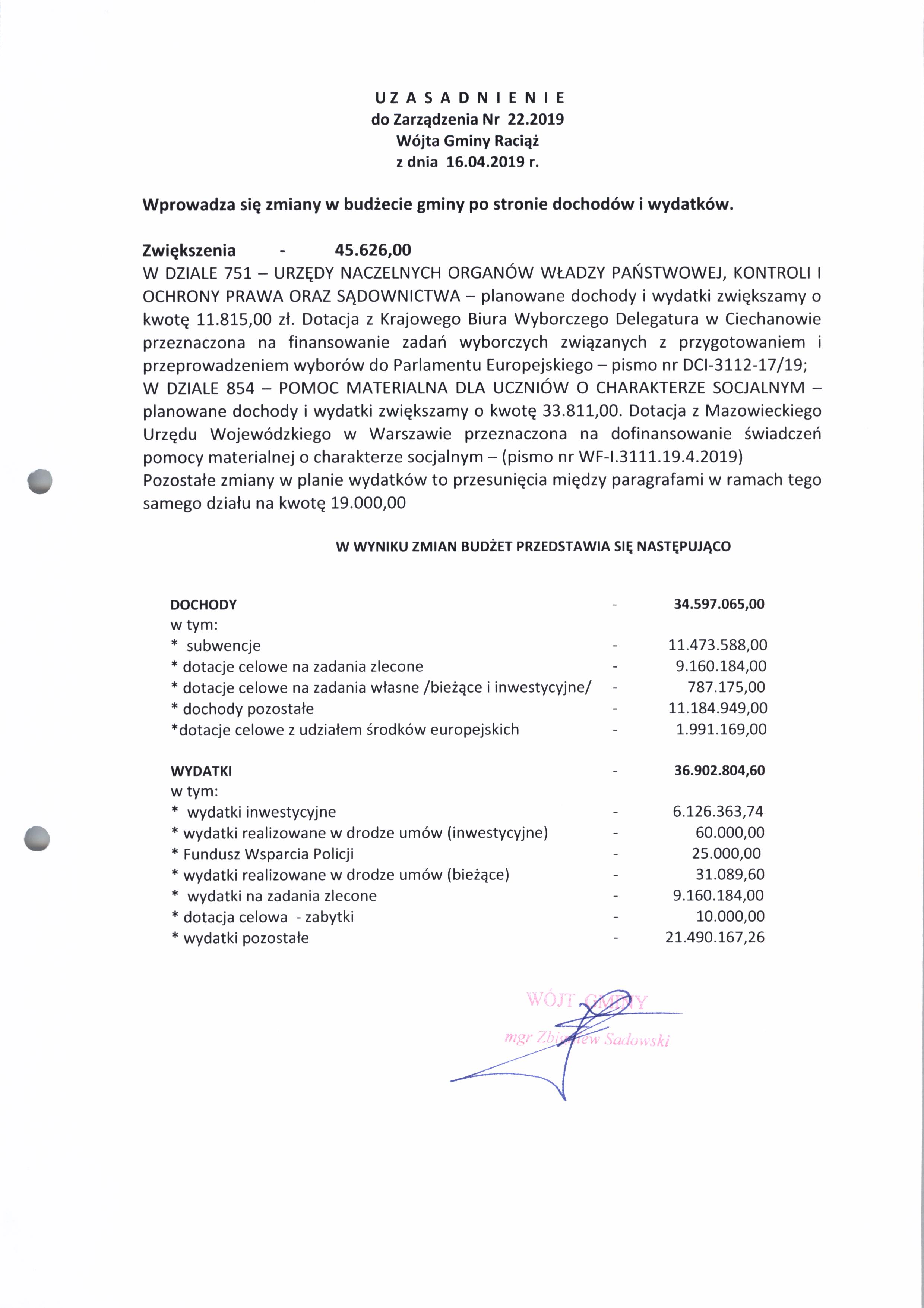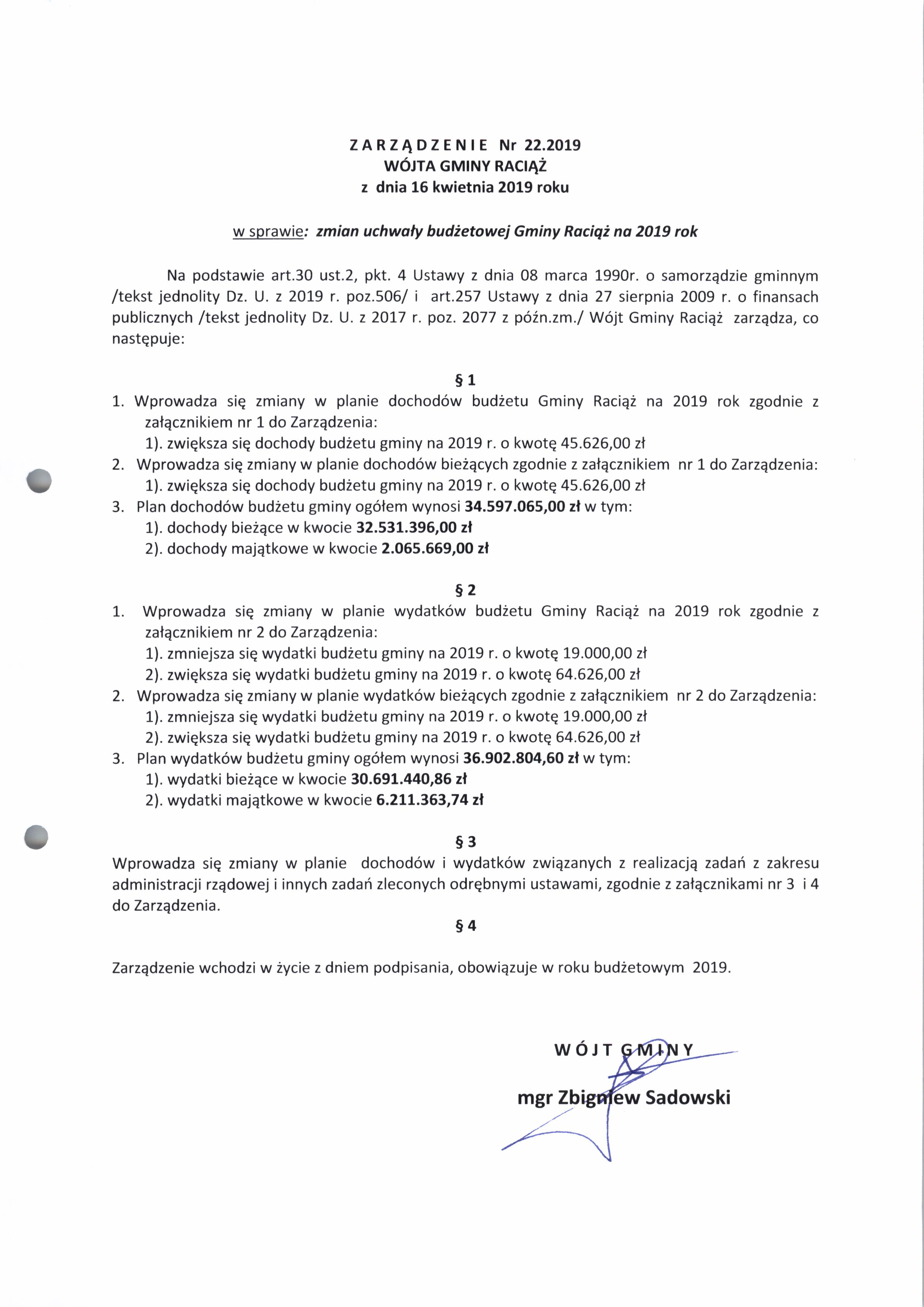 Zarządzenie Nr 22.2019 Wójta Gminy Raciąż z dnia 16 kwietnia 2019 roku