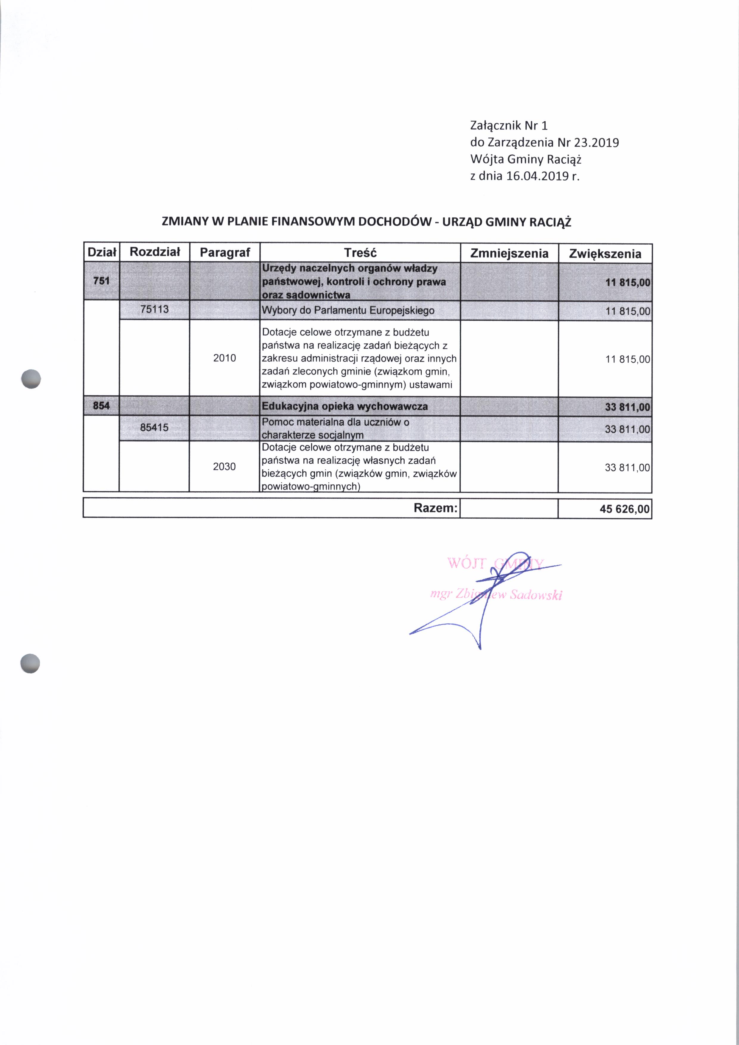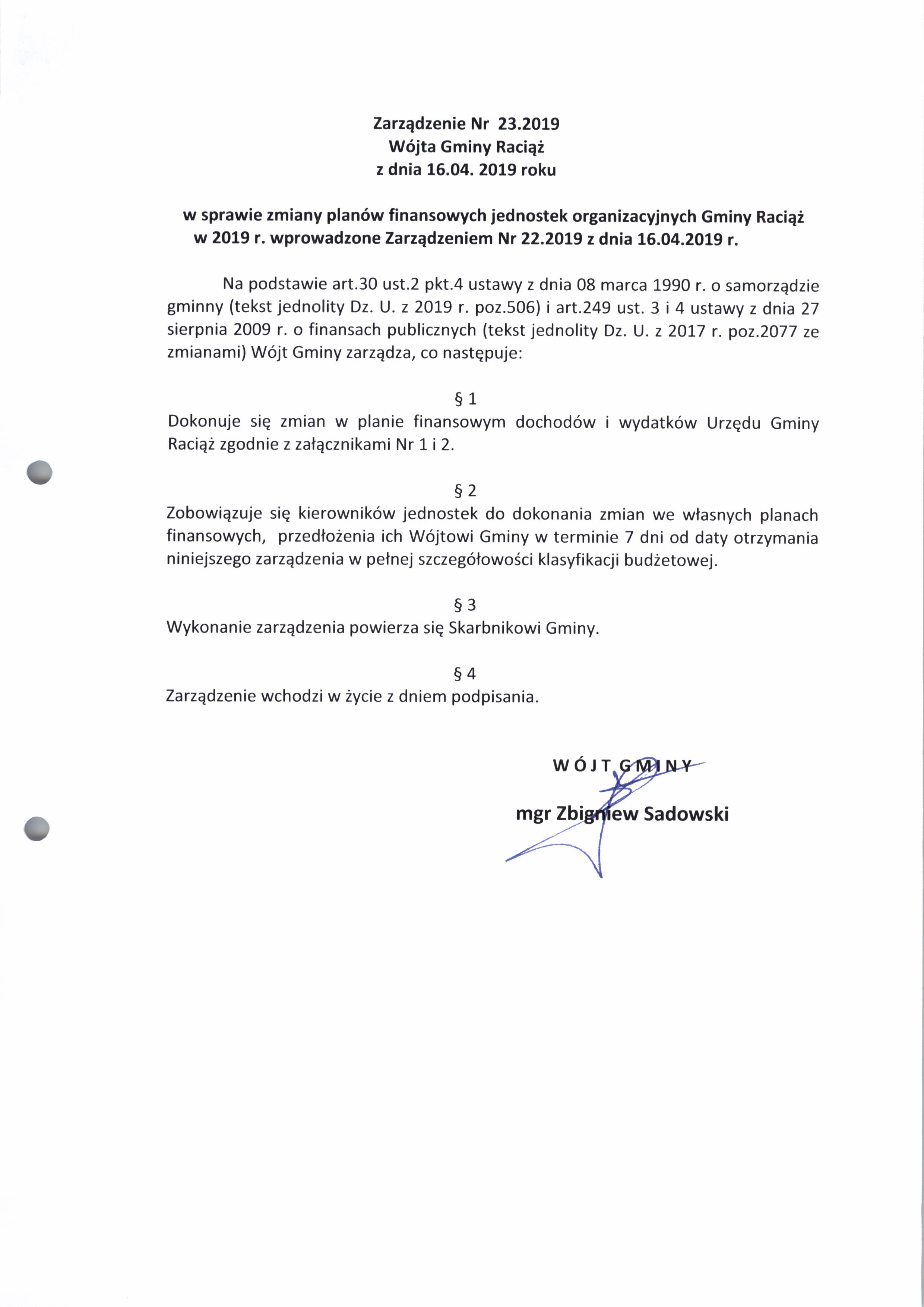 Zarządzenie Nr 23.2019 Wójta Gminy Raciąż z dnia 16 kwietnia 2019 roku