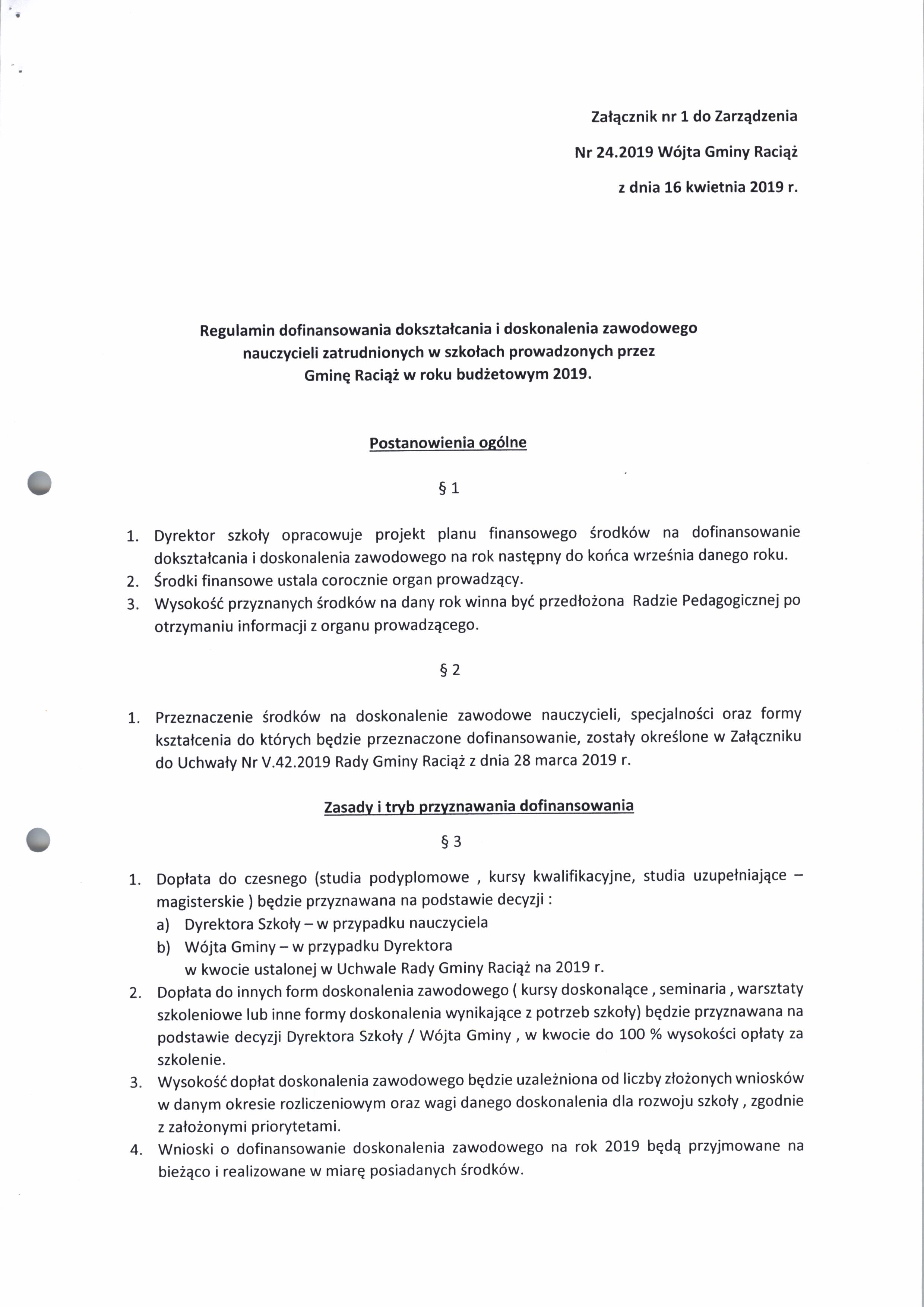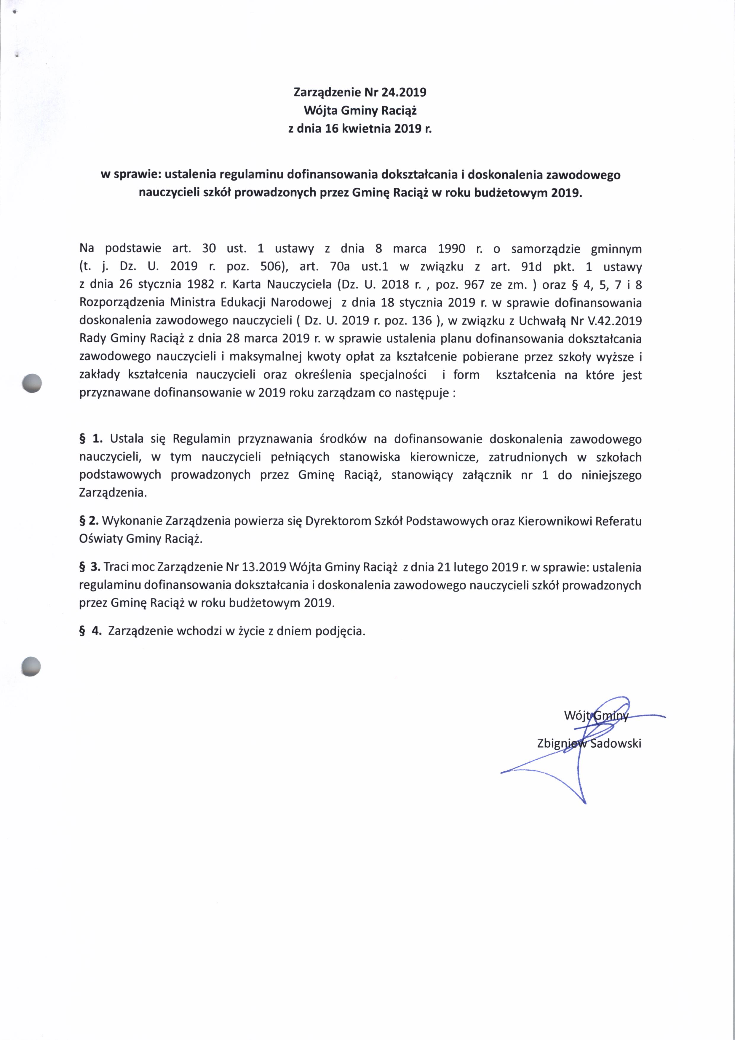 Zarządzenie Nr 24.2019 Wójta Gminy Raciąż z dnia 16 kwietnia 2019 roku