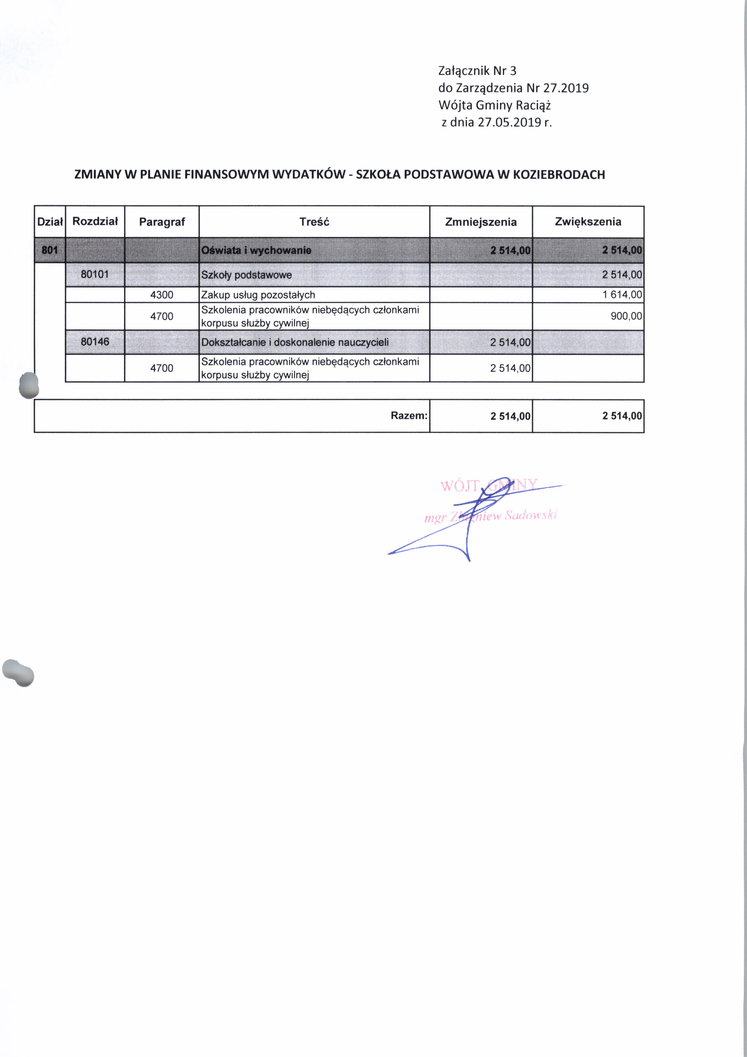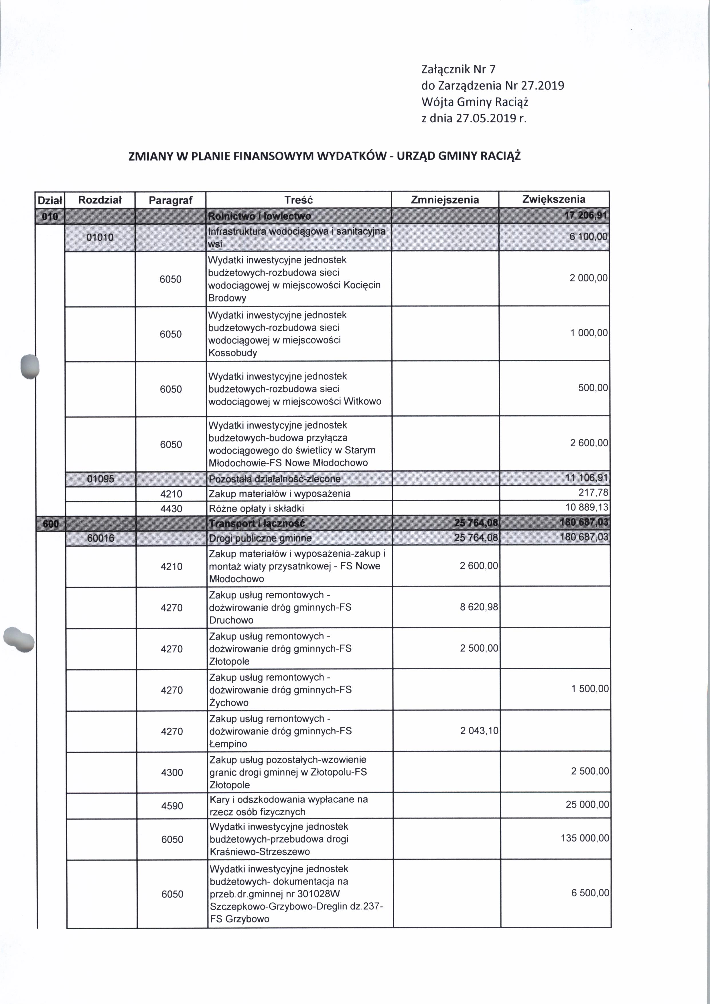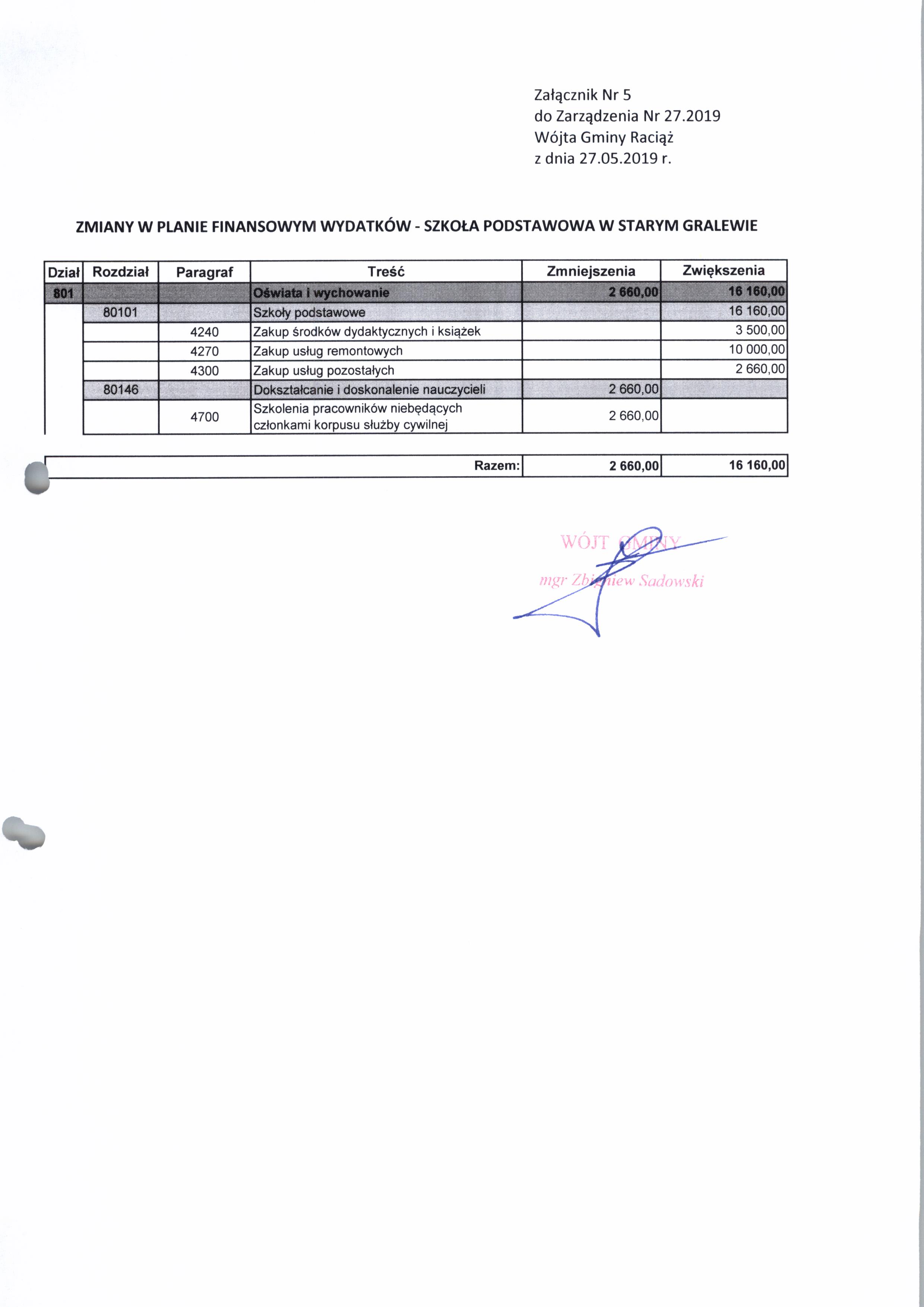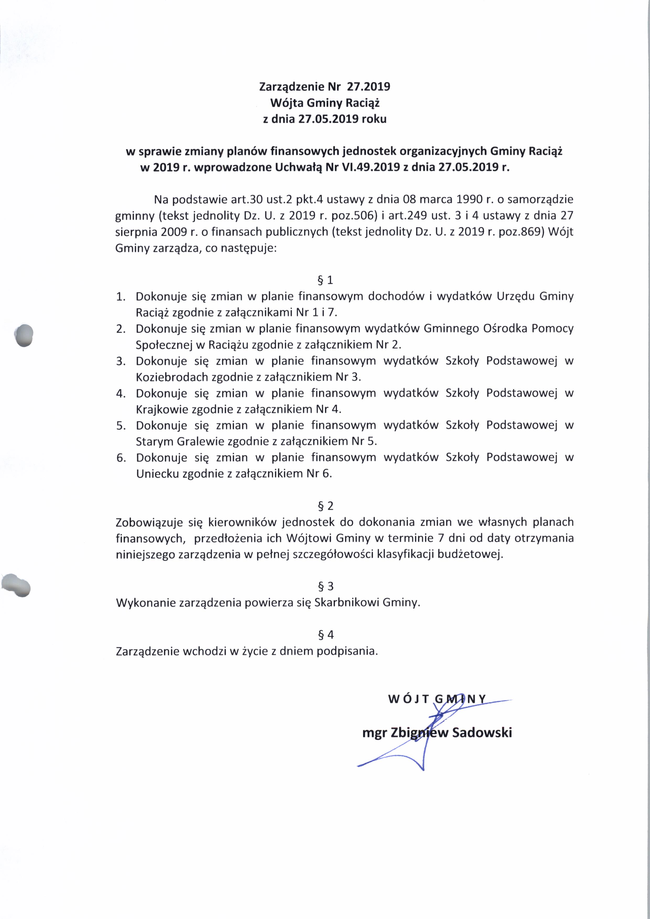 Zarządzenie Nr 27.2019 Wójta Gminy Raciąż z dnia 27 maja 2019 roku