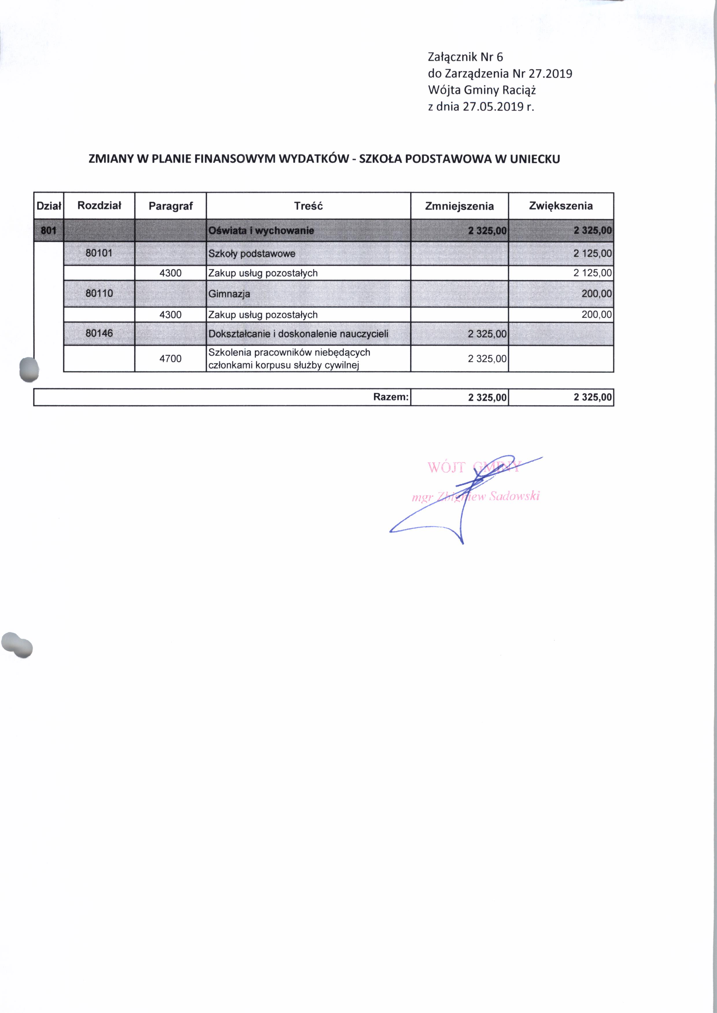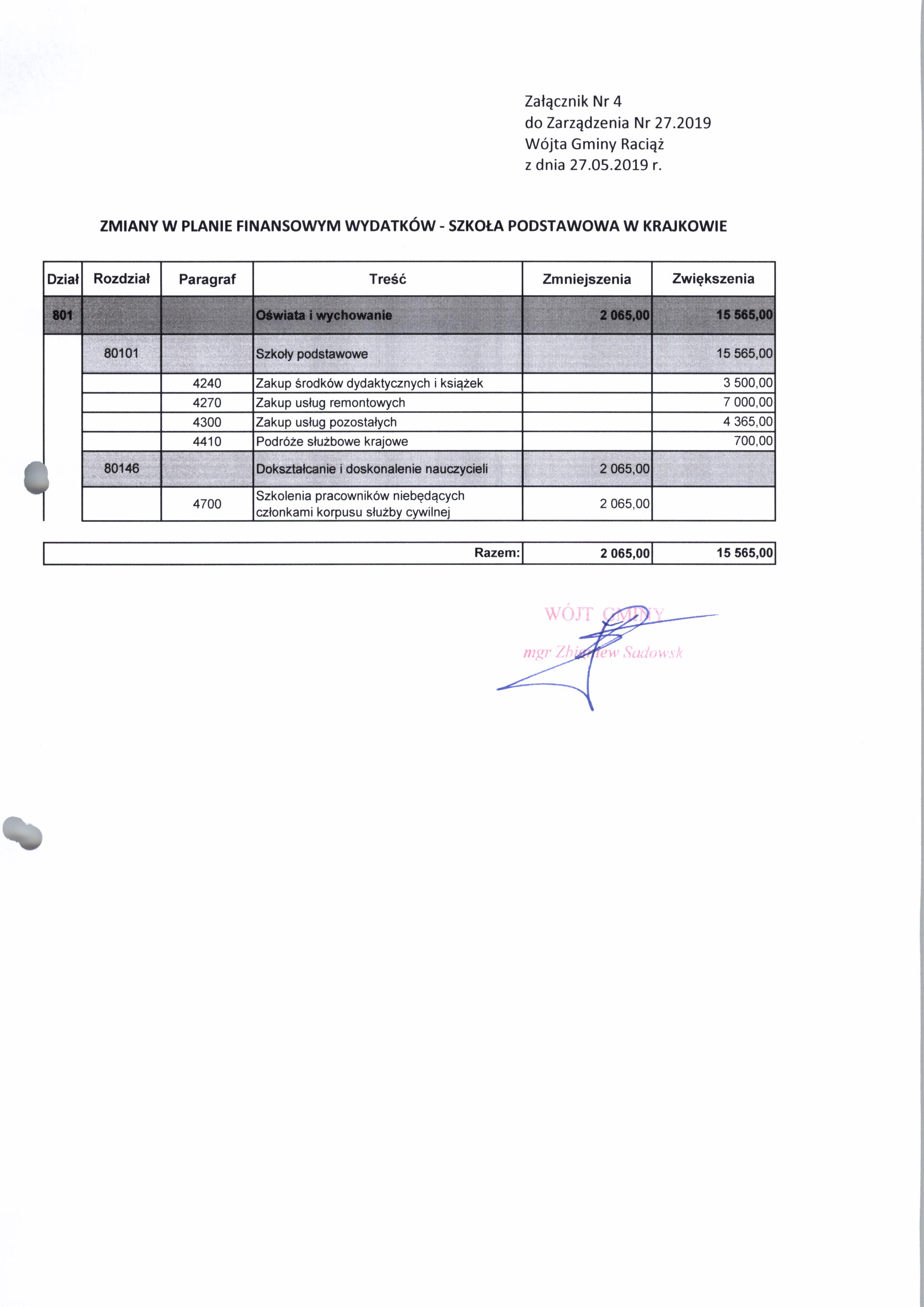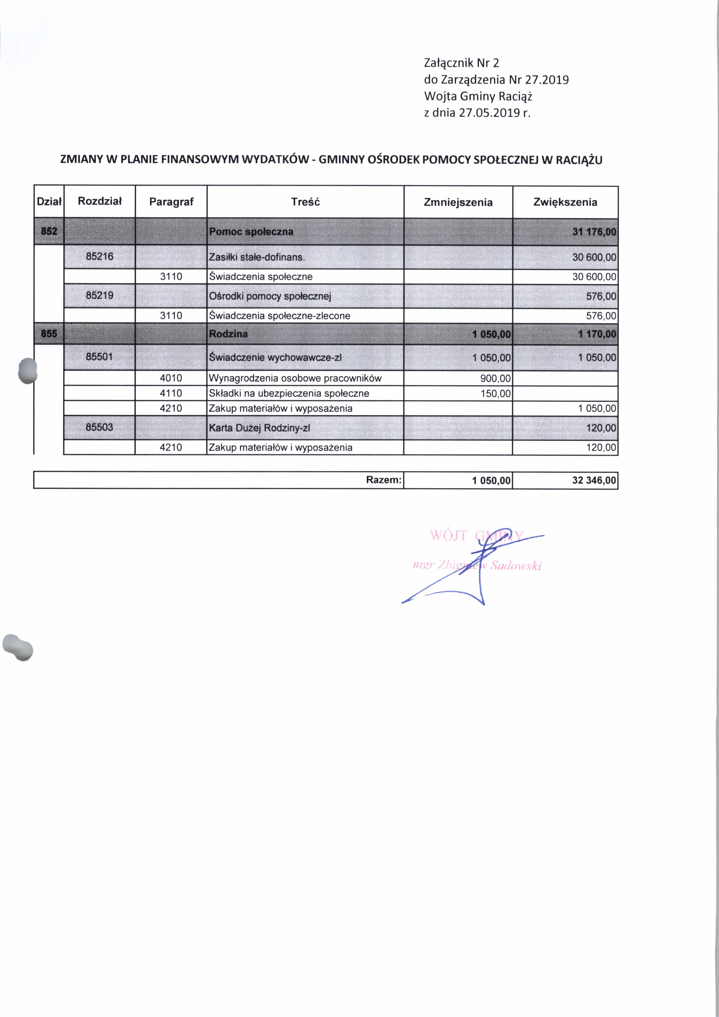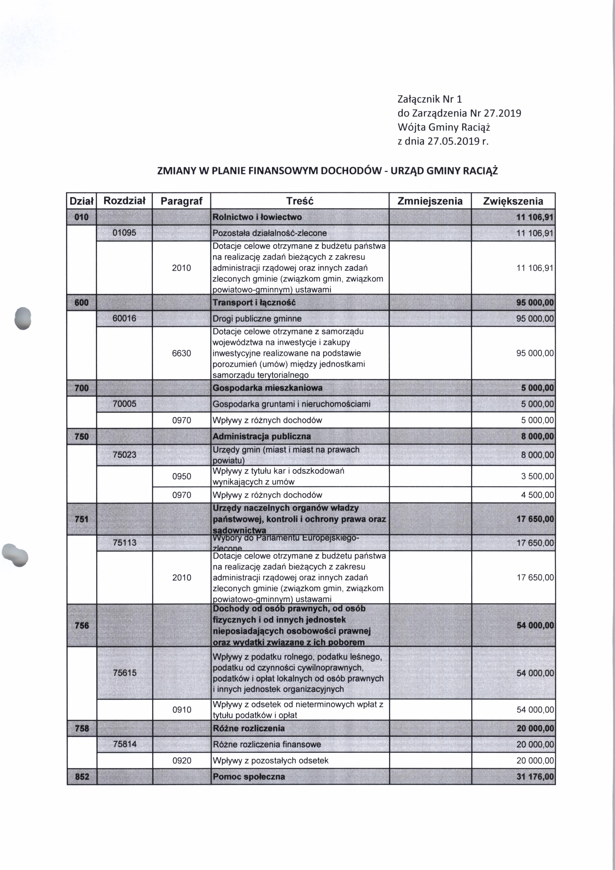 Zarządzenie Nr 27.2019 Wójta Gminy Raciąż z dnia 27 maja 2019 roku