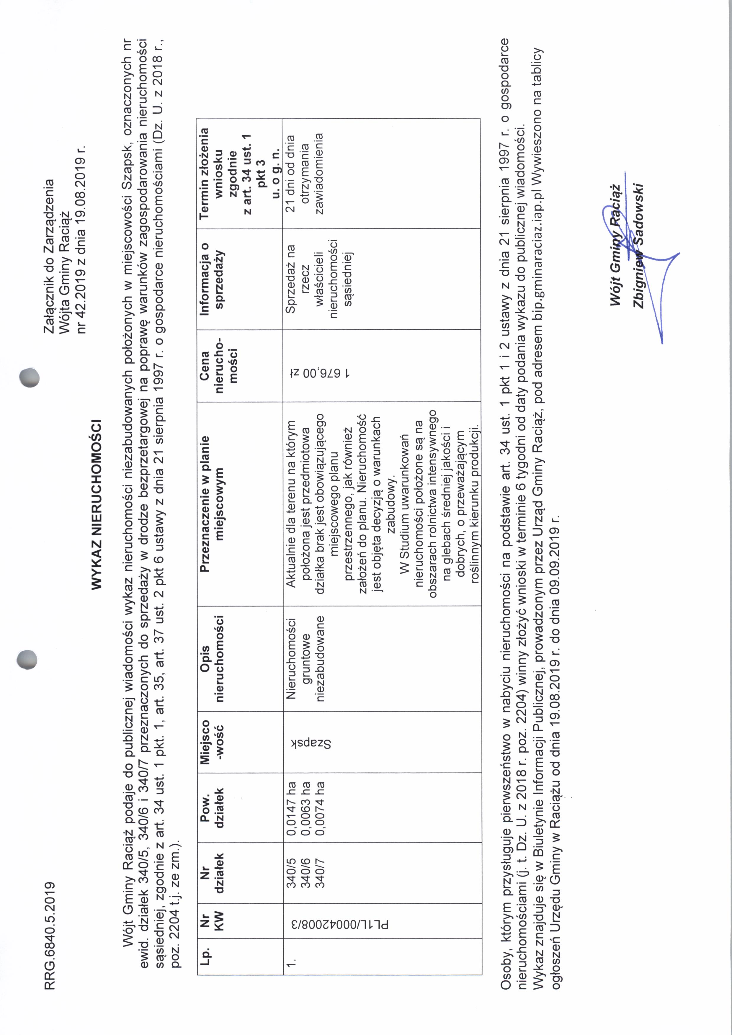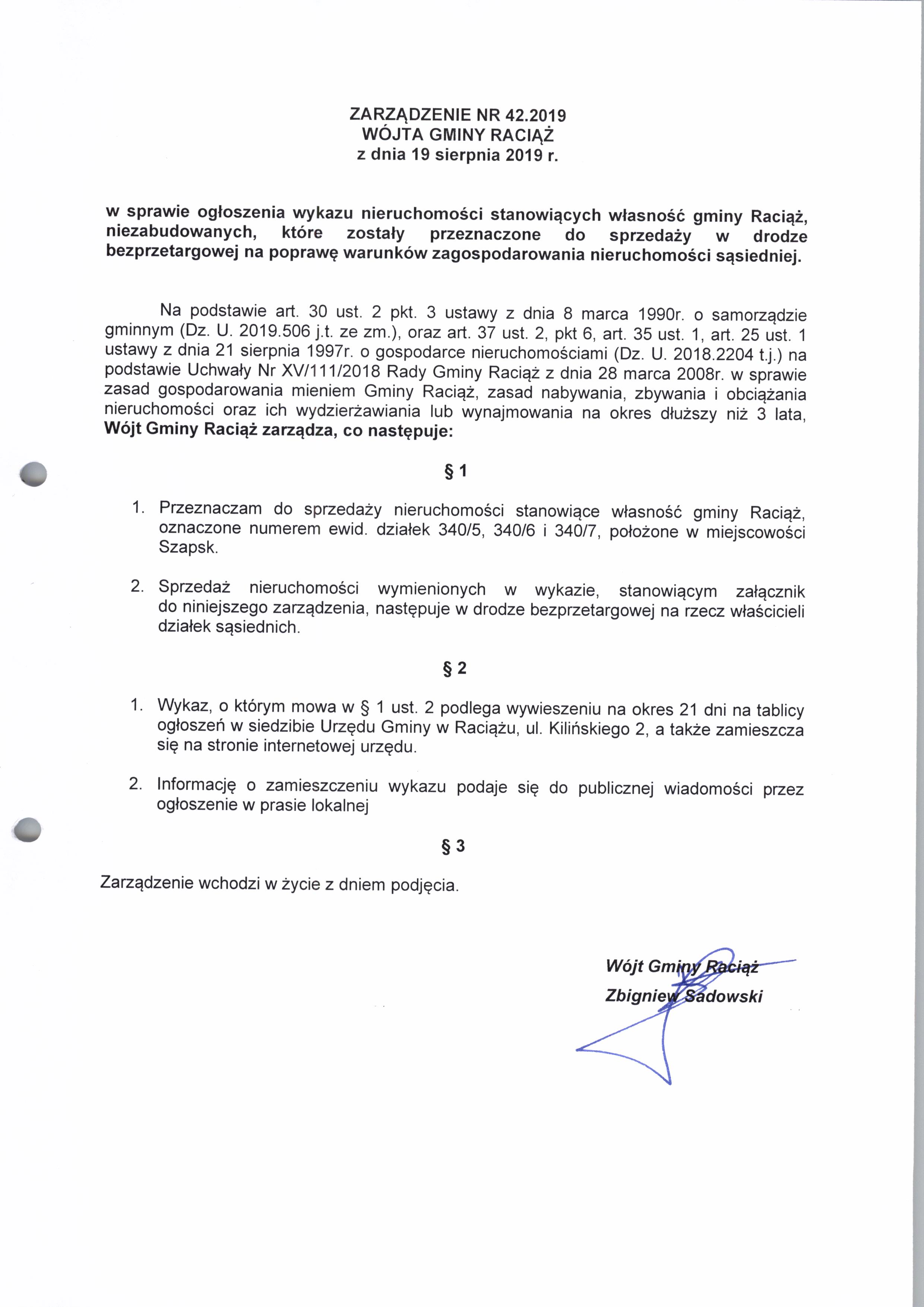 Zarządzenie Nr 42.2019 Wójta Gminy Raciąż z dnia 19 sierpnia 2019 roku