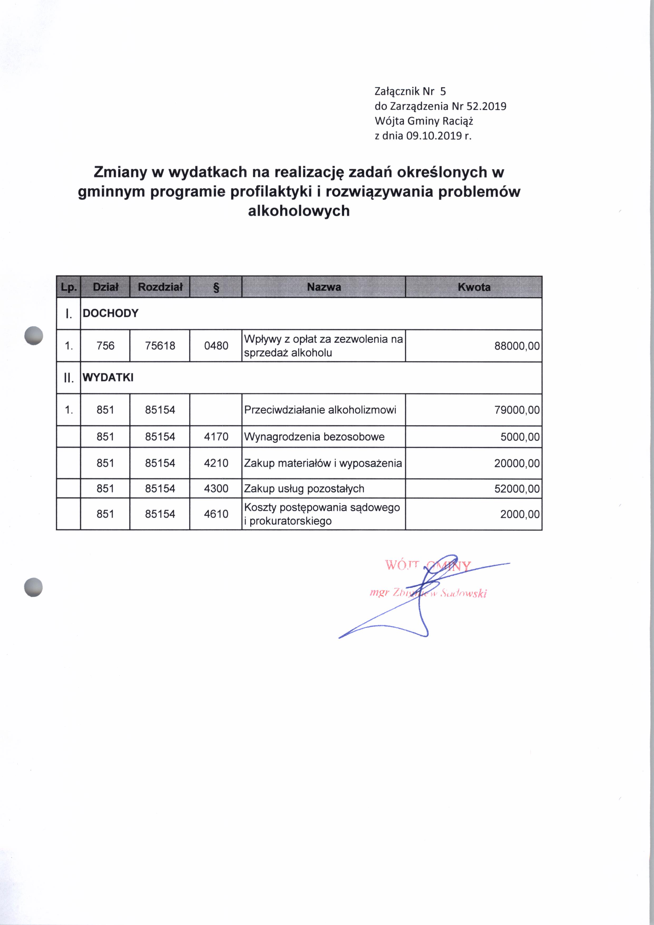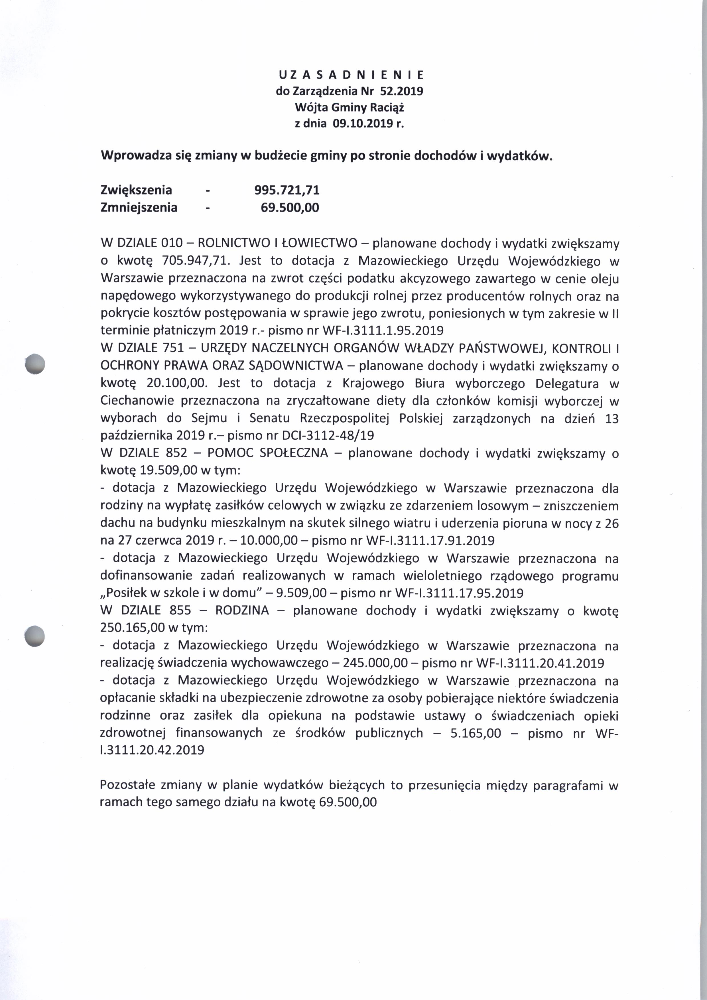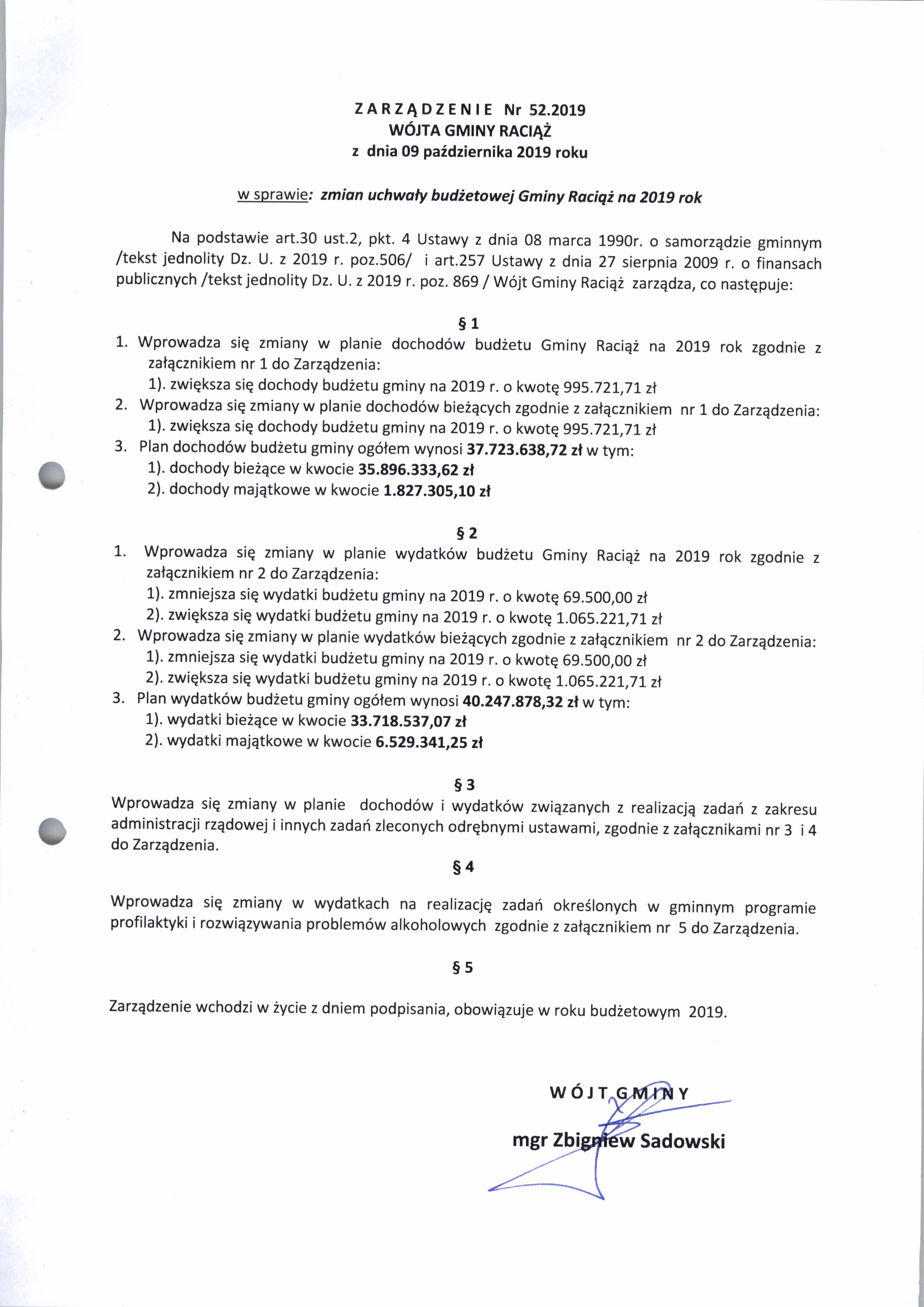 Zarządzenie Nr 52.2019 Wójta Gminy Raciąż z dnia 9 października 2019 roku