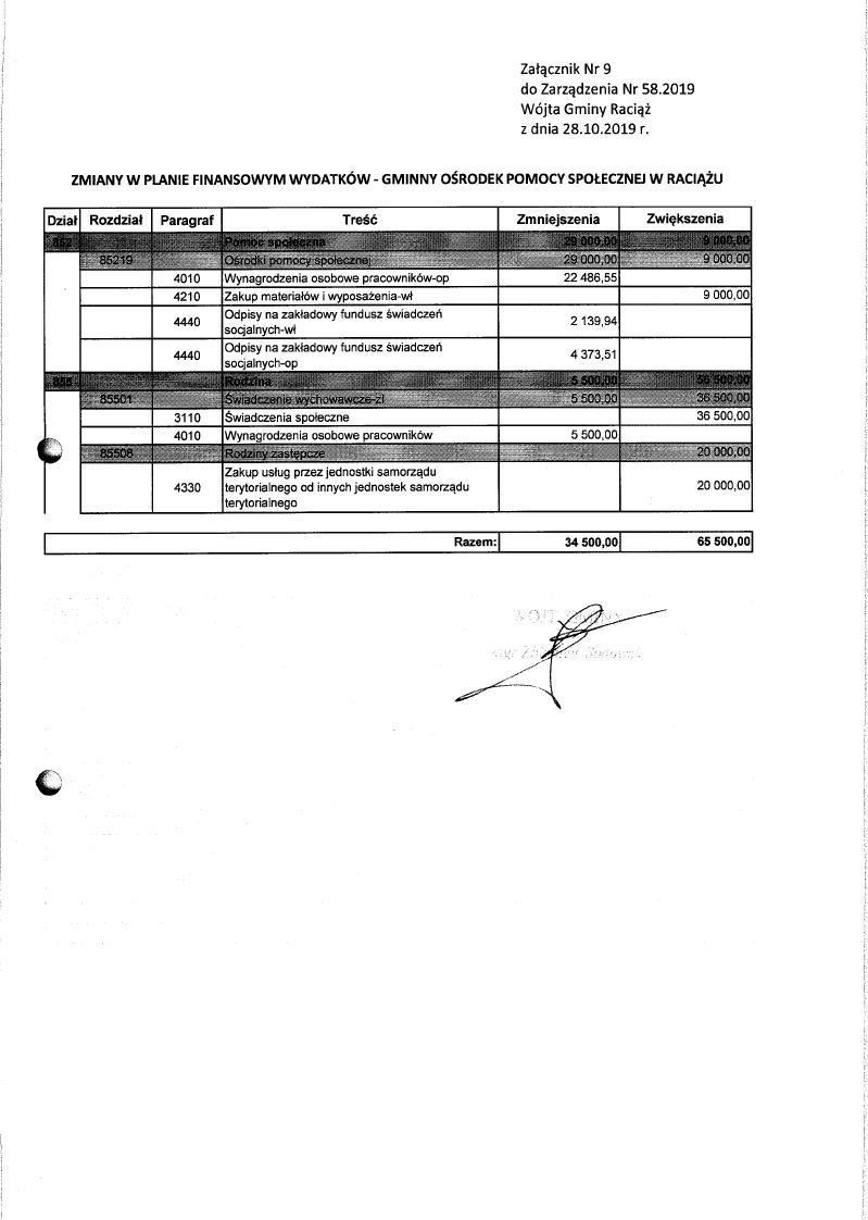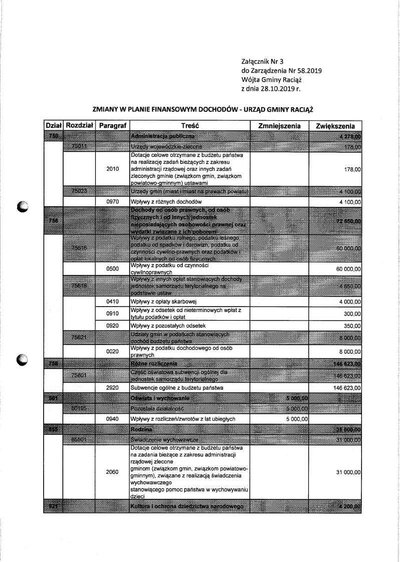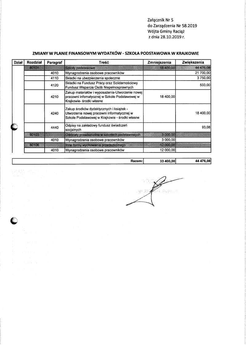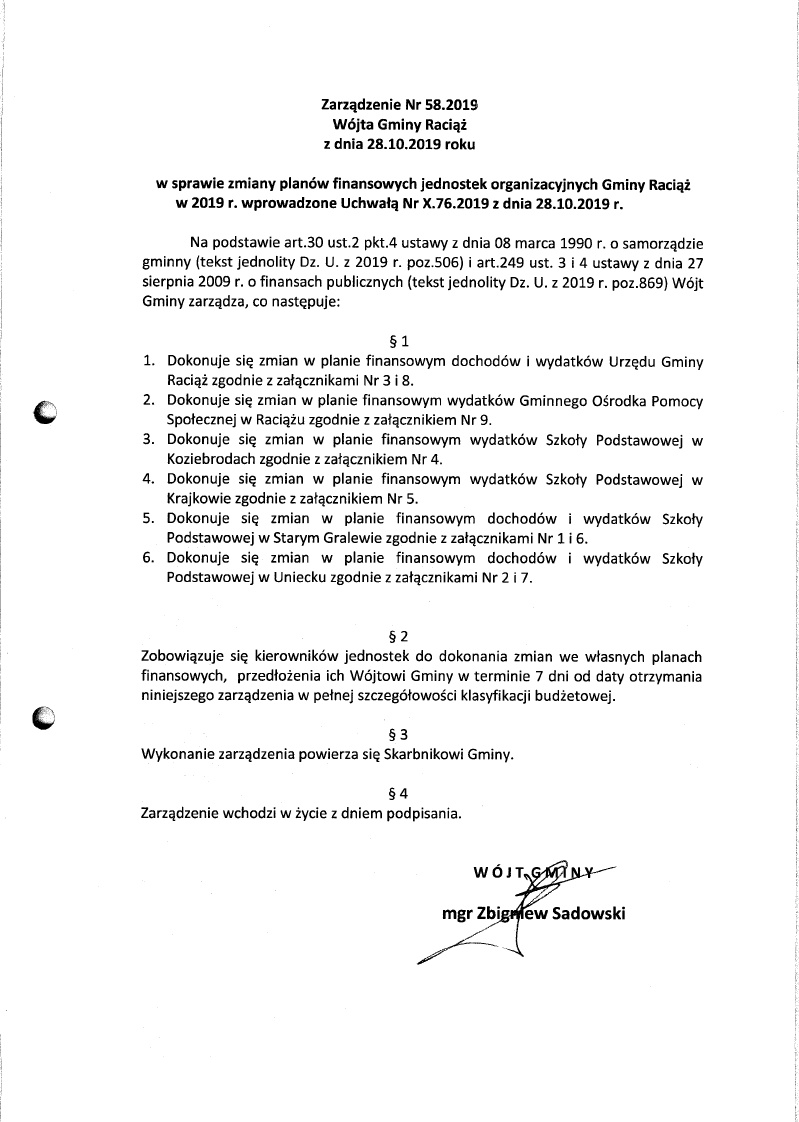 Zarządzenie Nr 58.2019 Wójta Gminy Raciąż z dnia 28 października 2019 roku