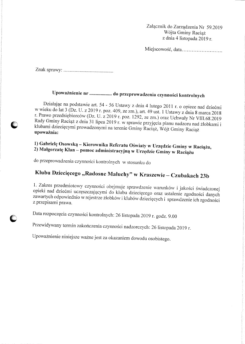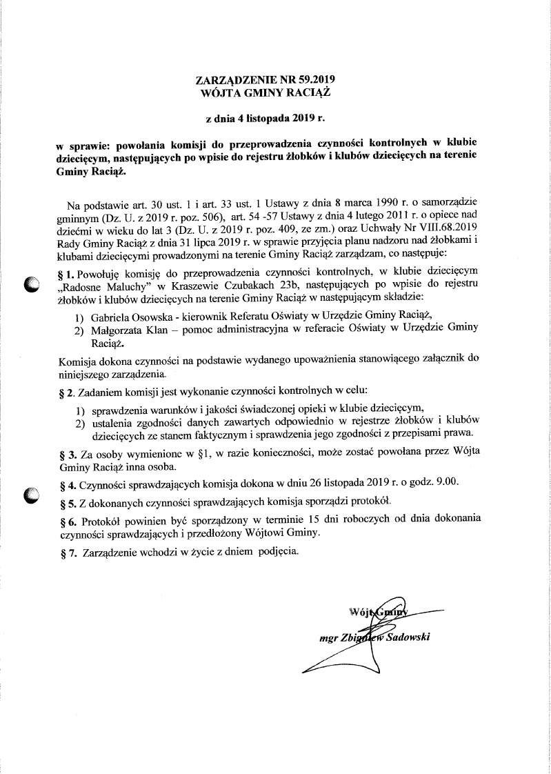 Zarządzenie Nr 59.2019 Wójta Gminy Raciąż z dnia 4 listopada 2019 roku