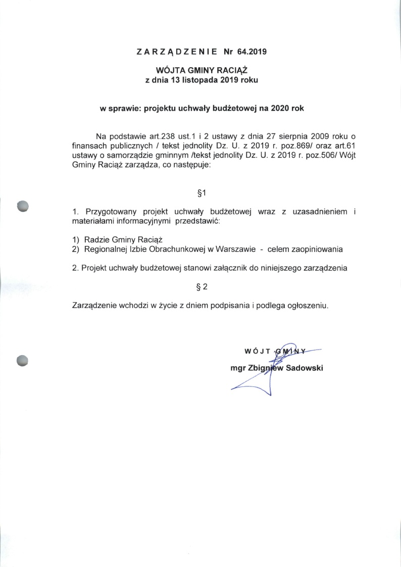 Zarządzenie Nr 64.2019 Wójta Gminy Raciąż z dnia 13 listopada 2019 roku