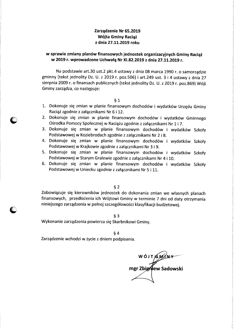 Zarządzenie Nr 65.2019 Wójta Gminy Raciąż z dnia 27 listopada 2019 roku