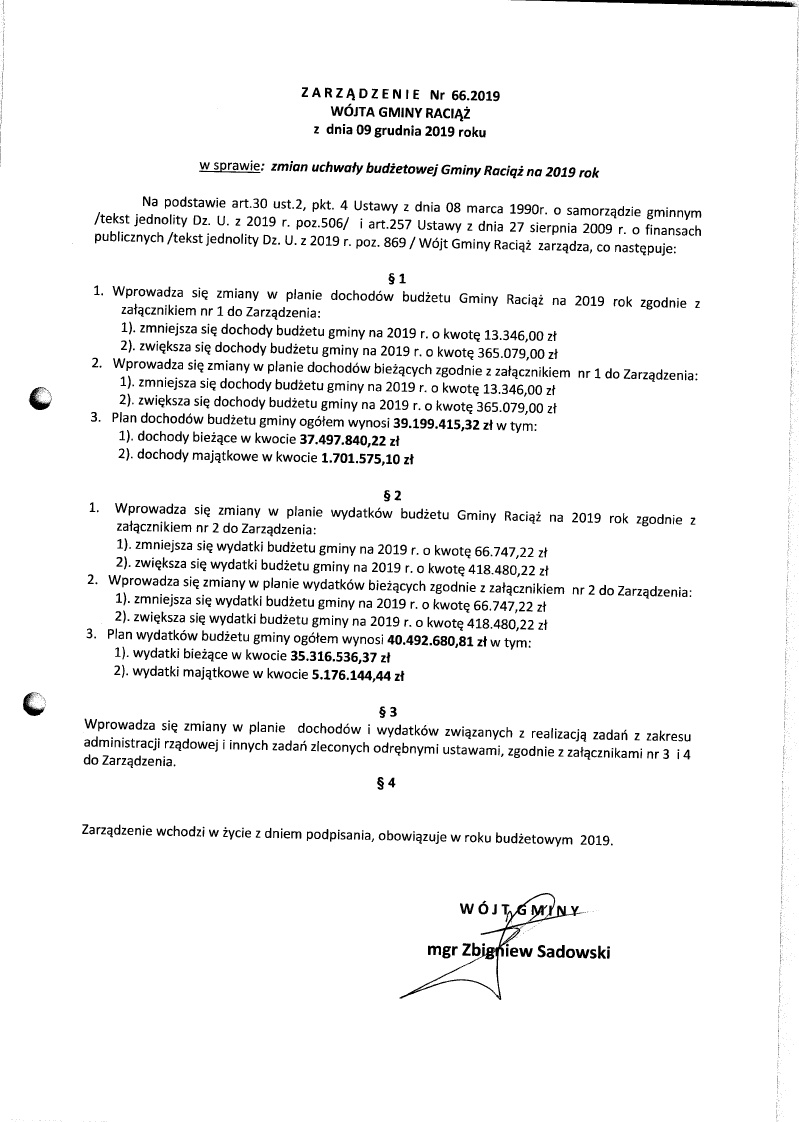Zarządzenie Nr 66.2019 Wójta Gminy Raciąż z dnia 9 grudnia 2019 roku