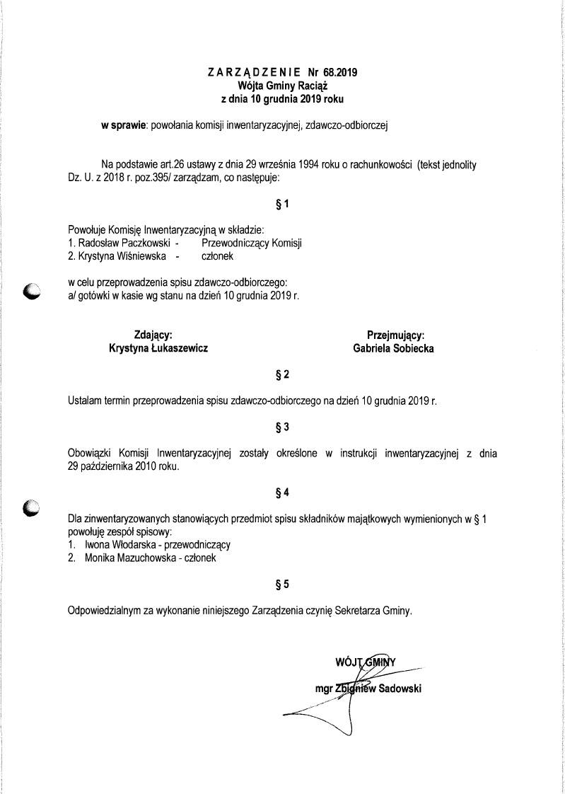 Zarządzenie Nr 68.2019 Wójta Gminy Raciąż z dnia 10 grudnia 2019 roku