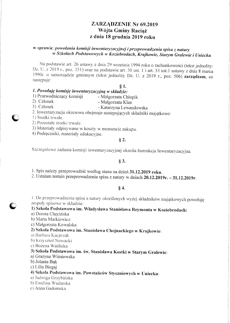 Zarządzenie Nr 69.2019 Wójta Gminy Raciąż z dnia 18 grudnia 2019 roku
