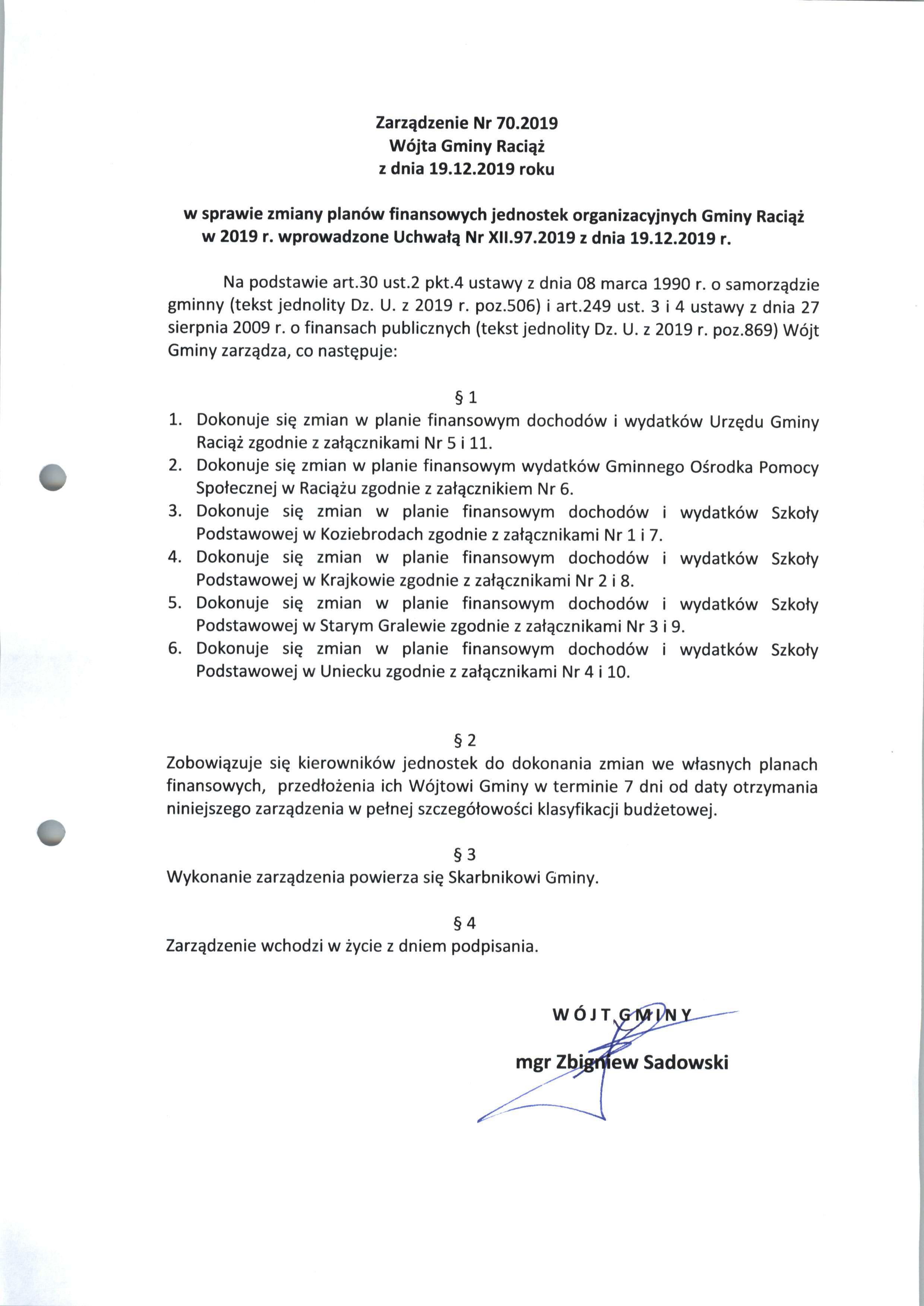 Zarządzenie Nr 70.2019 Wójta Gminy Raciąż z dnia 19 grudnia 2019 roku - Zarządzenia Wójta Gminy 2019 rok - Bip Gmina Raciąż