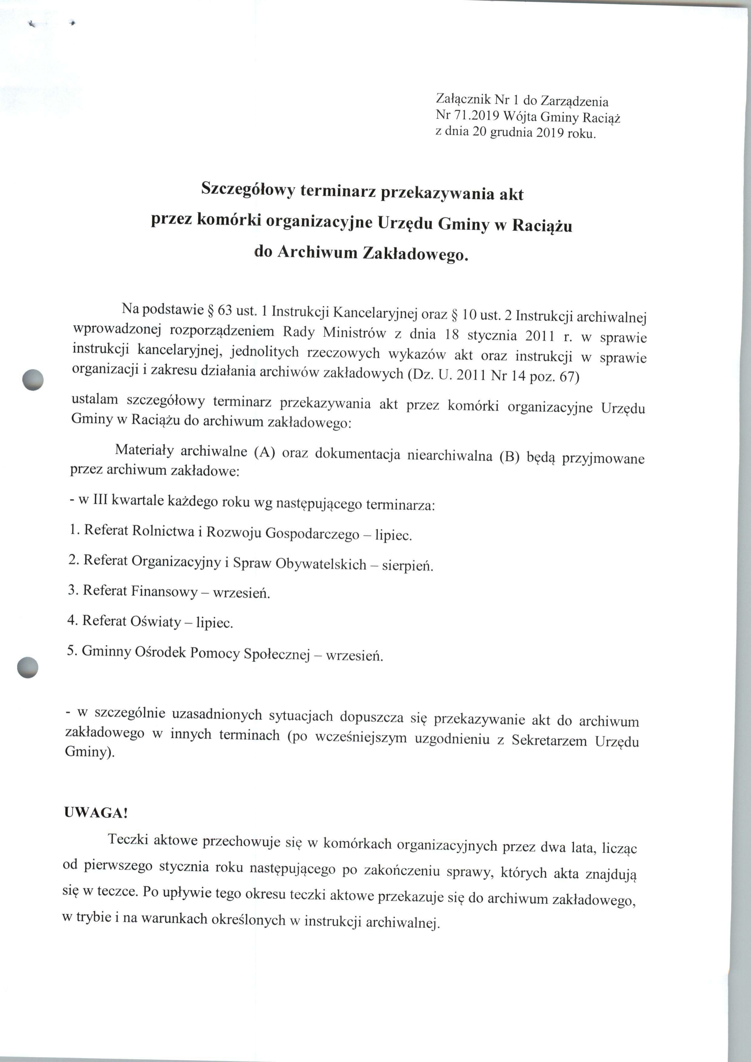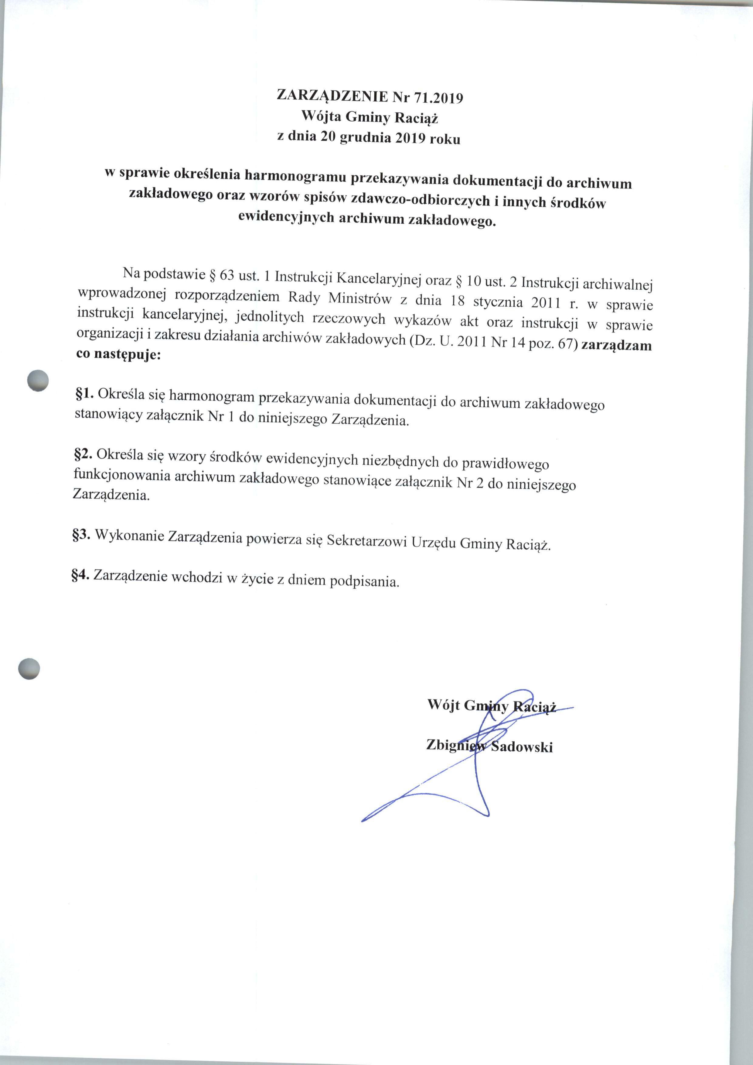 Zarządzenie Nr 71.2019 Wójta Gminy Raciąż z dnia 20 grudnia 2019 roku