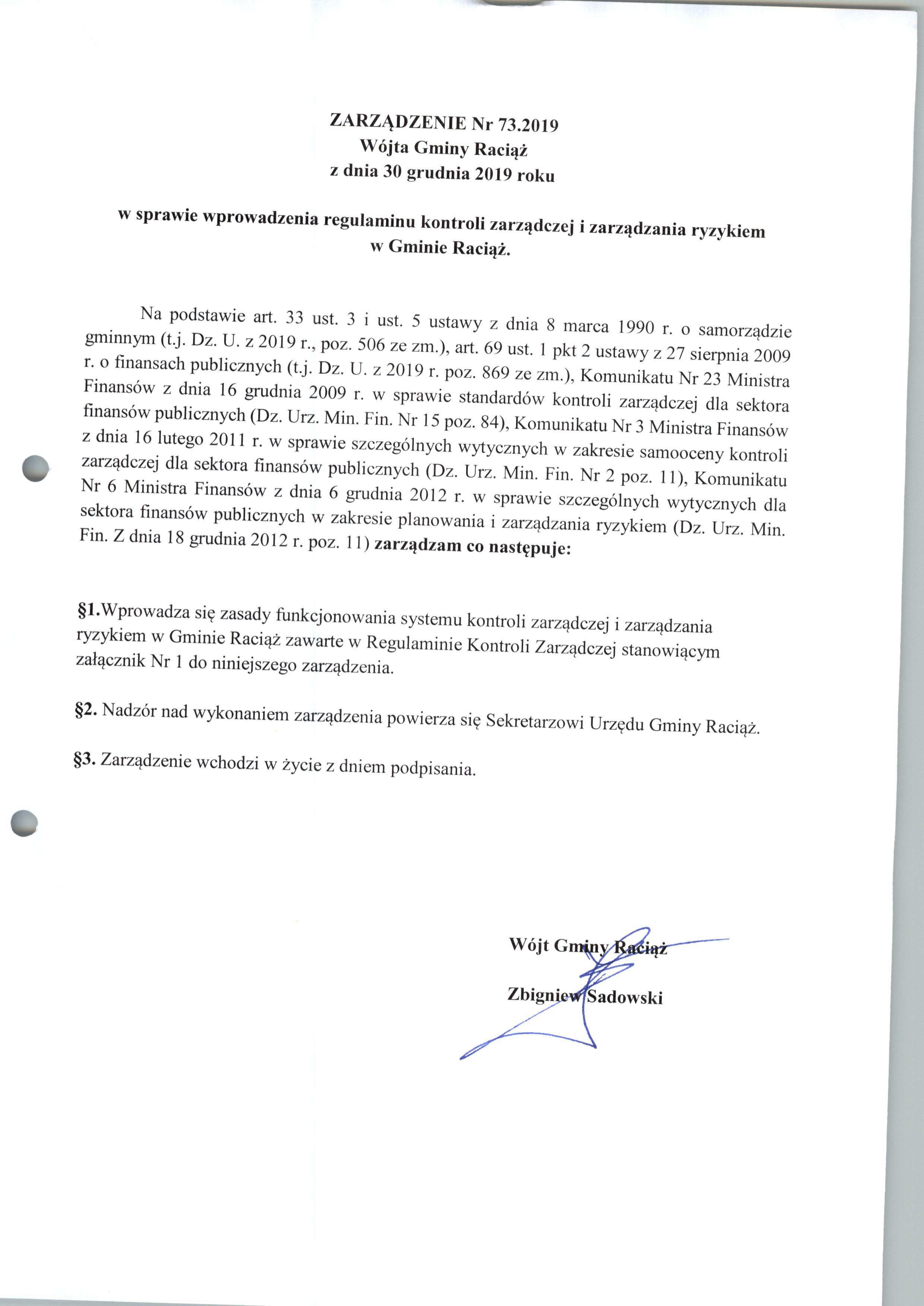 Zarządzenie Nr 73.2019 Wójta Gminy Raciąż z dnia 30 grudnia 2019 roku