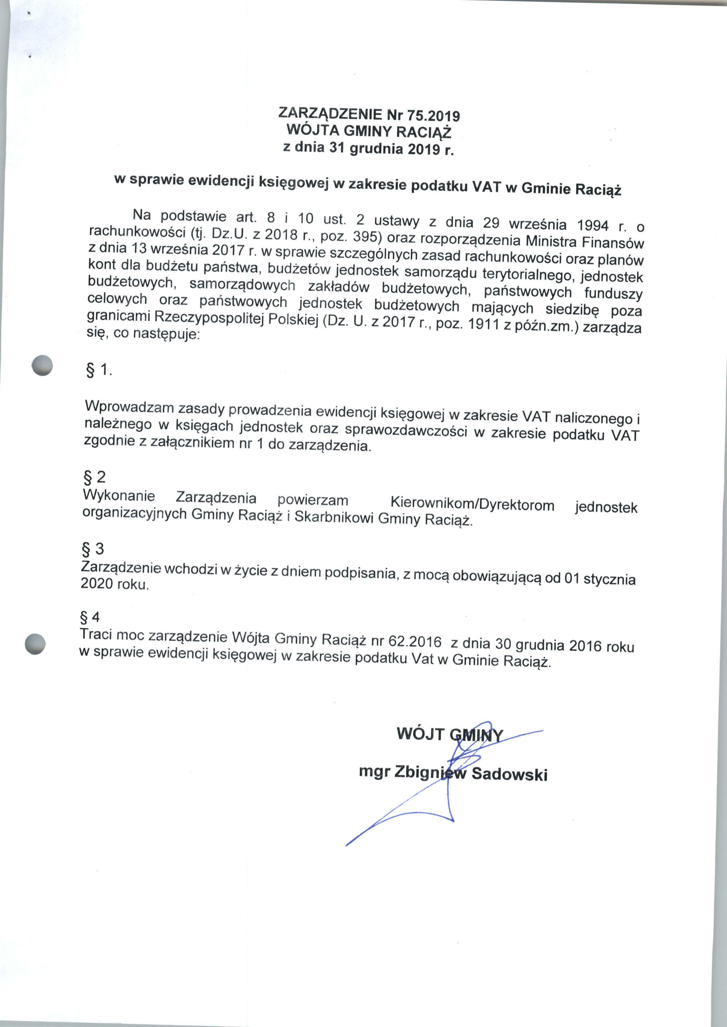 Zarządzenie Nr 75.2019 Wójta Gminy Raciąż z dnia 31 grudnia 2019 roku