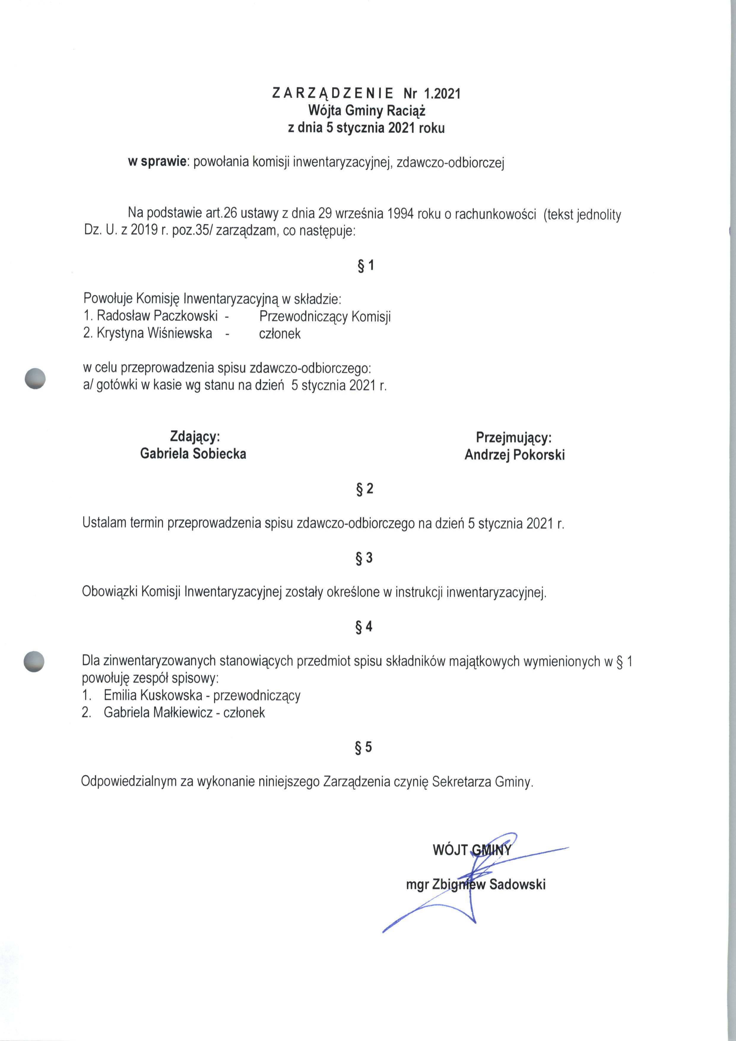 Zarządzenie Nr 1.2021 Wójta Gminy Raciąż z dnia 5 stycznia 2021 roku