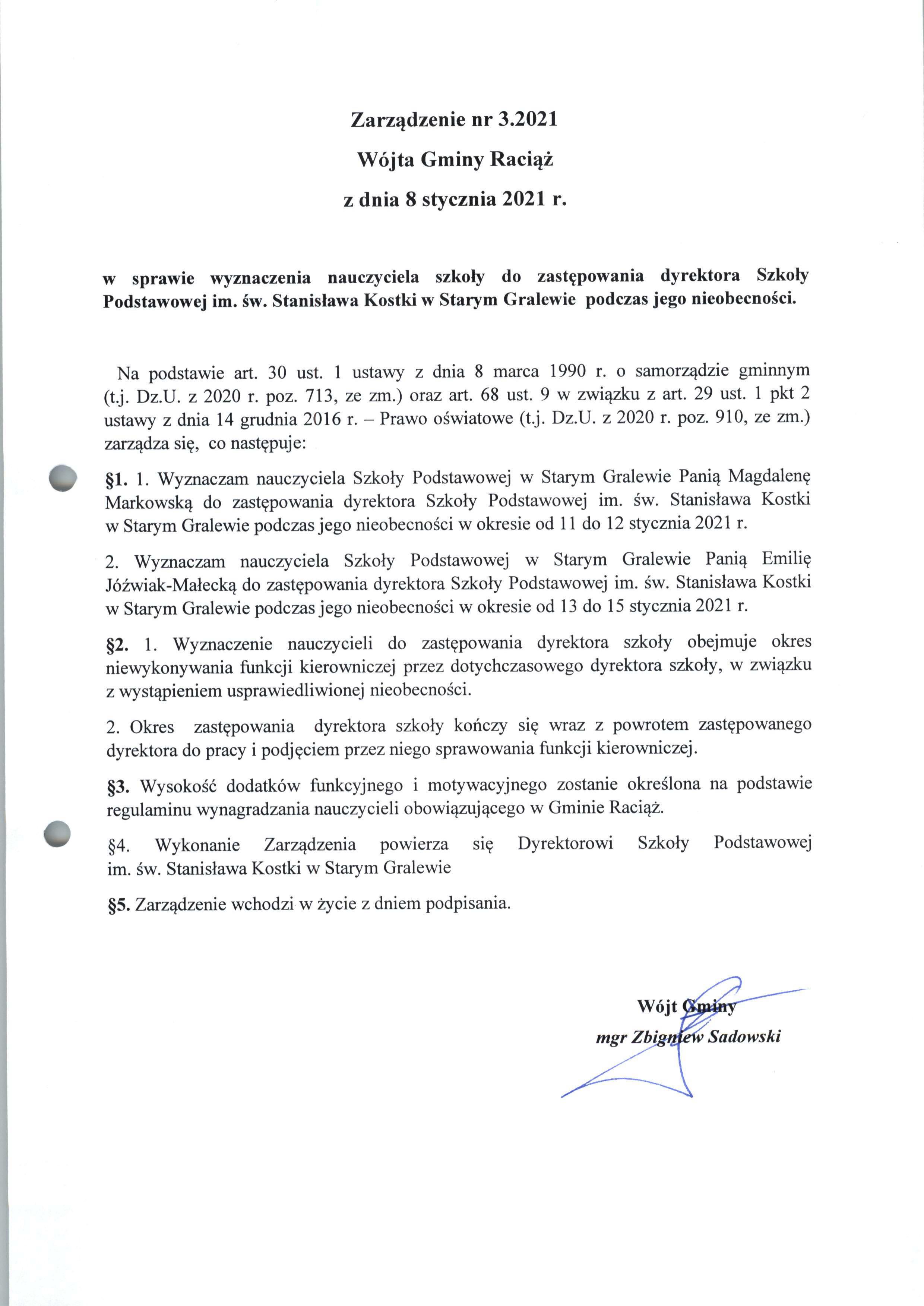 Zarządzenie Nr 3.2021 Wójta Gminy Raciąż z dnia 8 stycznia 2021 roku