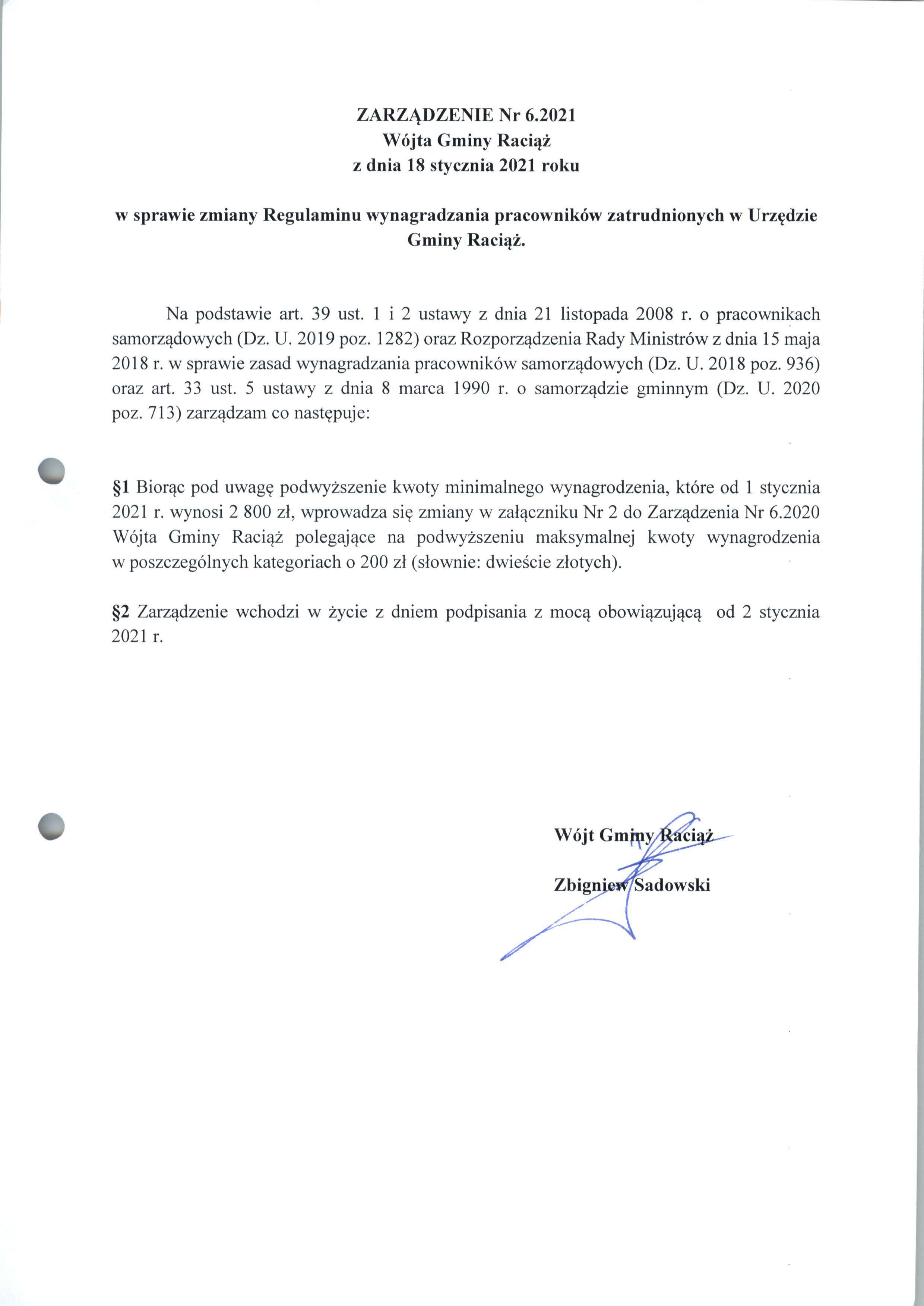 Zarządzenie Nr 6.2021 Wójta Gminy Raciąż z dnia 18 stycznia 2021 roku