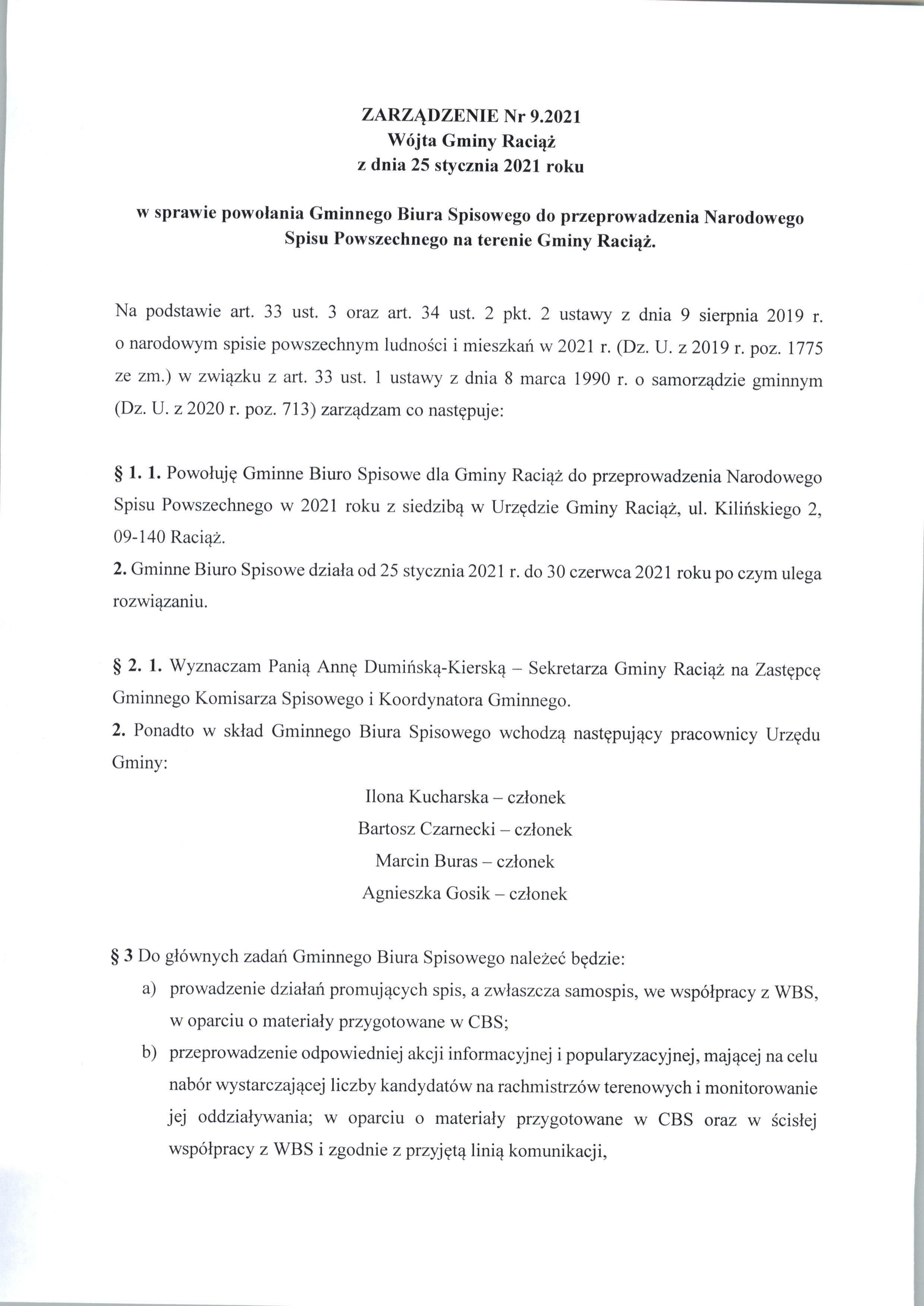 Zarządzenie Nr 9.2021 Wójta Gminy Raciąż z dnia 25 stycznia 2021 roku