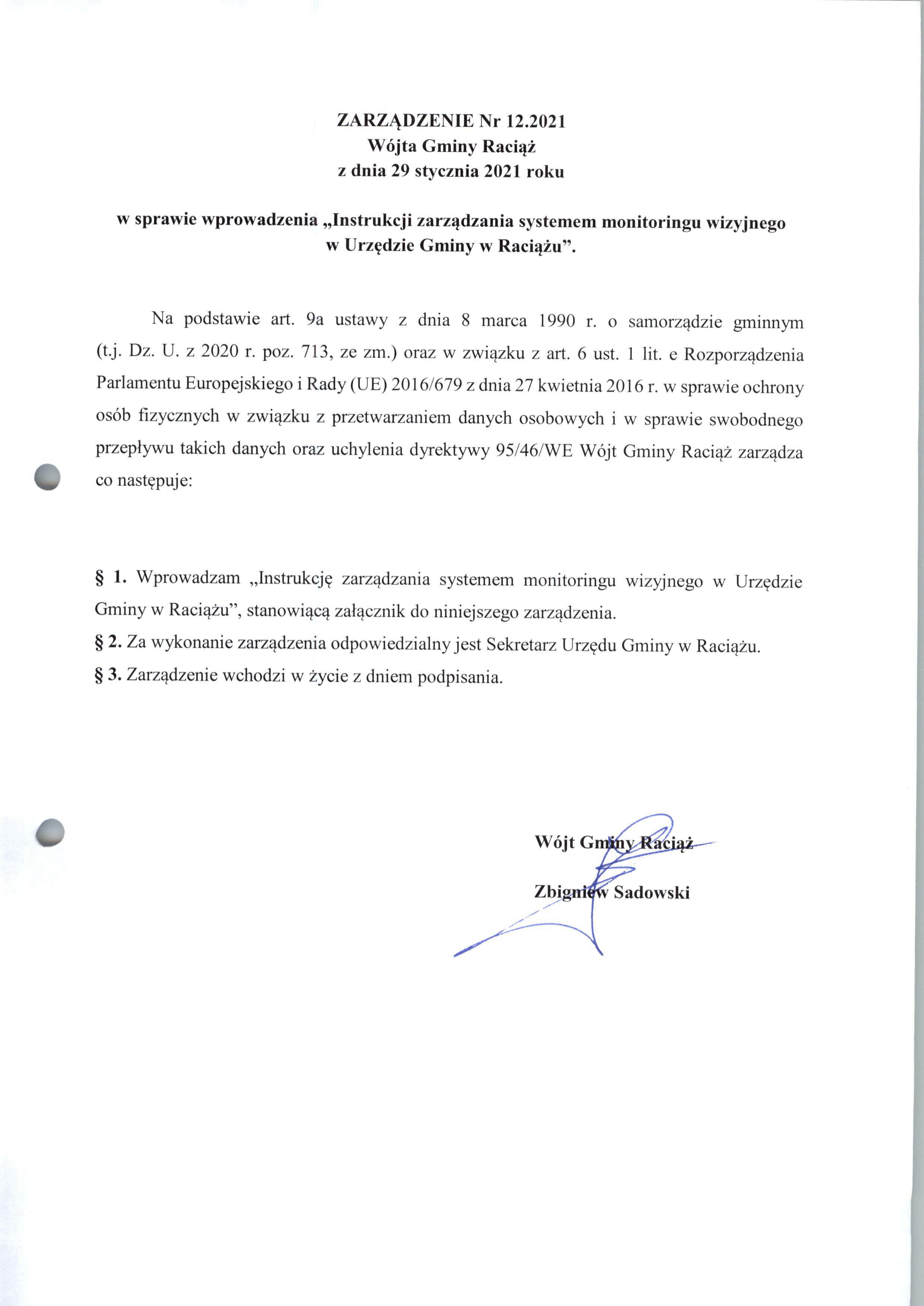 Zarządzenie Nr 12.2021 Wójta Gminy Raciąż z dnia 29 stycznia 2021 roku