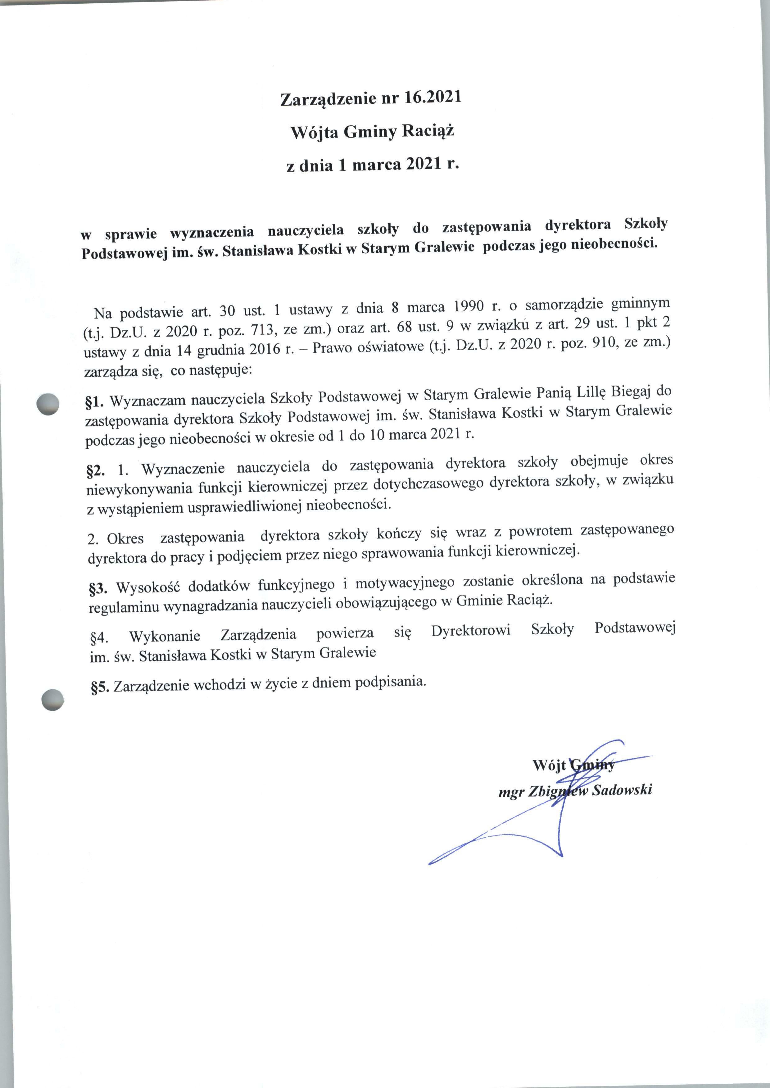 Zarządzenie Nr 16.2021 Wójta Gminy Raciąż z dnia 1 marca 2021 roku