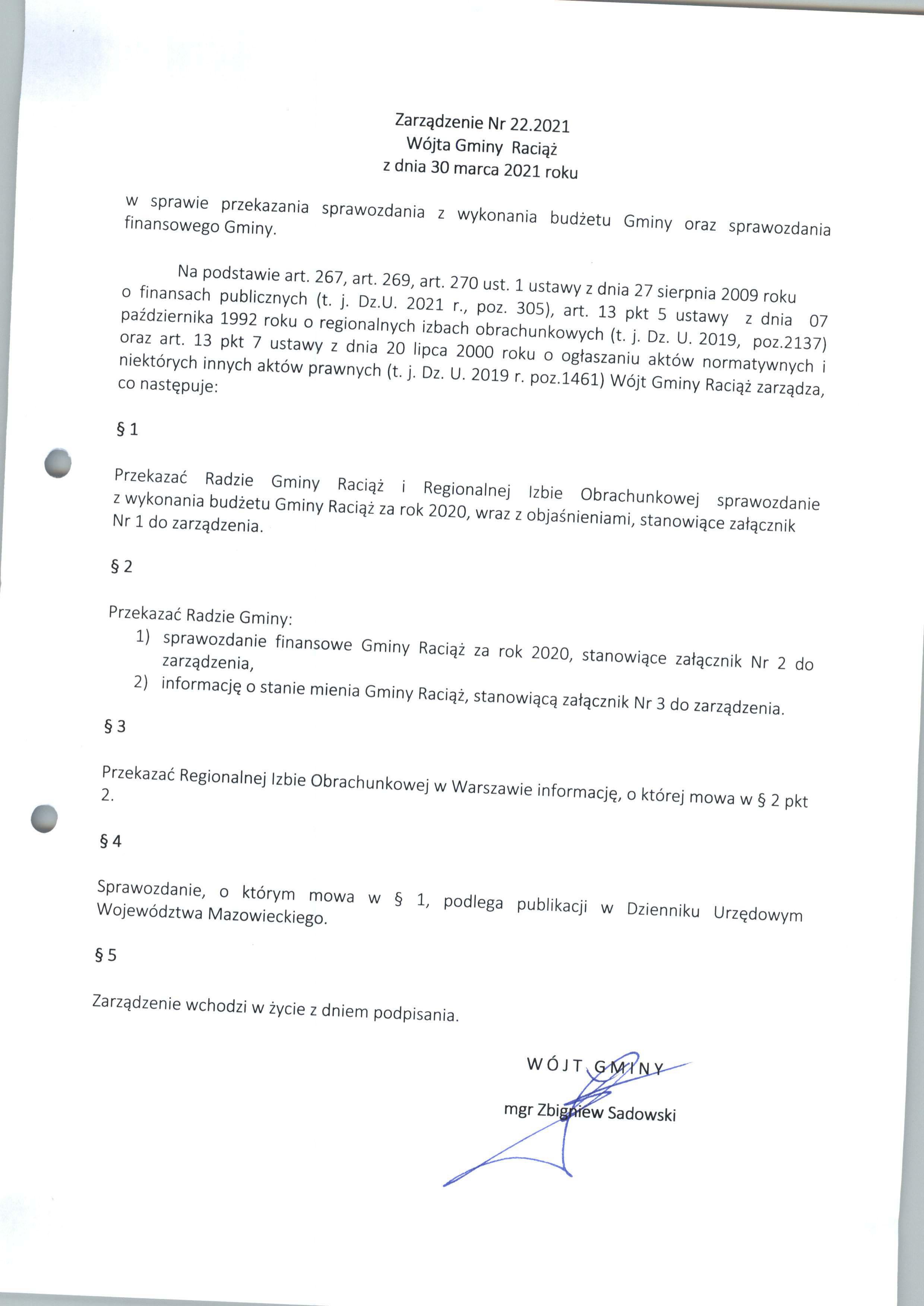 Zarządzenie Nr 22.2021 Wójta Gminy Raciąż z dnia 30 marca 2021 roku