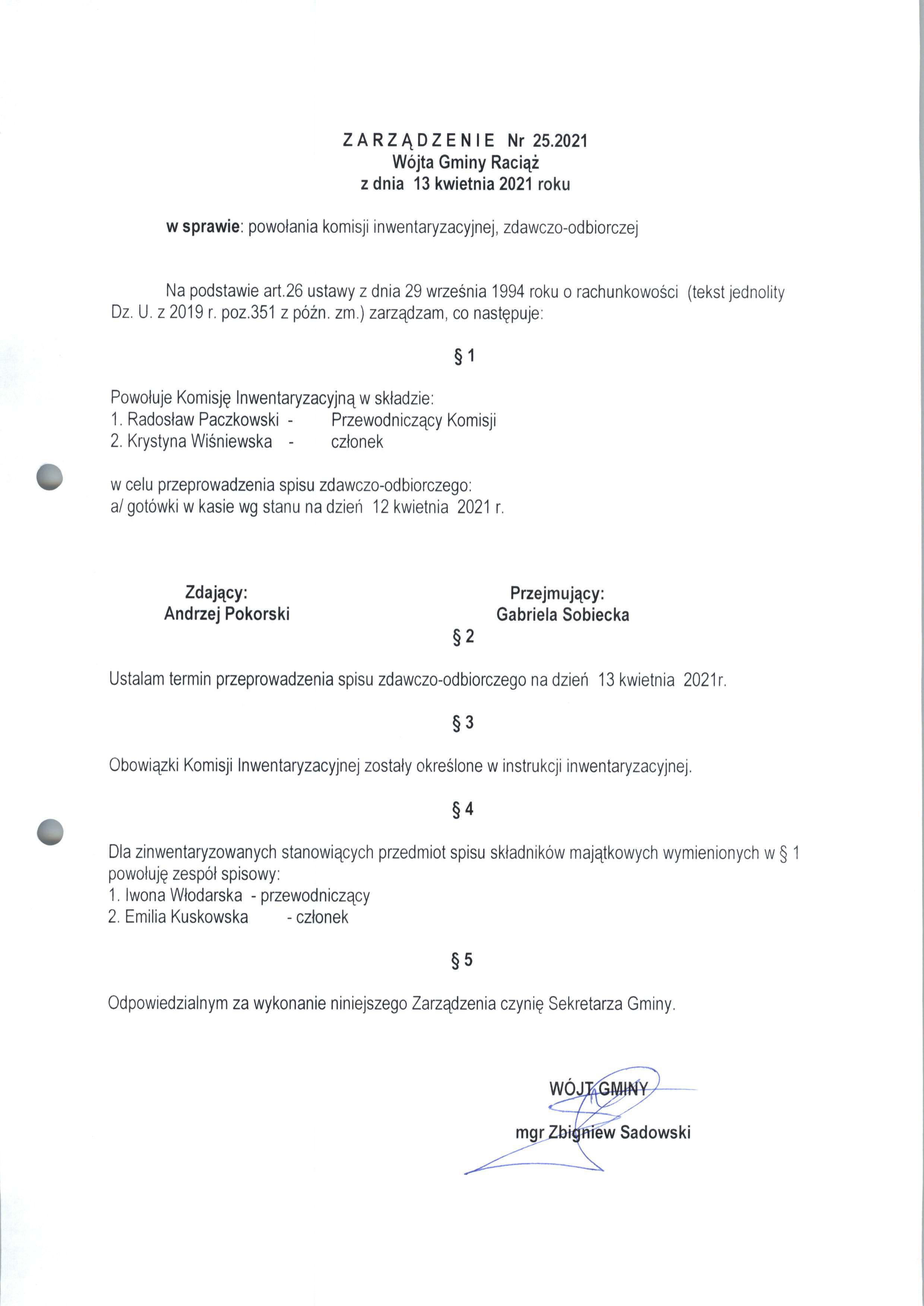 Zarządzenie Nr 25.2021 Wójta Gminy Raciąż z dnia 13 kwietnia 2021 roku