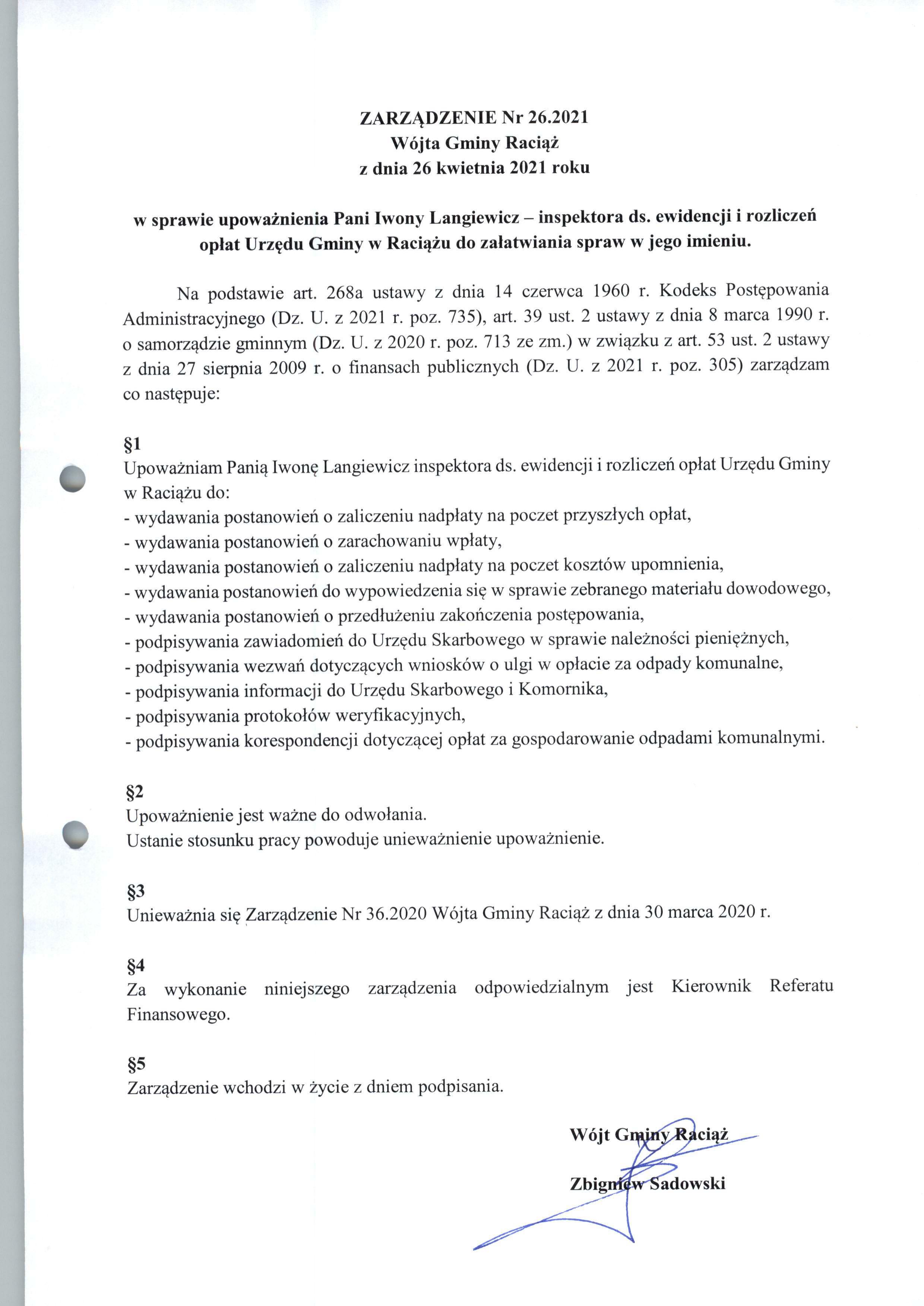 Zarządzenie Nr 26.2021 Wójta Gminy Raciąż z dnia 26 kwietnia 2021 roku
