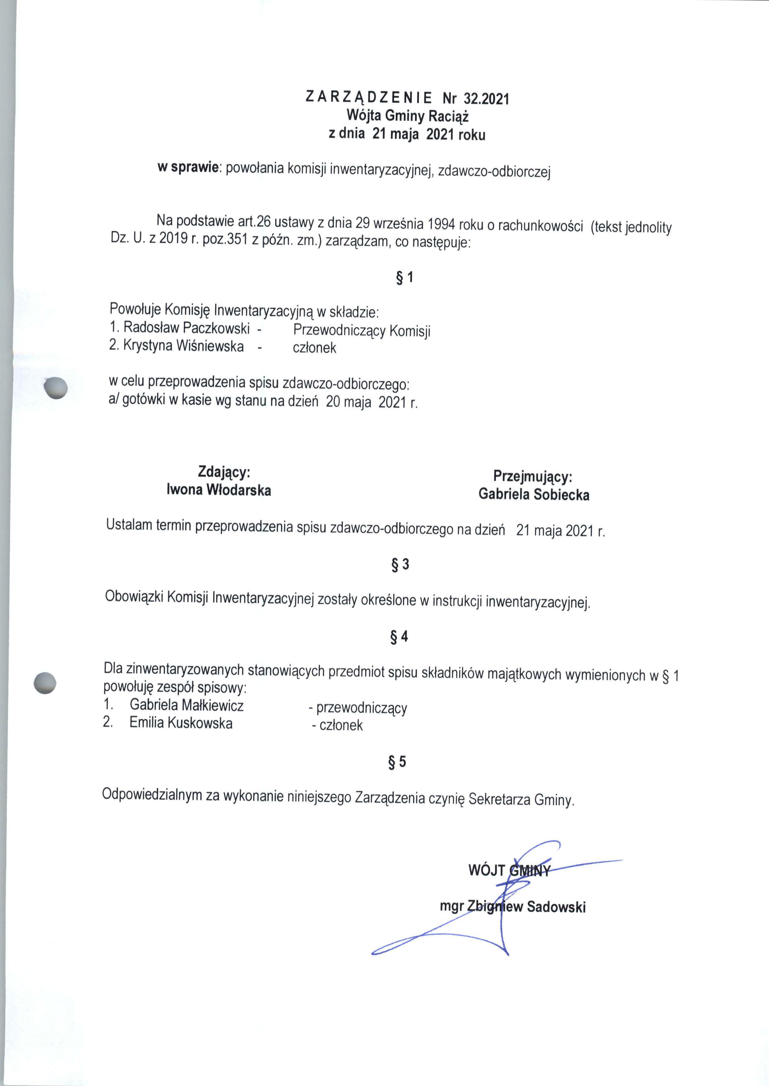 Zarządzenie Nr 32.2021 Wójta Gminy Raciąż z dnia 21 maja 2021 roku