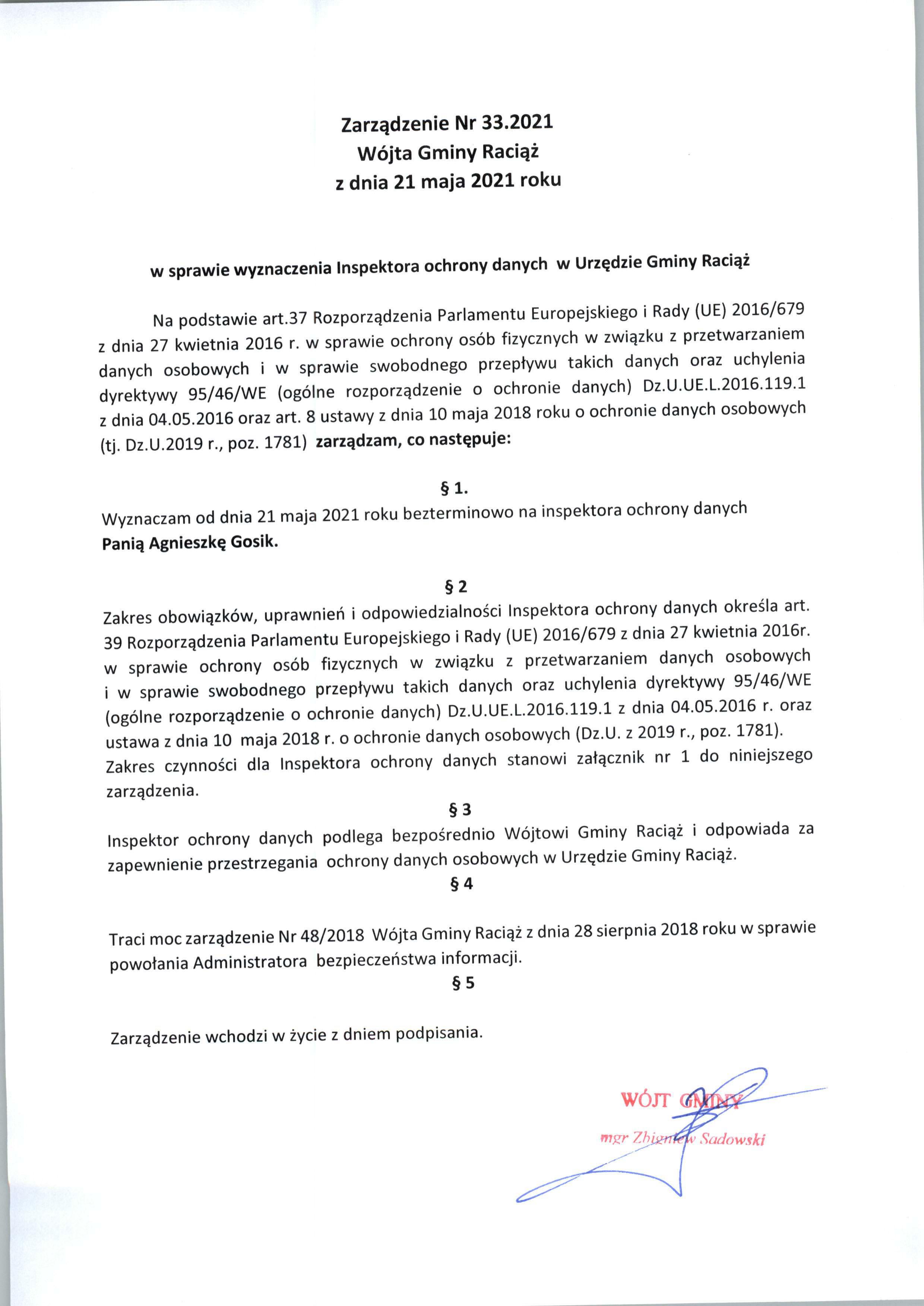Zarządzenie Nr 33.2021 Wójta Gminy Raciąż z dnia 21 maja 2021 roku