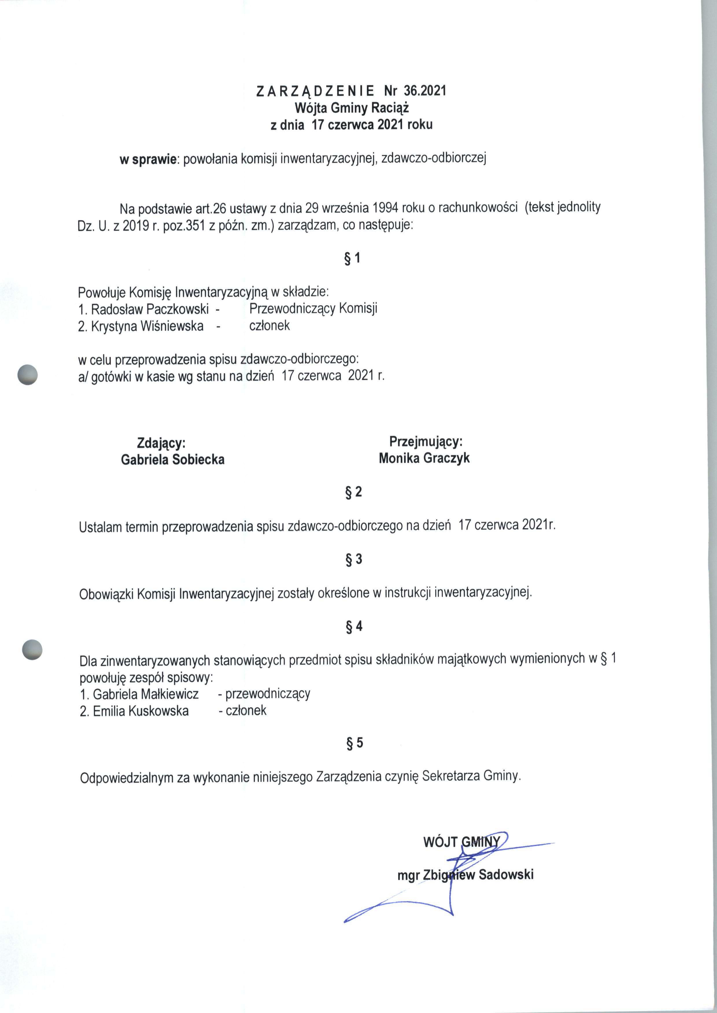 Zarządzenie Nr 36.2021 Wójta Gminy Raciąż z dnia 17 czerwca 2021 roku