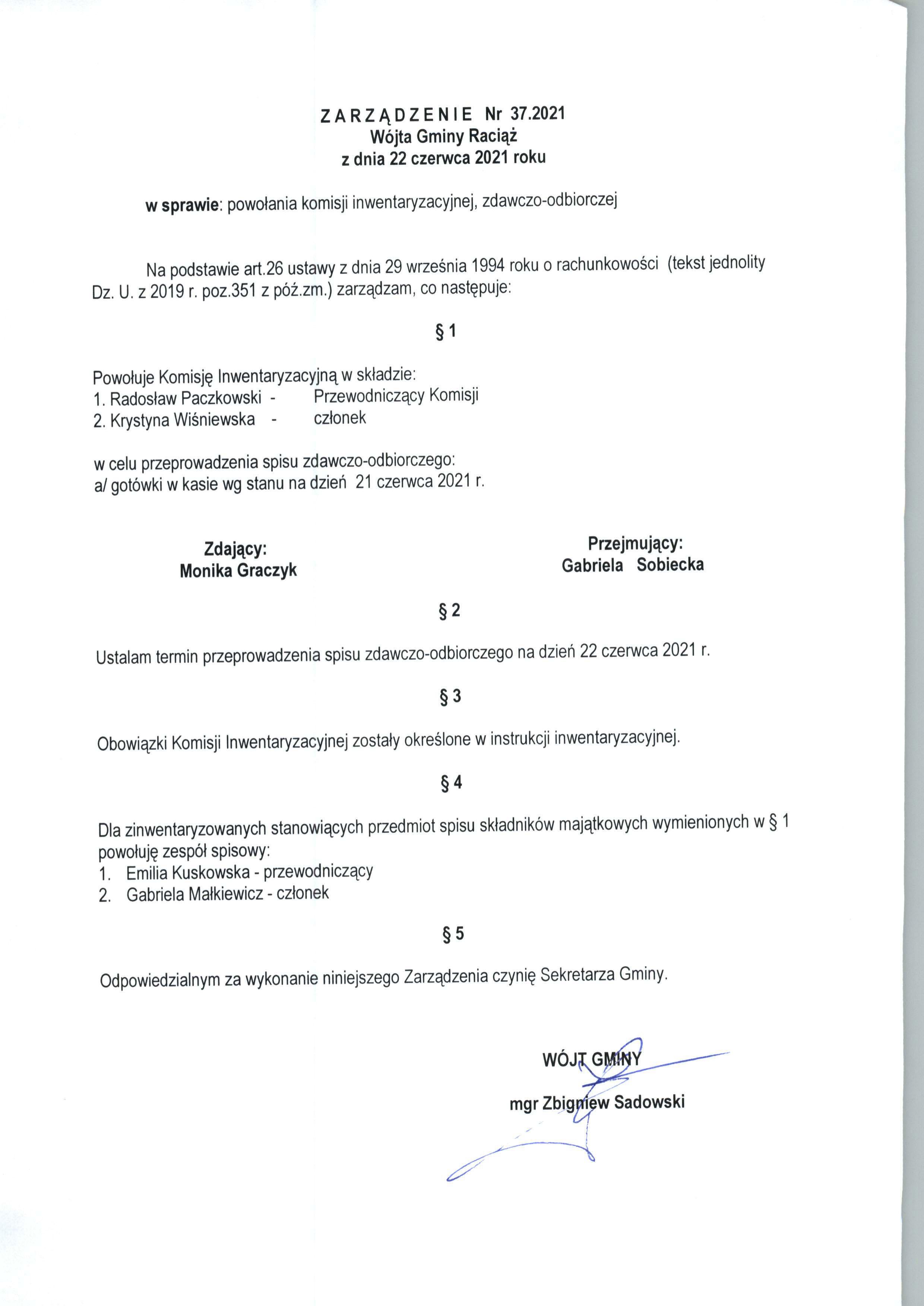 Zarządzenie Nr 37.2021 Wójta Gminy Raciąż z dnia 22 czerwca 2021 roku