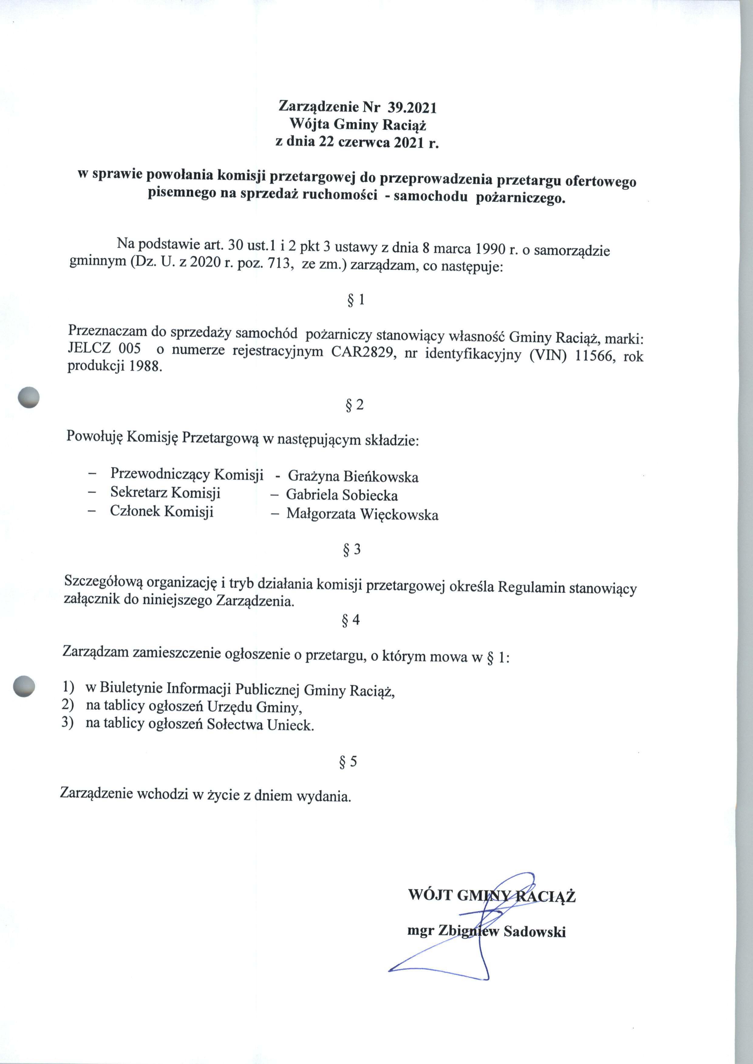 Zarządzenie Nr 39.2021 Wójta Gminy Raciąż z dnia 22 czerwca 2021 roku