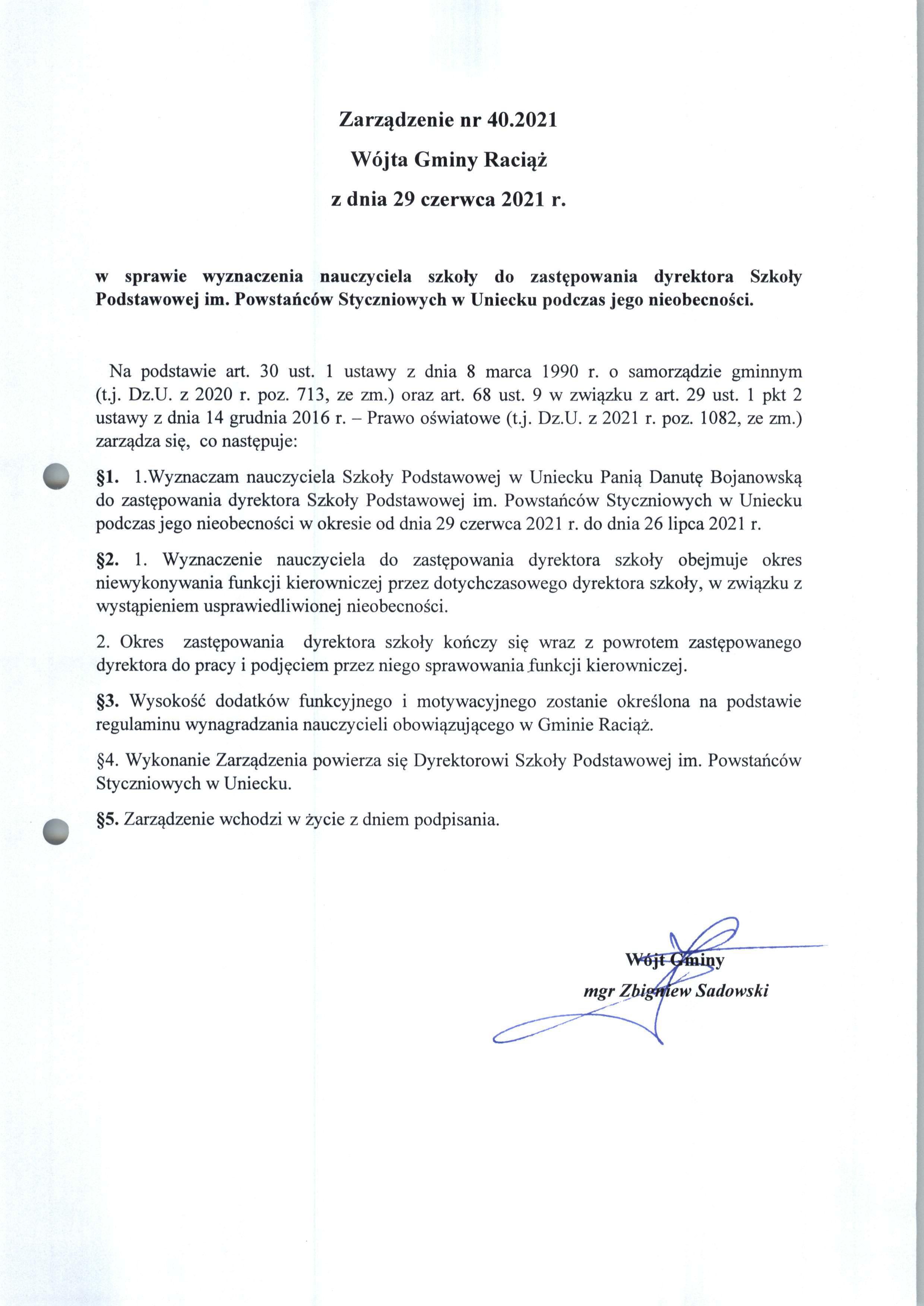 Zarządzenie Nr 40.2021 Wójta Gminy Raciąż z dnia 29 czerwca 2021 roku