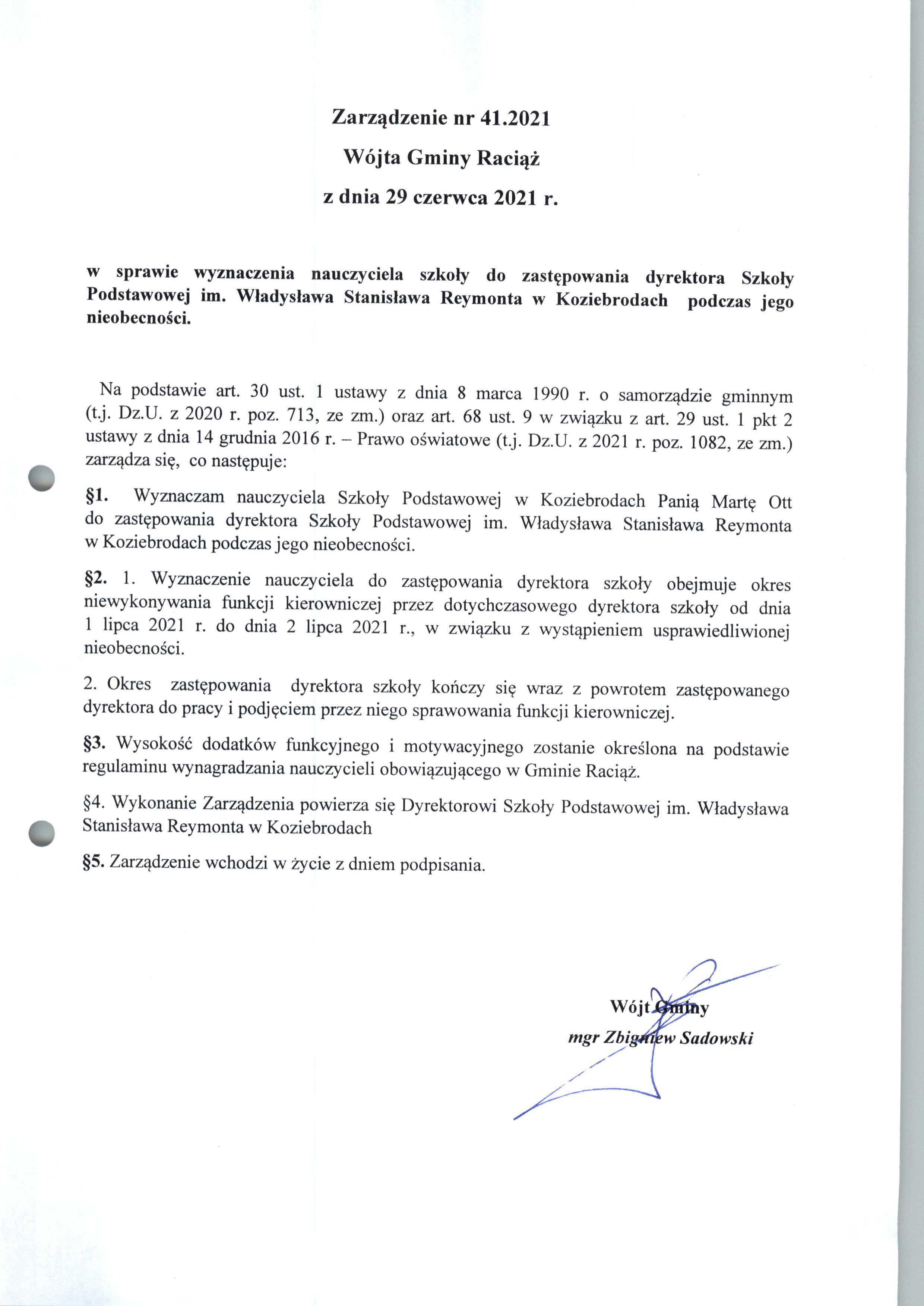 Zarządzenie Nr 41.2021 Wójta Gminy Raciąż z dnia 29 czerwca 2021 roku