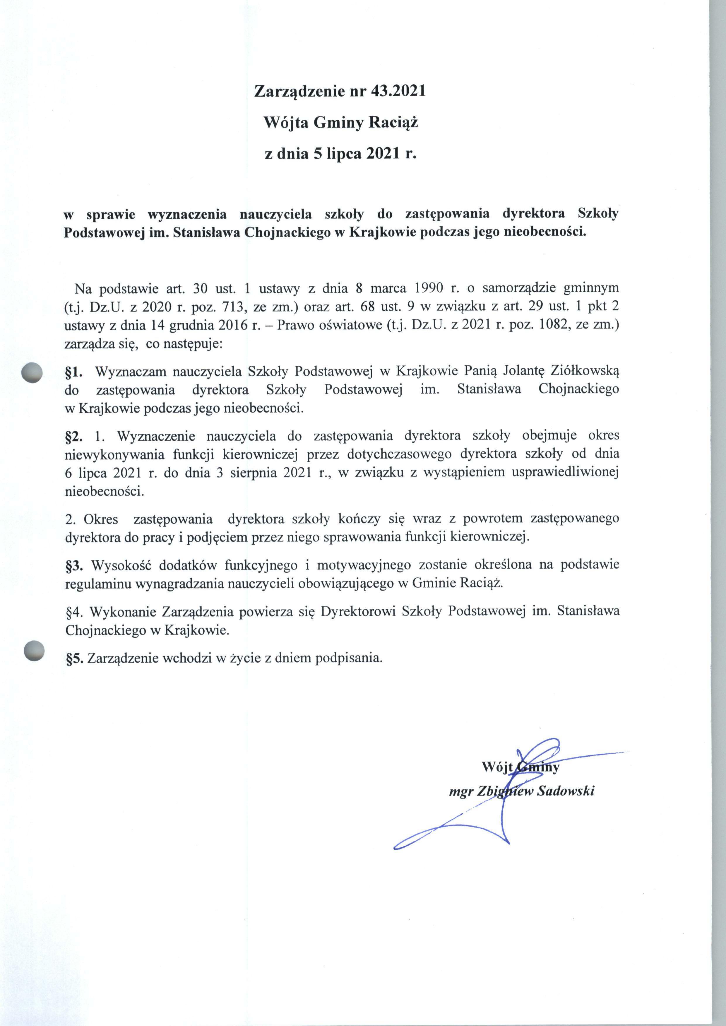 Zarządzenie Nr 43.2021 Wójta Gminy Raciąż z dnia 5 lipca 2021 roku